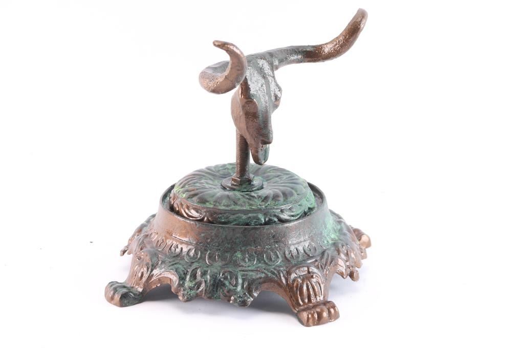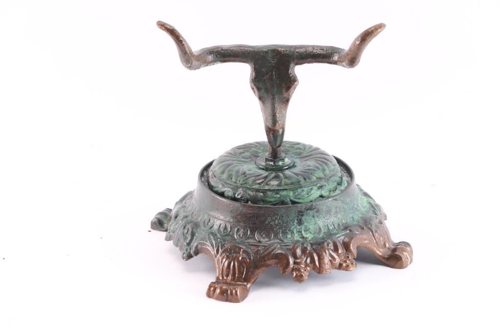 Fashioned out of a Victorian lamp base with green patina. Measures 10" x 7".