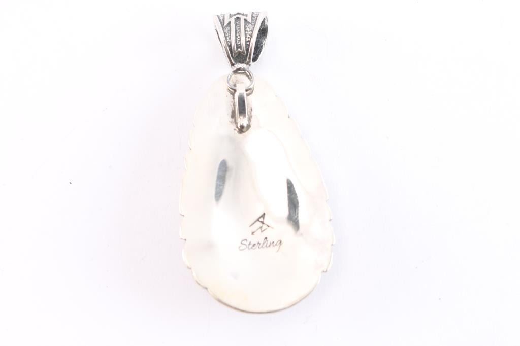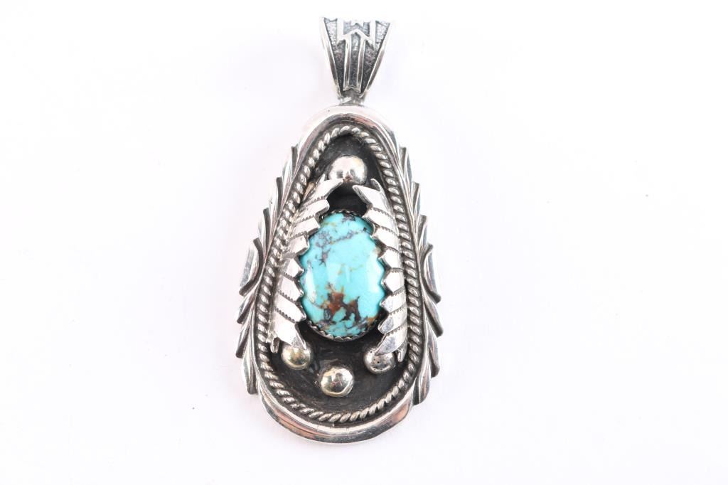 This Navajo Kingman Turquoise Silver Pendant features a natural Arizona stone that displays wonderful, blue color and matrix! It's hugged in place by Sterling fans, accented with drops and twist wire. Set on a antiqued background, it's finished with a carved border. It comes with a silver-tone bead necklace, that you can upgrade to Sterling for an additional fee. About 2-1/2" long, (includes 7mm bail) and 1-3/8" wide. Made in our Native American jewelry shop by Ronnie Lee, it's stamped Sterling and hallmarked.
