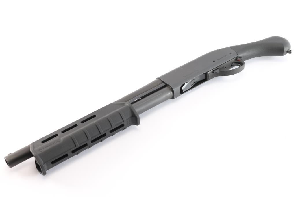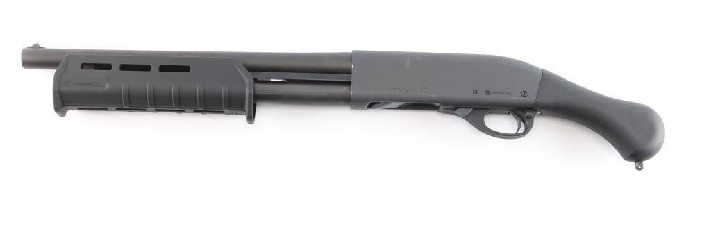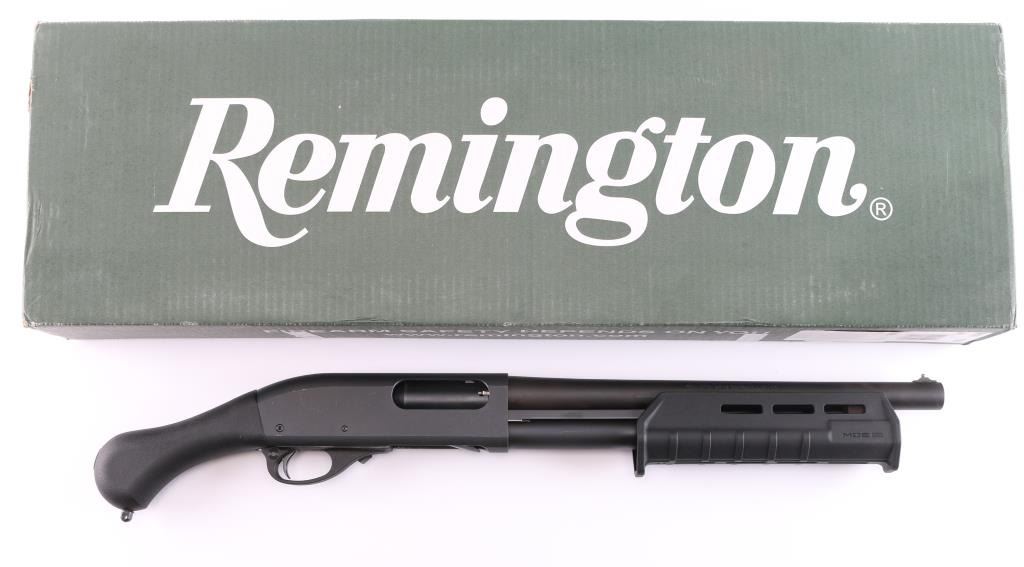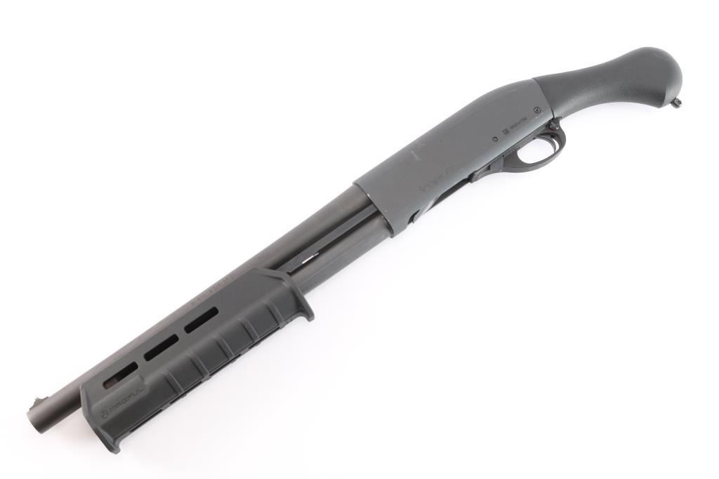 Remington Tac-14 Black Oxide 12 Gauge Pump Action home defense shotgun. capability. Featuring a 14" barrel with metal sighting bead, matte black finish, 3" chamber, duel action bars, push-button safety, fixed CYL choke, Raptor pistol grip with sling swivel stud and Magpul M-Lock forend. Bore is excellent/bright, action is smooth, furniture is excellent and the finish has some minor scratches/rubs. Comes in factory box with matching label, lock and manual.
