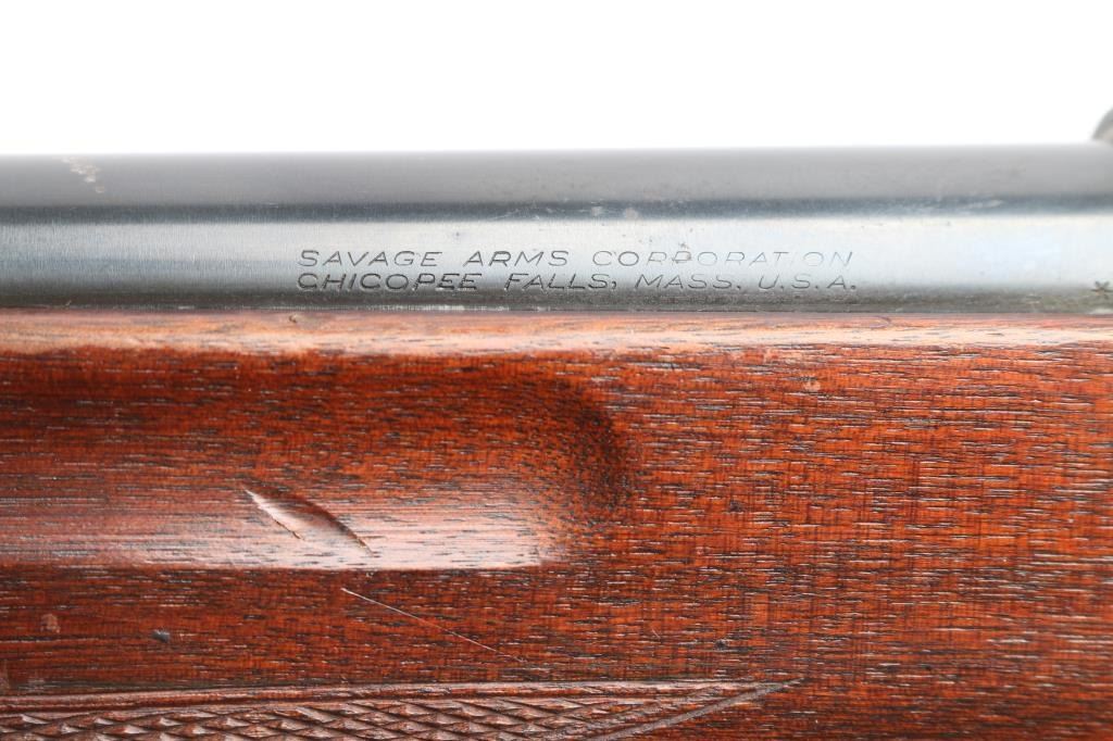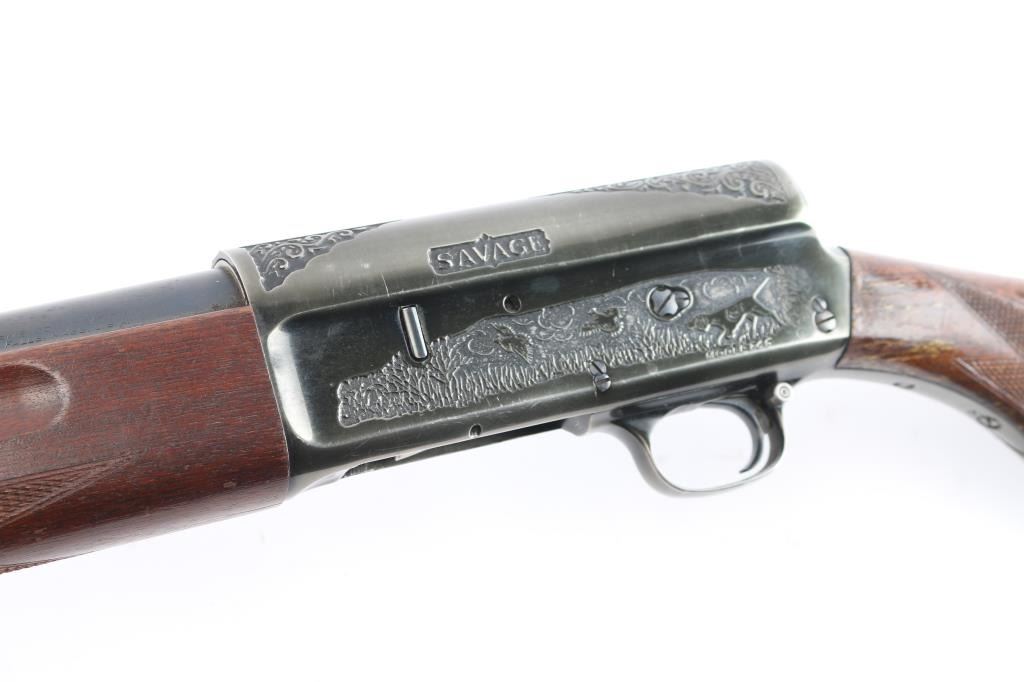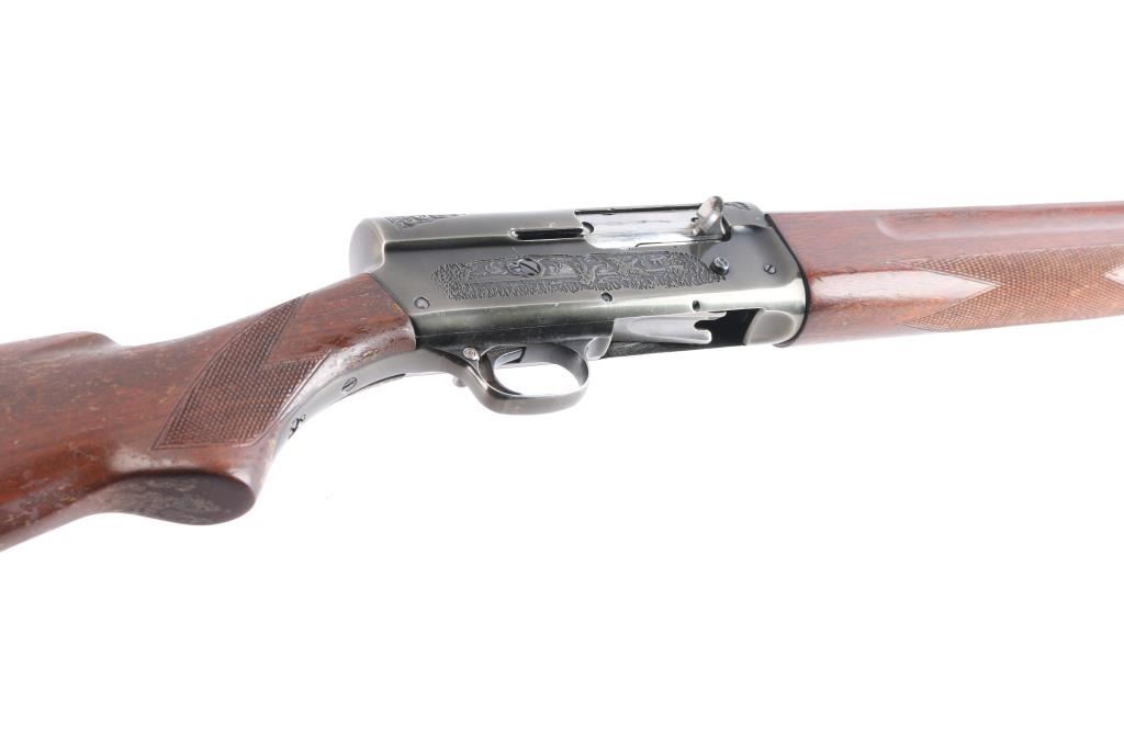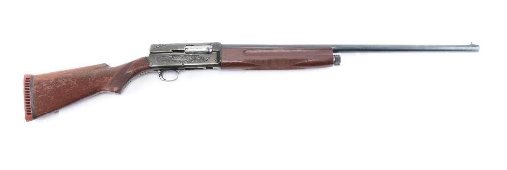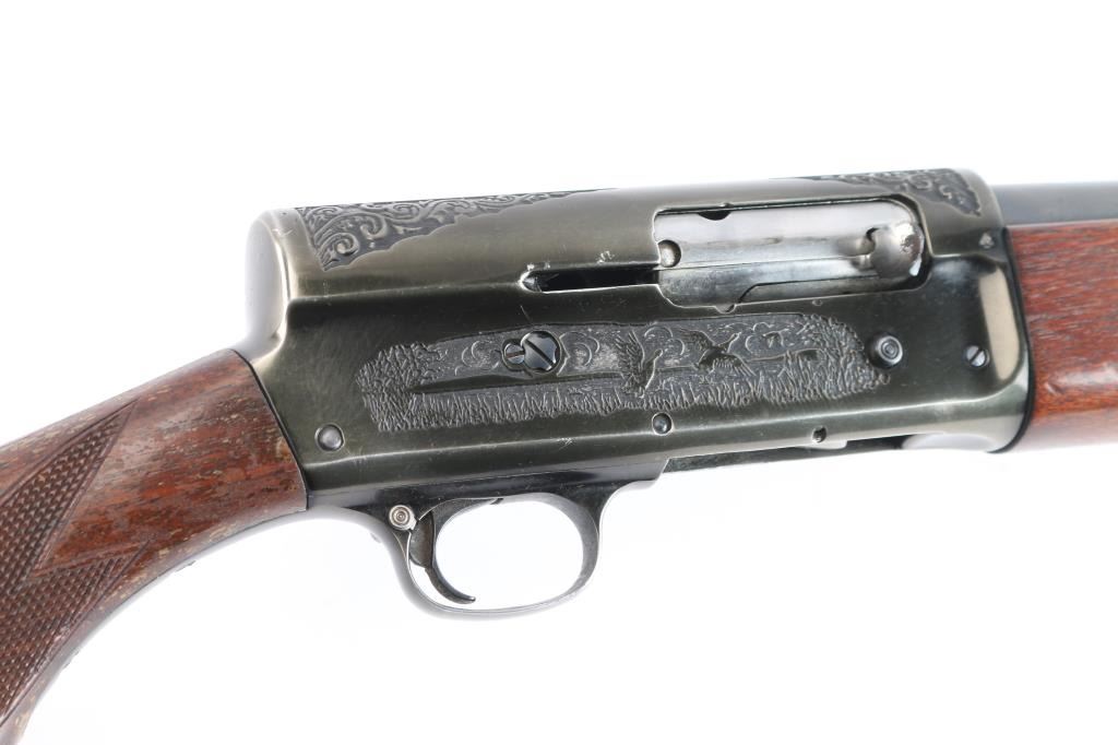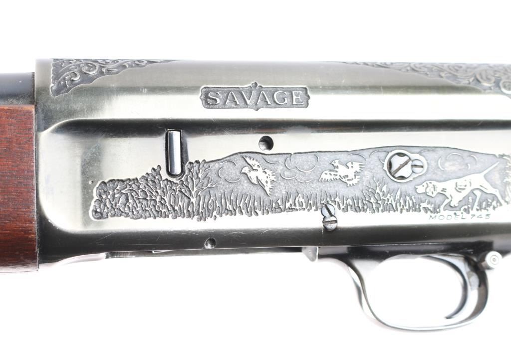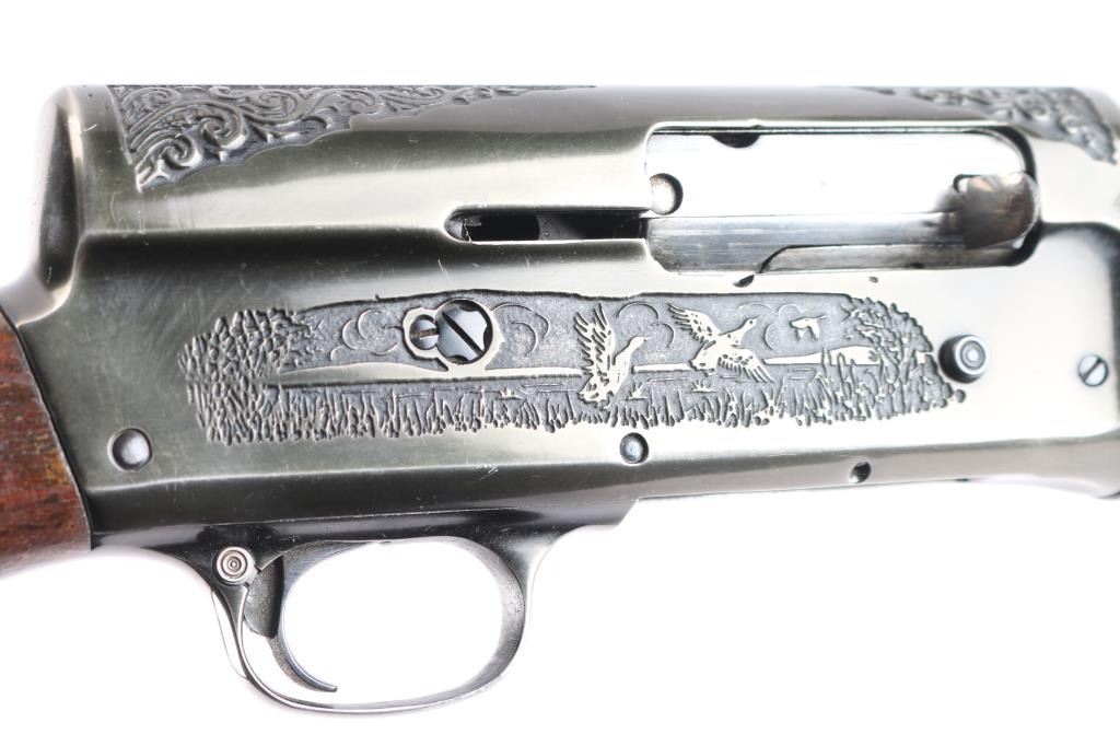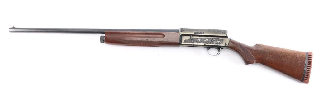 Designed by John Moses Browning, the classic Model 745 is a standard weight semi-auto shotgun chambered for 2 3/4" 12 Gauge shells. This is a vintage semiautomatic shotgun manufactured between 1940 and 1949 in Chicopee Falls, MA. This is a copy of the Browning Auto-5, and is considered the deluxe grade with engravings of a hunting scene with a dog and birds in a marsh. Shotgun features a 28" Barrel, bore measures 'M' with a drop-in gauge, brass bead front sight, aluminum receiver, smooth curved trigger, and an annular cut cross-bolt safety. The hardwood furniture consists of a semi-pistol grip shoulder stock with checkering at the wrist, checkered and finger-grooved forend, 14" length-of-pull, 1-3/4" drop at comb, 2-3/4" drop at heel, and red rubber Hawkins ventilated rubber recoil pad. The original blued barrel finish retained is approximately 90% with light scratches, edge wear, and marks from disassembly. The aluminum metal finish is good with fading, and edge wear. Metal displays light rust along the barrel, and there is observed deformation in some of the screw slots. The action is smooth and crisp, and the hard wood furniture is fair to good with a 1/2" hairline crack on the bottom of the forend, light scattered scratches, and a fair amount of missing finish. The bore is fair with what looks like rust at the front of the muzzle.