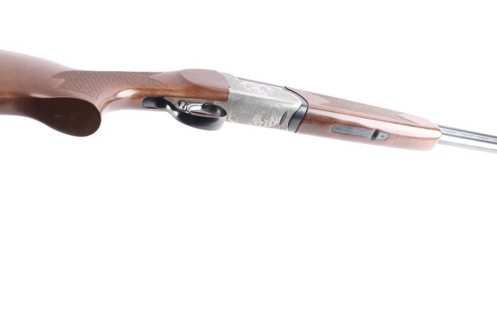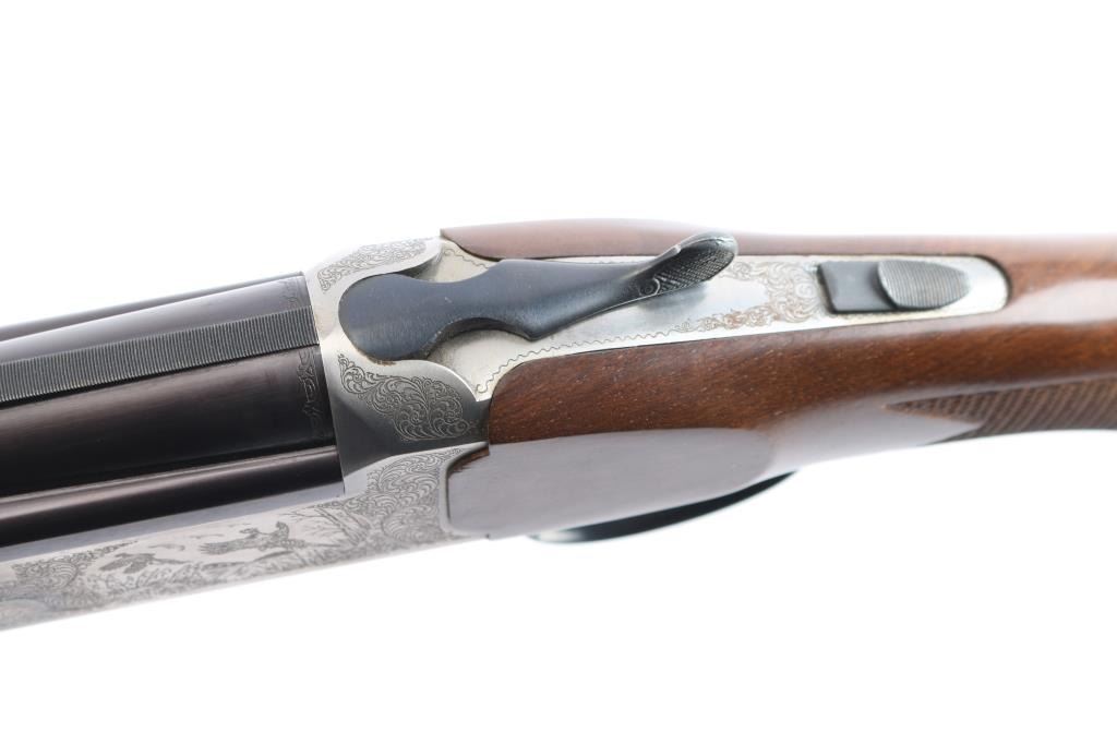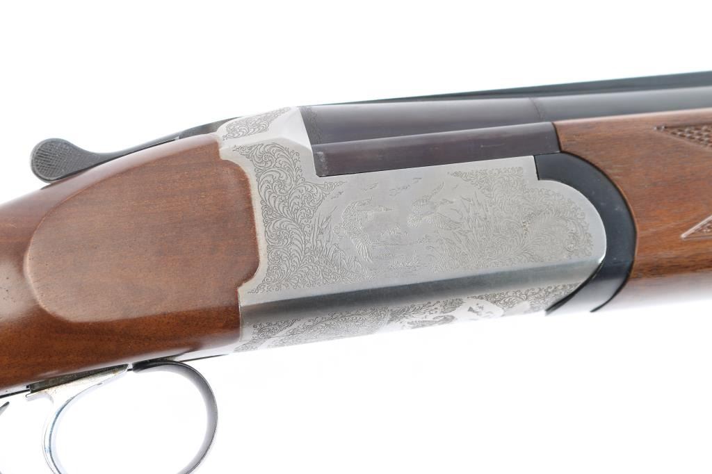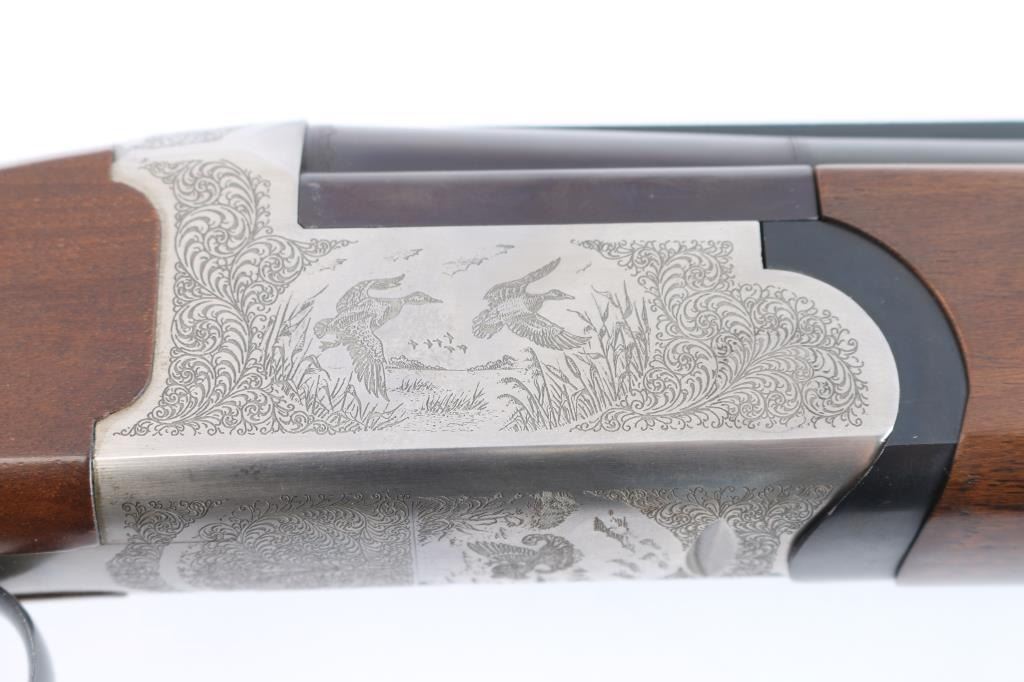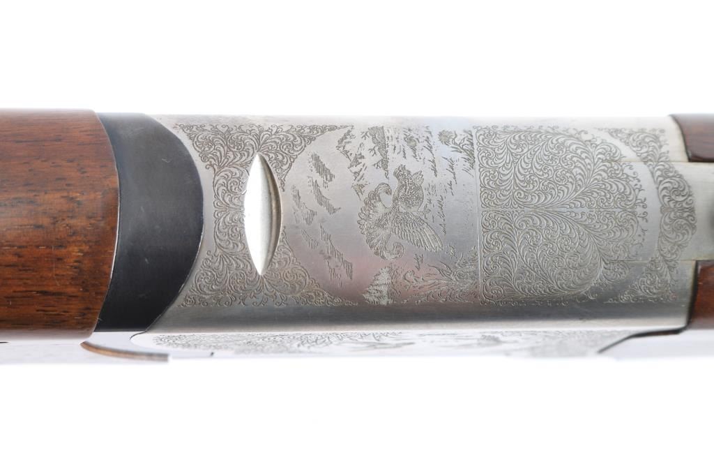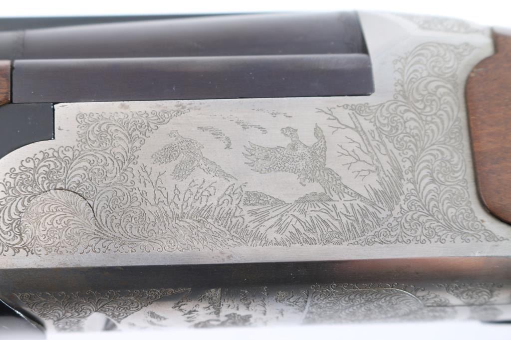 Italian made over/under box-lock shotgun chambered in 3" 12 Gauge shells, manufactured circa 1985. There are no observed manufacturing logos or names other than the buttplate. The buttplate has a bullseye symbol which has been observed on Falco shotguns, but there is not enough evidence to make the claim that this is a Falco shotgun. Featuring blued finished 26" barrels, vented rib, brass bead front sight, 'M' top bore and 'IC' bottom bore, single silver-toned smooth curved trigger, extractor, serrated sliding tang safety, and checkered top lever. The barrels, trigger guard, and top lever are blued with the receiver bearing a silver finish. The receiver displays full coverage of scroll, and a water fowl scene on all three sides. There is also edge engravings on the receiver and the chamber areas of the barrels. Walnut furniture consists of a semi-pistol grip shoulder stock with checkering at the wrist, a checkered forend, 14 1/4" length-of-pull, deeley latch forend release, and a black plastic checkered buttplate. The original blued finish retained is approximately 92% with very light handling marks, and scratches. The receiver shows no finish loss. Metal shows scattered light rust throughout the barrels/rib and on the top tang. Bores are bright and shiny, and the action is smooth and crisp.