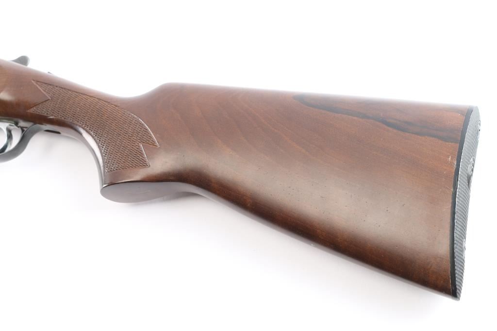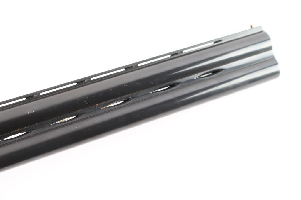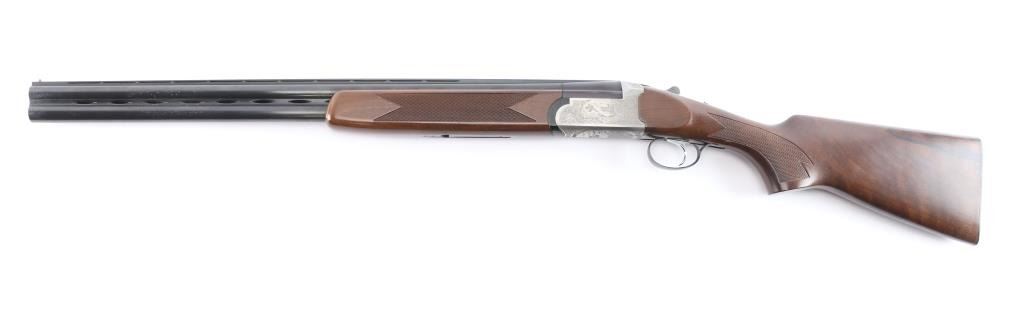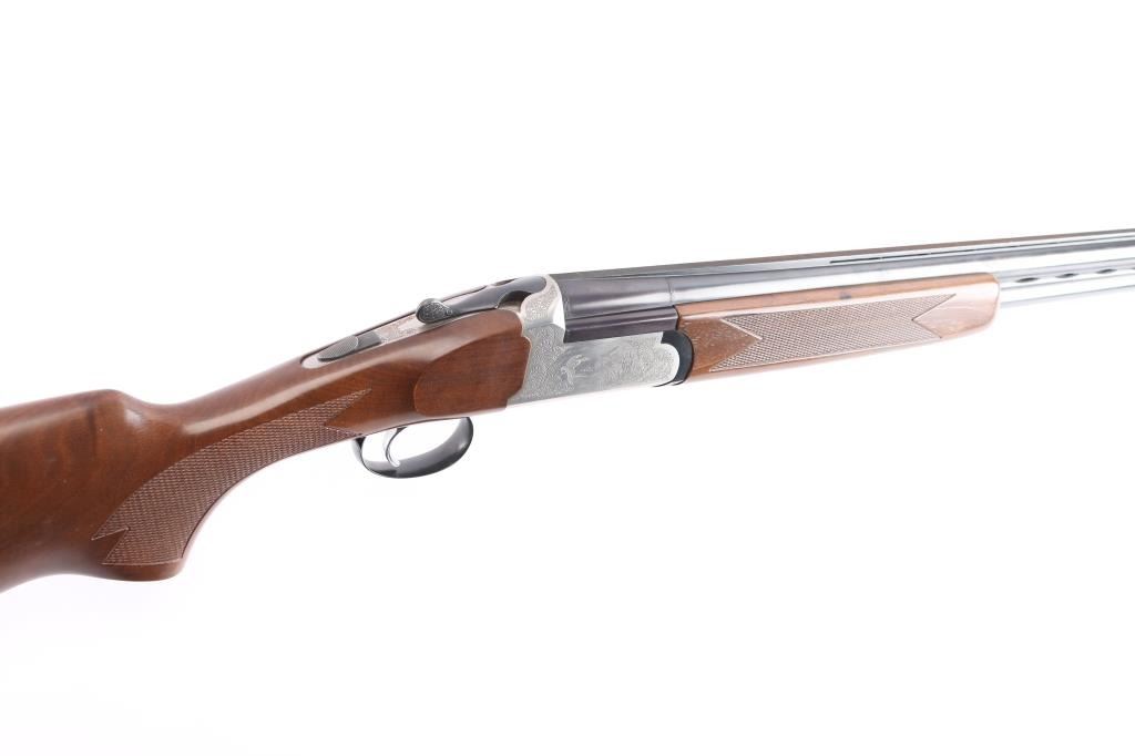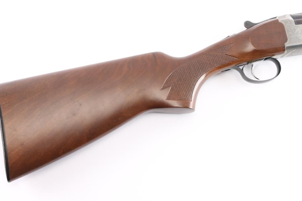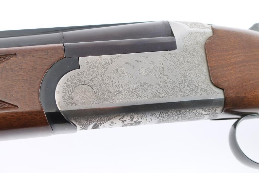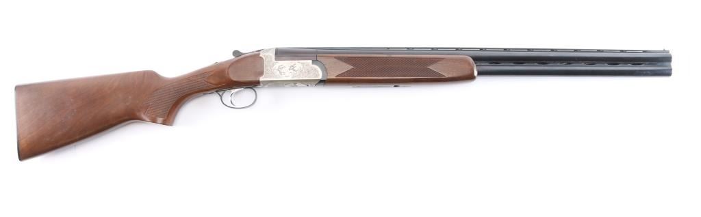 Italian made over/under box-lock shotgun chambered in 3" 12 Gauge shells, manufactured circa 1985. There are no observed manufacturing logos or names other than the buttplate. The buttplate has a bullseye symbol which has been observed on Falco shotguns, but there is not enough evidence to make the claim that this is a Falco shotgun. Featuring blued finished 26" barrels, vented rib, brass bead front sight, 'M' top bore and 'IC' bottom bore, single silver-toned smooth curved trigger, extractor, serrated sliding tang safety, and checkered top lever. The barrels, trigger guard, and top lever are blued with the receiver bearing a silver finish. The receiver displays full coverage of scroll, and a water fowl scene on all three sides. There is also edge engravings on the receiver and the chamber areas of the barrels. Walnut furniture consists of a semi-pistol grip shoulder stock with checkering at the wrist, a checkered forend, 14 1/4" length-of-pull, deeley latch forend release, and a black plastic checkered buttplate. The original blued finish retained is approximately 92% with very light handling marks, and scratches. The receiver shows no finish loss. Metal shows scattered light rust throughout the barrels/rib and on the top tang. Bores are bright and shiny, and the action is smooth and crisp.