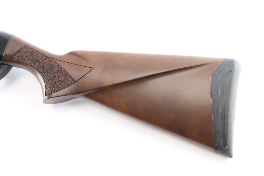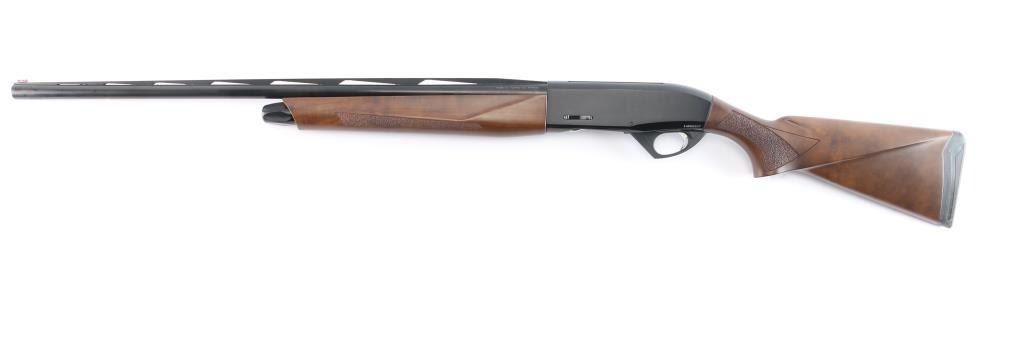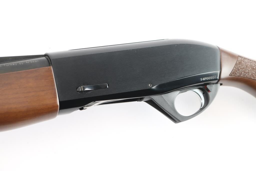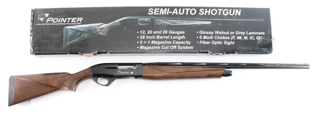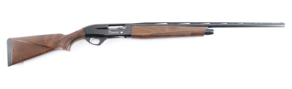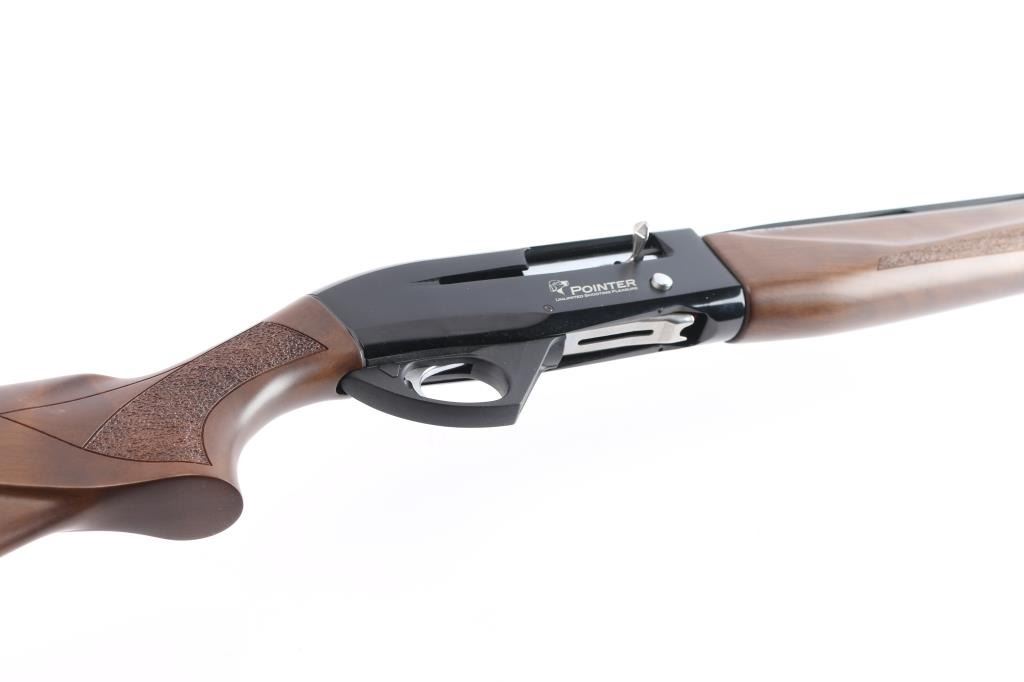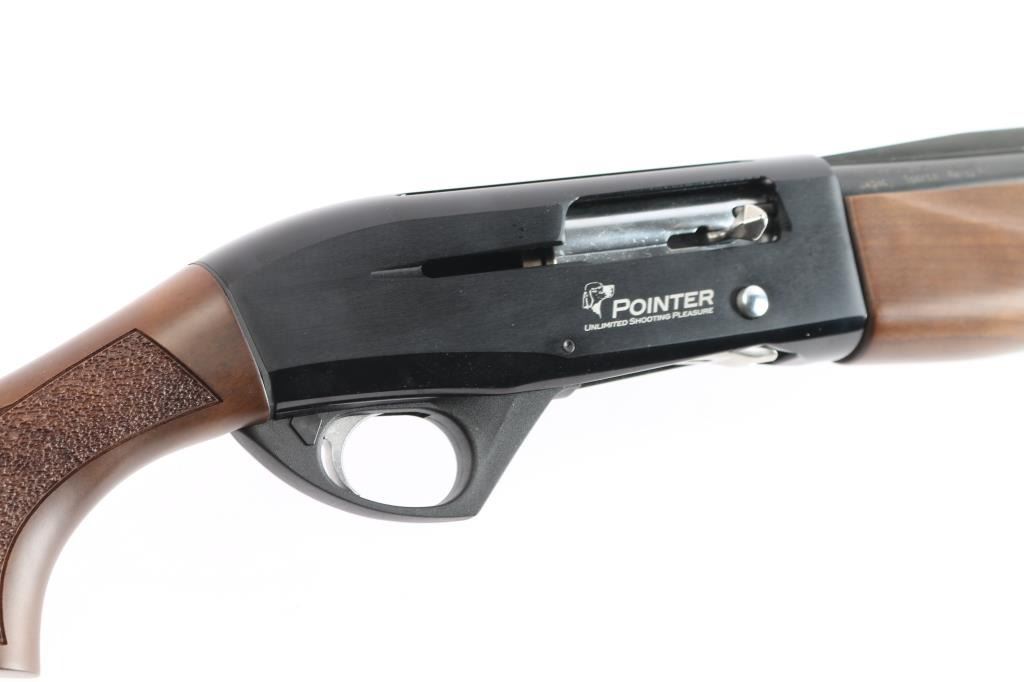 SN: 14P00507. Made in Turkey by Armsan, imported by Legacy Sports, Reno NV. Pointer .20 Ga. 3in Semi Automatic gas-operated shotgun. Features a 28" chrome-moly lined barrel with red fiber-optic front side and raised ventilated rib, screw in chokes, Mod installed. The receiver utilizes a 3/8" dovetail accessory rail on top. Matte black barrel, blue receiver with matte sides, push button safety. LOP-14" Bore is excellent/bright, action is smooth, finish is excellent, wood is excellent with textured panels on the wrist, & forearm, factory rubber recoil pad. Like new. Comes in factory box with matching label, manual & factory set of 4 additional choke tubes, Full, Skeet, Imp Mod, Imp Cyl.