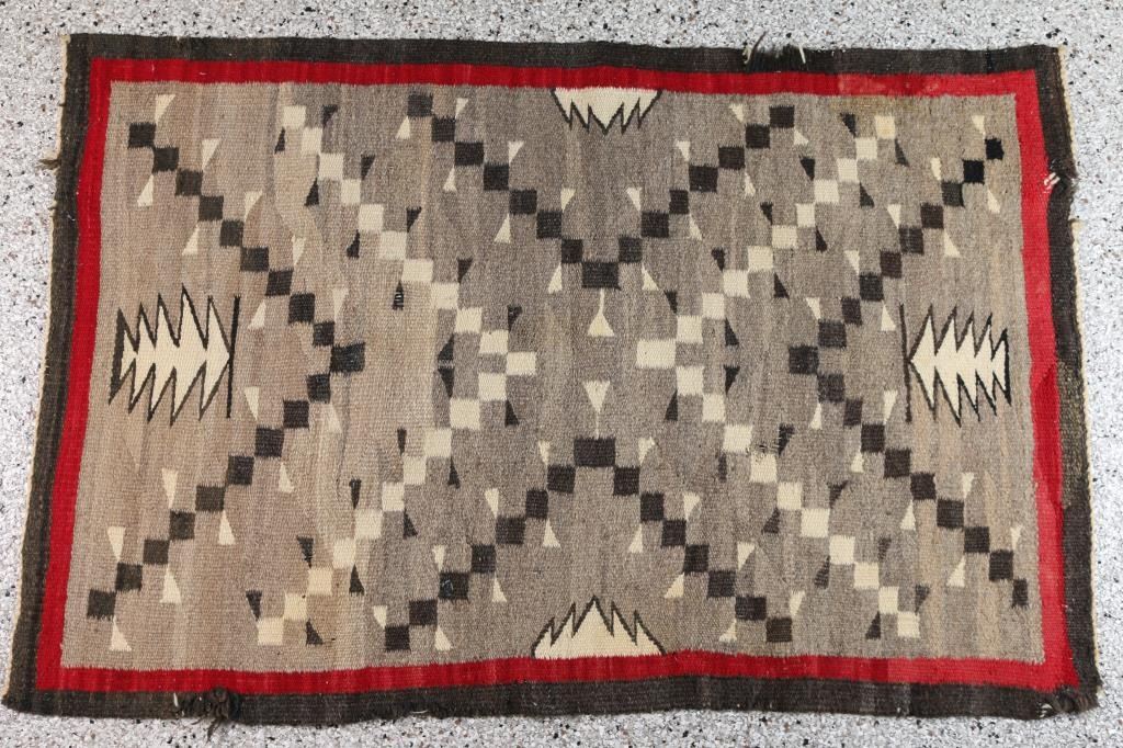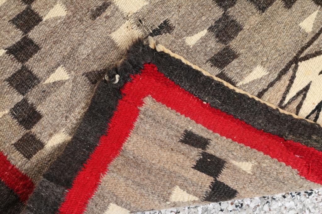 With geometric square design. In red, black, white and grey. 46" x 30". Shows age, fading, stain and heavy edge wear.