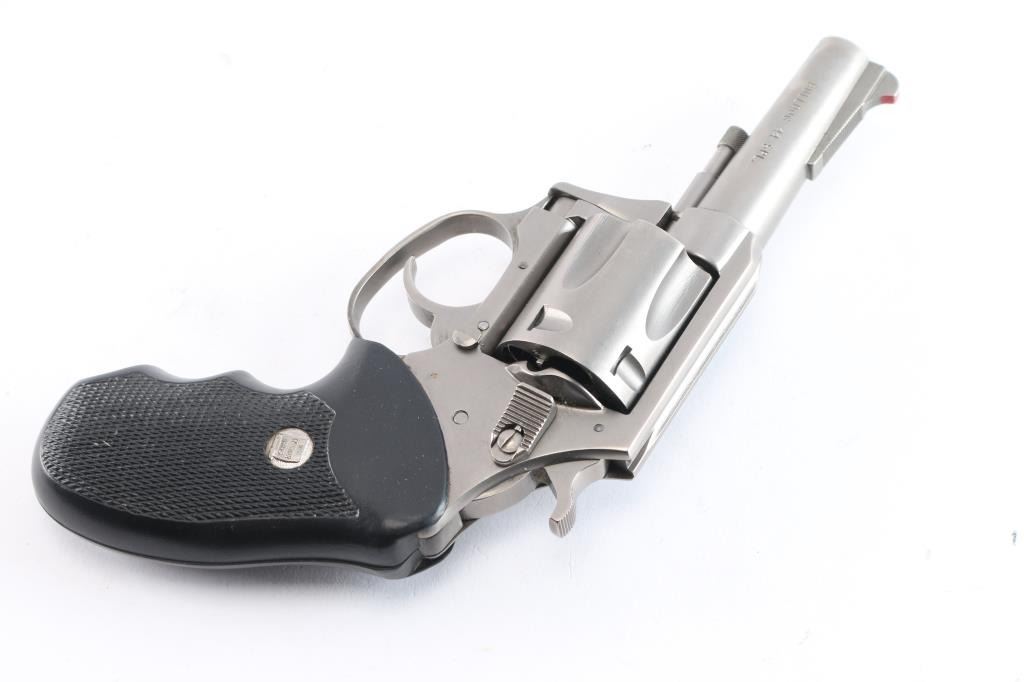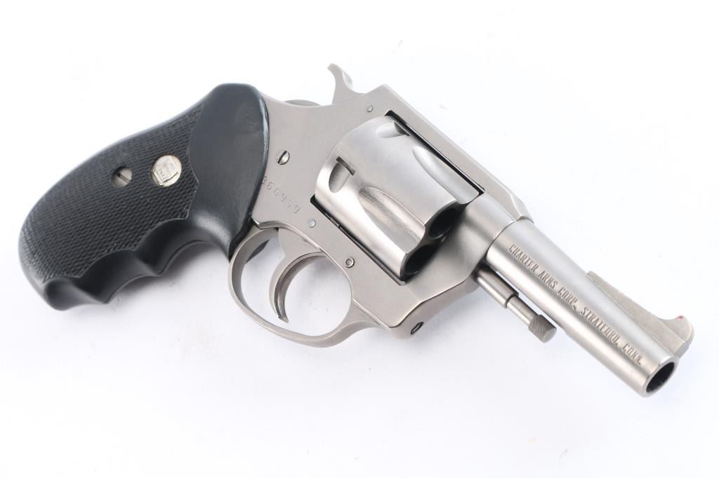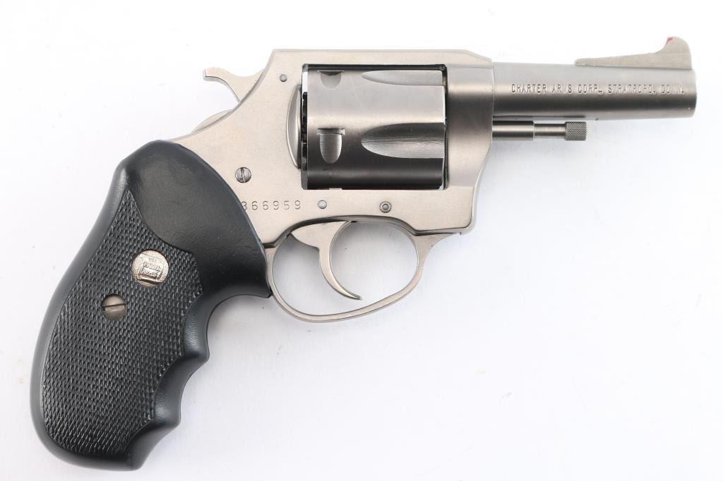 American made double action revolver features stainless steel construction with Robar NP3 finish, 3" barrel, 5 shot fluted cylinder, fixed sights, checkered black polymer finger groove grips with Charter Arms medallions, serrated hammer spur. Bore is very good/bright, action is smooth with tight lock-up, finish is very good with slight tracking on the cylinder and the grips very good.
