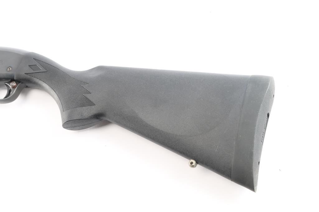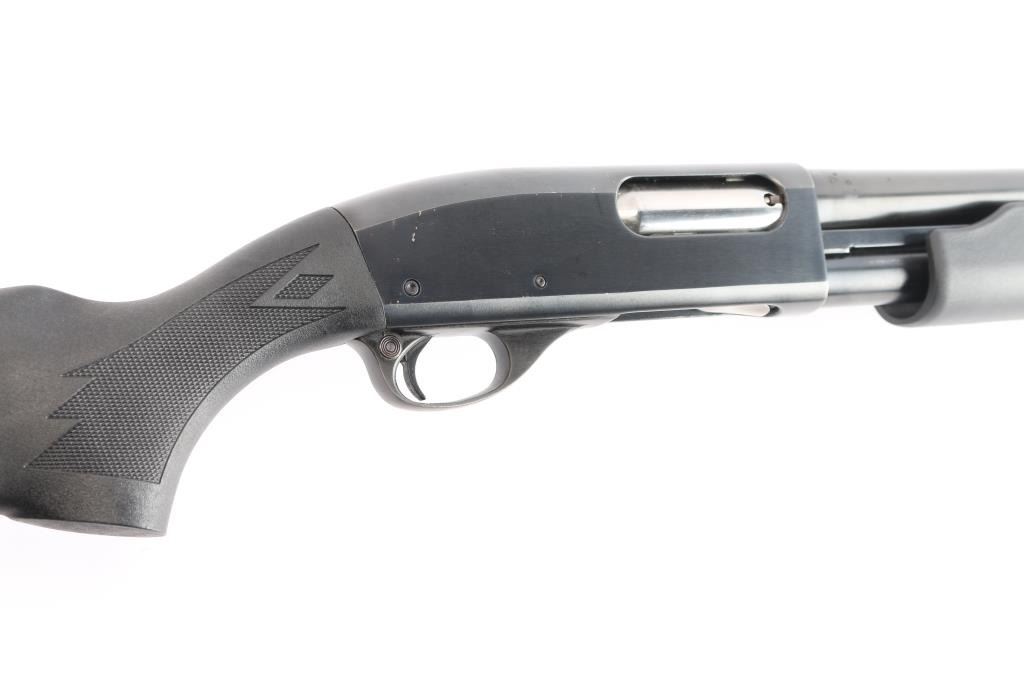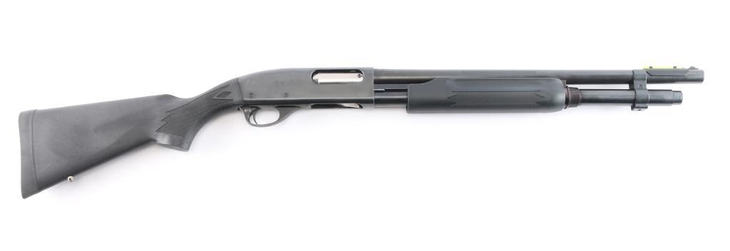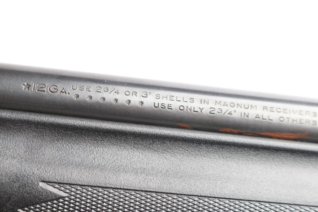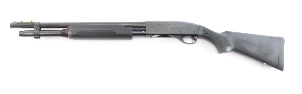 American made pump action shotgun chambered in 2-3/4" 12 Gauge shells, manufactured circa 1962 ('BJ' date code) in Ilion, NY. Featuring an approximately 20" round barrel, CYLINDER choke, steel bead front sight, snap on green fiber optic sight, extended magazine tube with barrel band, manual cross-bolt safety, 14" length-of-pull, and smooth curved trigger. The black polymer furniture consists of a semi-pistol grip shoulder stock with checkering at the wrist, checkered slide handle, and factory black rubber recoil pad. Bore is bright and shiny, and the action is smooth and crisp. The original blued finish retained is approximately 88% with light scattered handling marks, pump handle rub marks on magazine tube, and light edge wear. Furniture is in excellent condition with little remarkable to speak of. The metal condition is fair with rust towards the muzzle and along the barrel at the slide handle line.