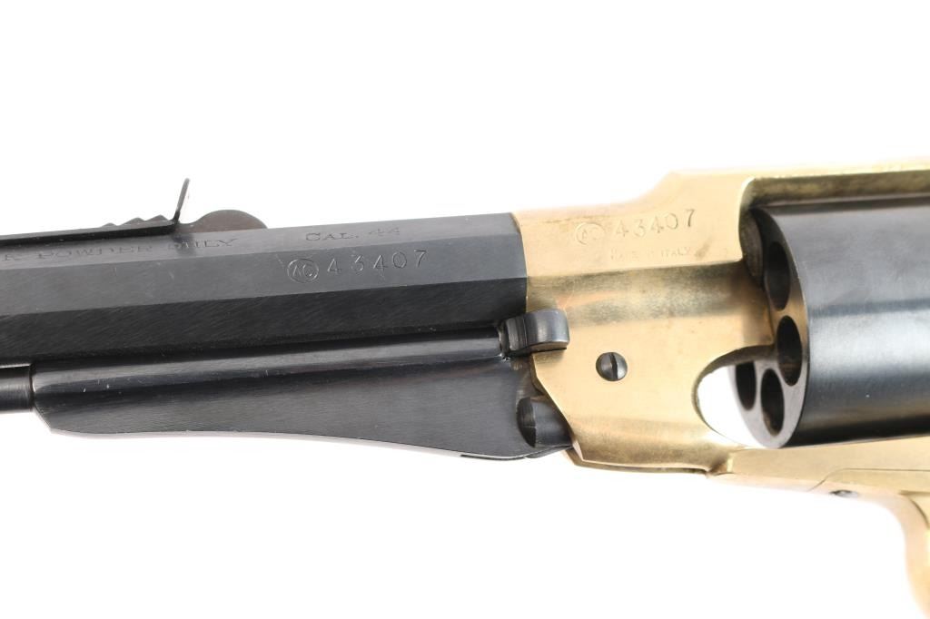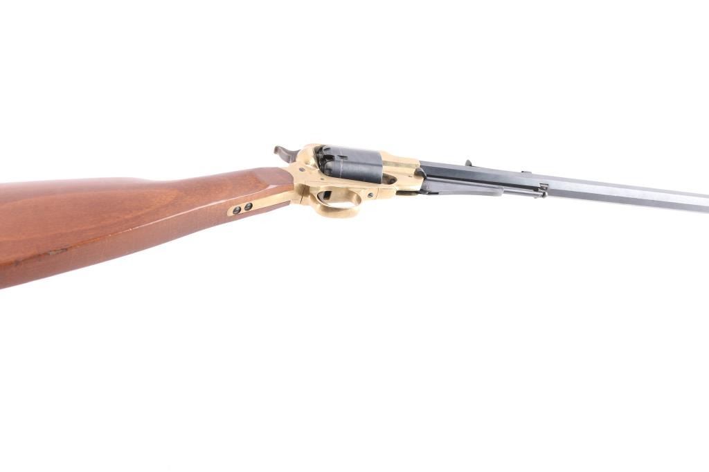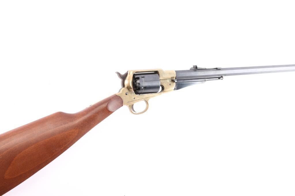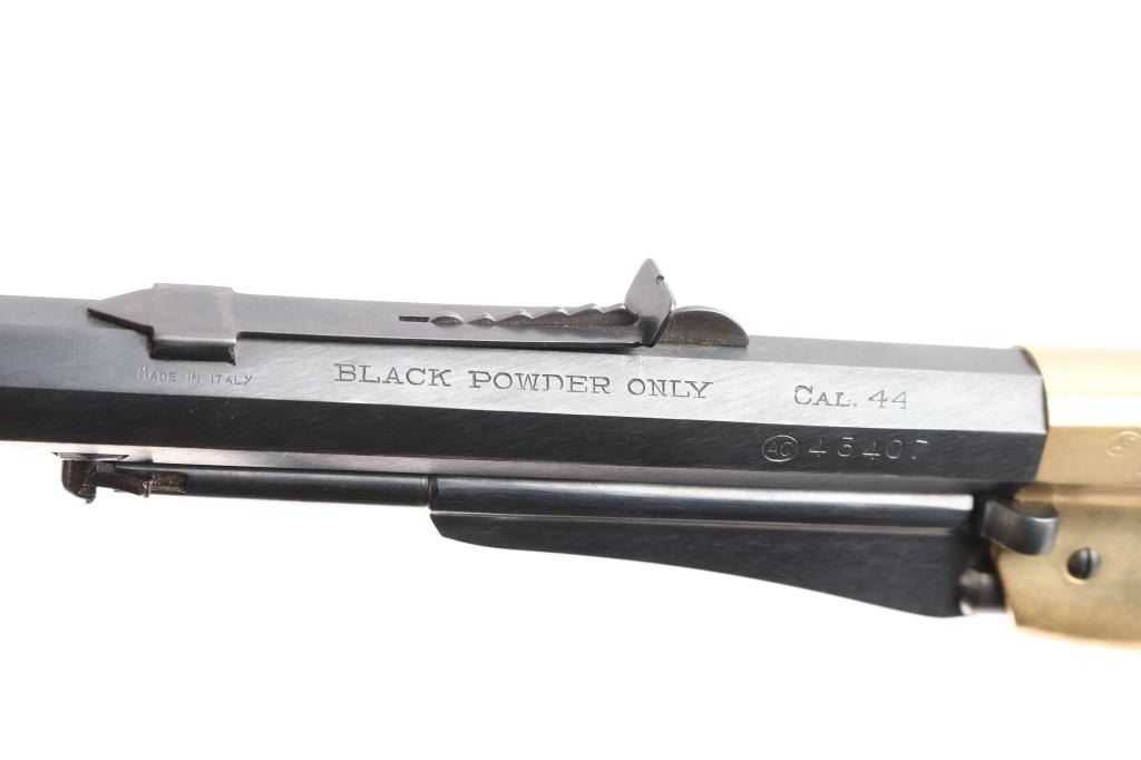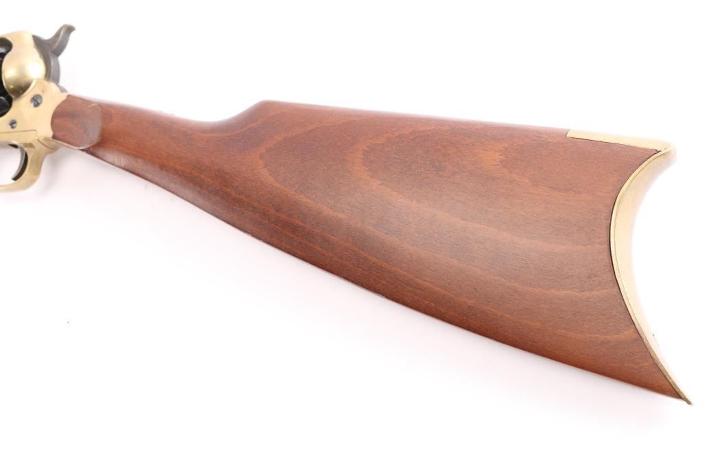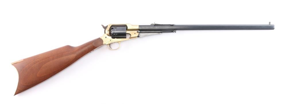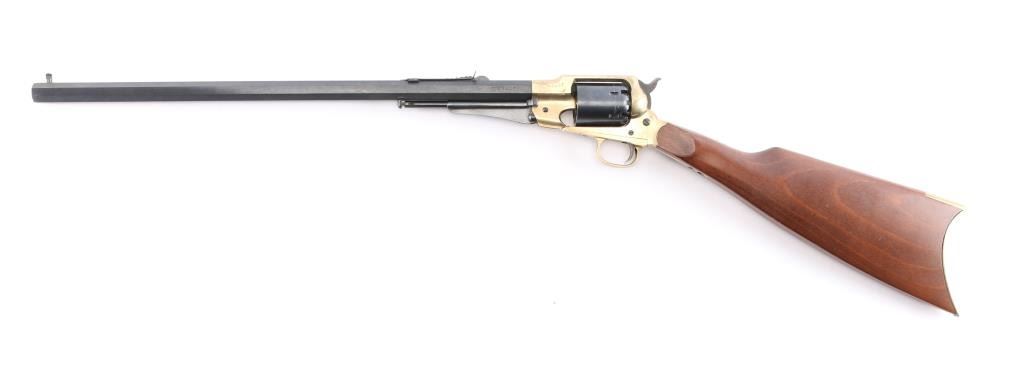 Italian reproduction of the scarce percussion Remington black Powder New Model Revolving-Rifle chambered for 44 caliber ammunition, manufactured in Italy circa 1991. Features a blued finish, brass frame & triggerguard, 20" octagon barrel, high blade front sight , adjustable rear sporting sight, smooth wide trigger, knurled hammer spur, non-fluted six shot cylinder, loading lever and straight grip shoulder stock with crescent brass buttplate. Rifle exhibits approximately 95% of it's blued finish showing a few light handling marks and drag marks on the cylinder. Action is smooth, the bore is pristine and the wood stock is very good/sound with a minor chip out of the underside of the stock.