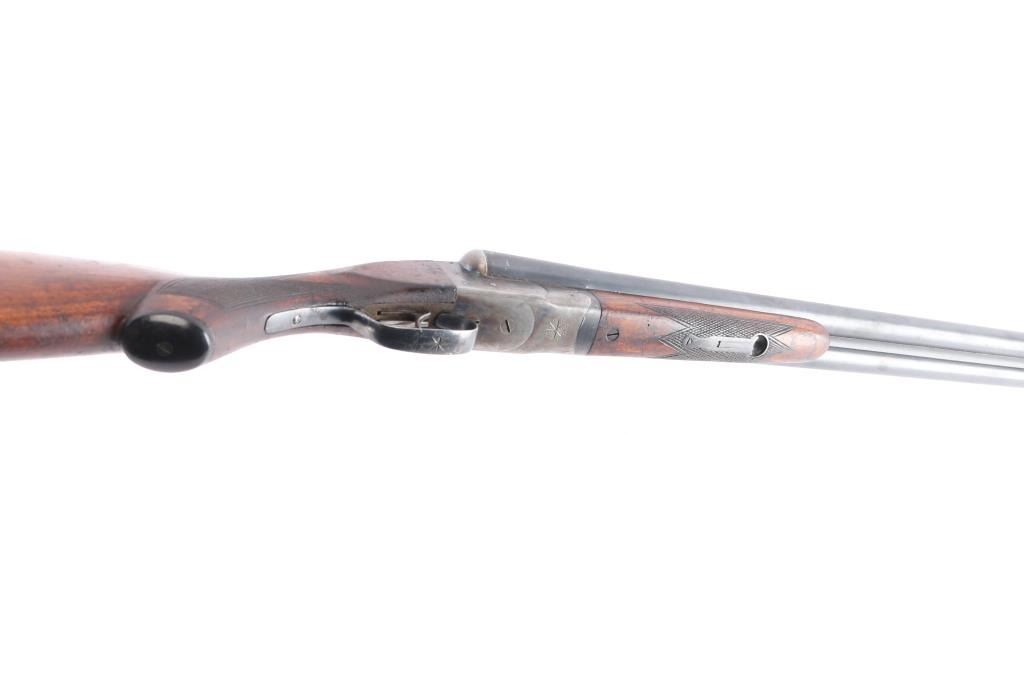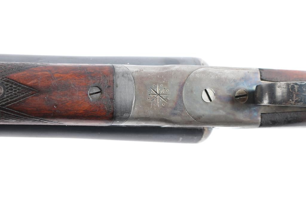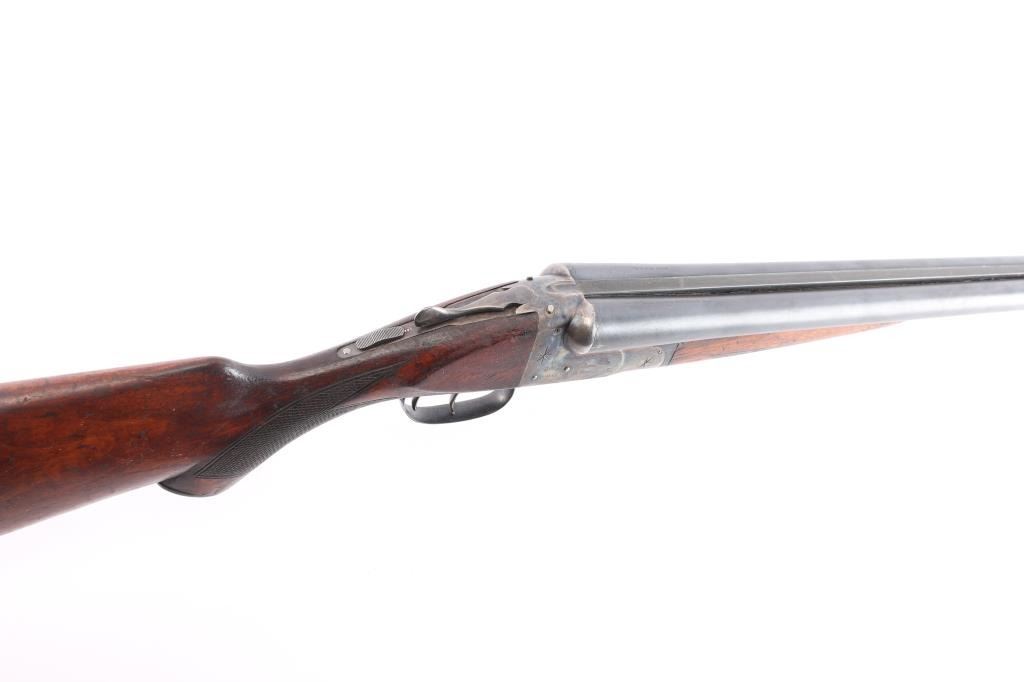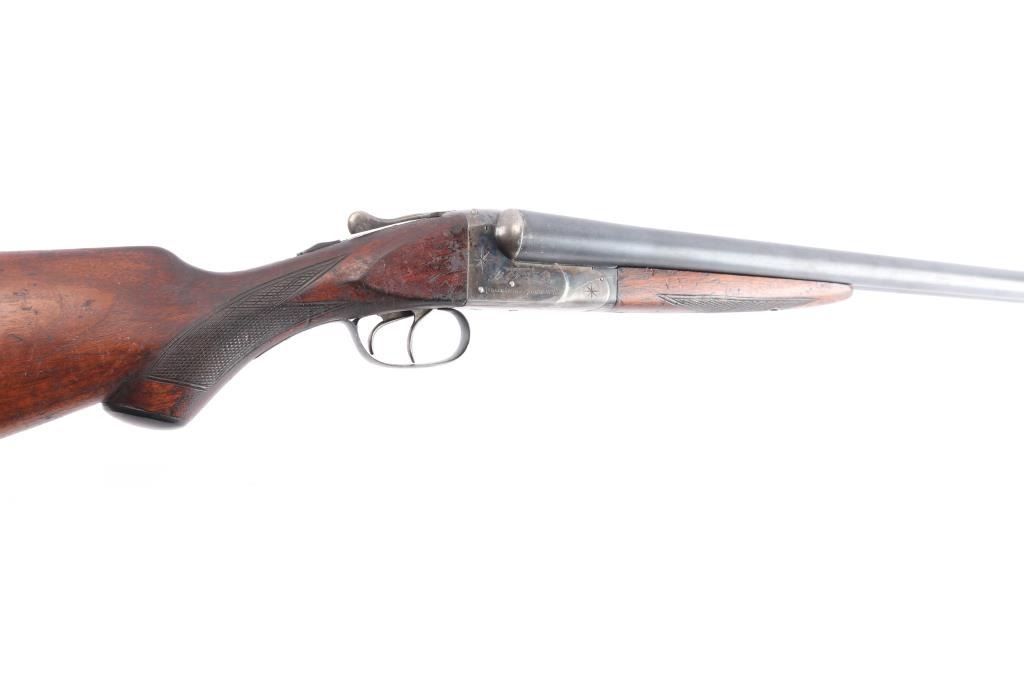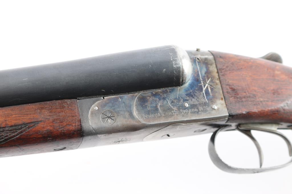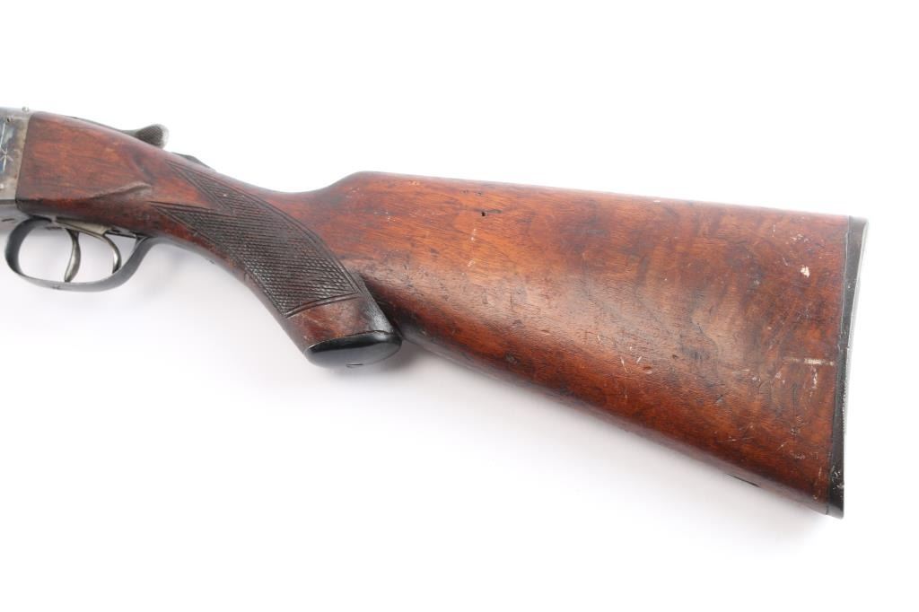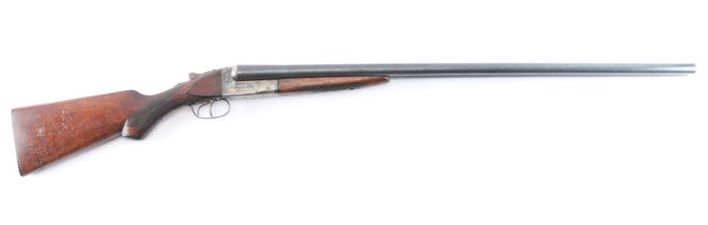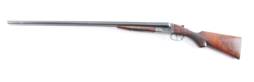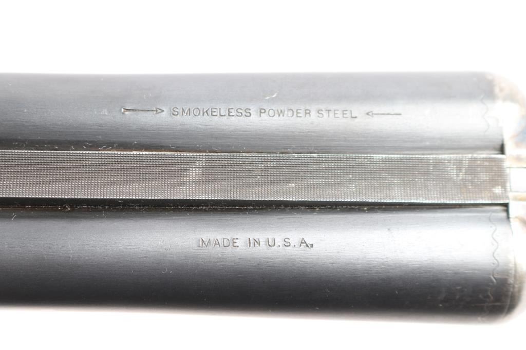 'New Ithaca Double' American made double barrel box-lock side by side field grade shotgun in 2 3/4" 12 gauge shells by Ithaca Gun Company Ithaca, NY. circa 1927. Featuring 32" blued ribbed barrels, brass bead front sight, double smooth curved triggers, extractor, serrated sliding tang safety, 'F' left bore and 'M' right bore (drop-in gauge), and cocking indicators. The hardwood furniture consists of a semi-pistol grip shoulder stock with checkering at the wrist, checkered splinter foend, deeley latch release, black plastic grip cap, 13 3/4" length-of-pull, and a black serrated plastic buttplate. Color-case hardened receiver displays limited coverage of a hunting scene with a dog, and stars. The original blued finish remaining is approximately 80% with scattered light scratches, edge wear, and some spots where the finish is thinning. Metal shows light scattered rust spots with some pin-prick pitting on the bottom side of the barrels, and the left barrel has some ligt damage the the muzzle. Furniture wood condition is good with normal scratches and dings throughout, and no observed cracks. Bore is shiny, but there is a small dent in the left bore near the muzzle. The action is smooth and crisp.