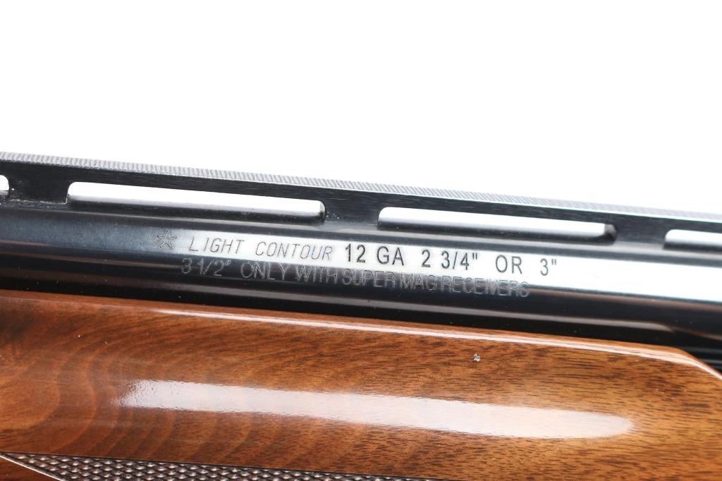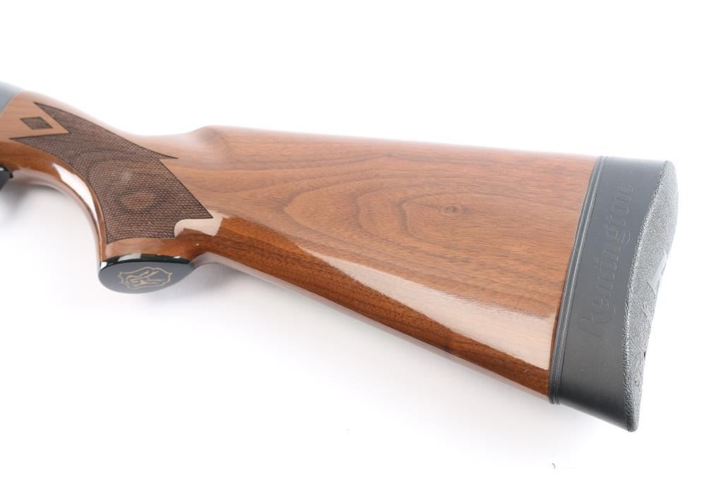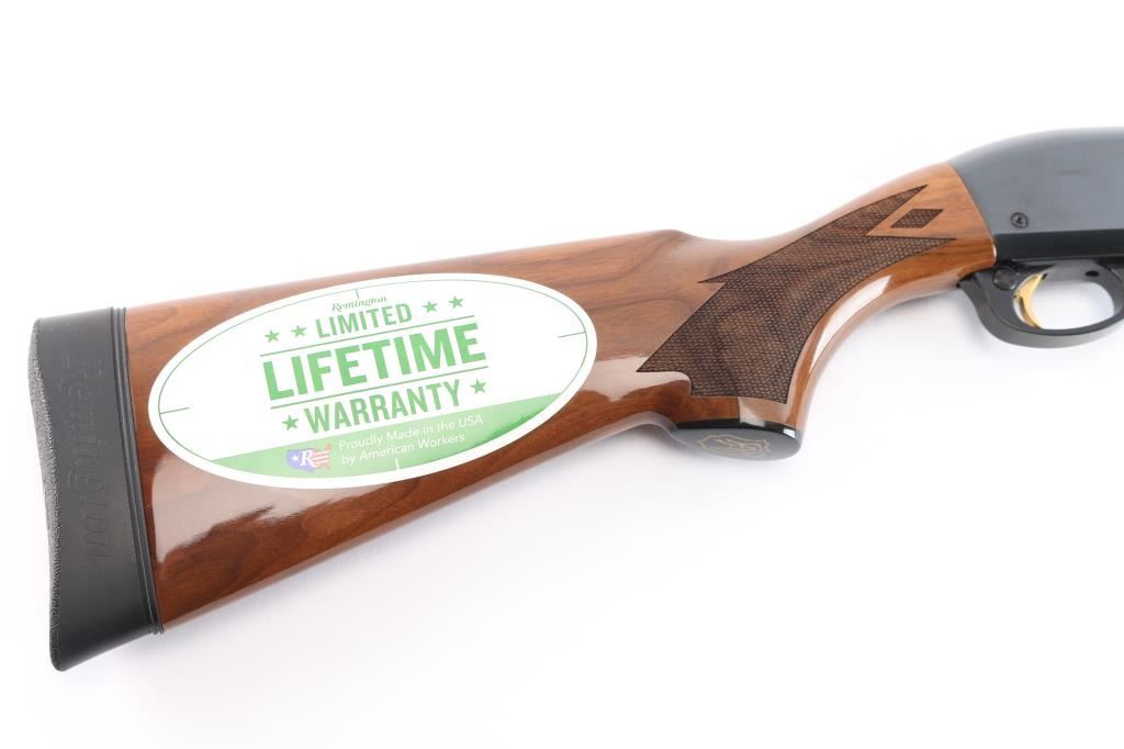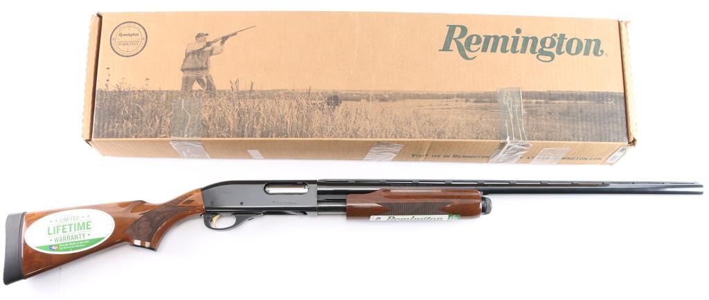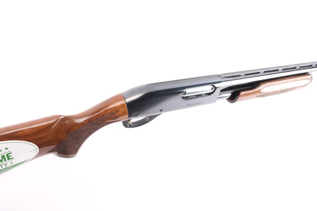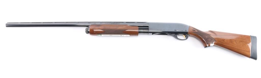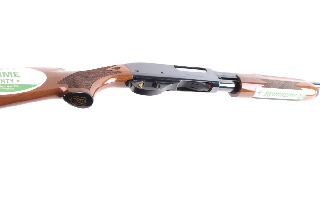 American made pump action shotgun chambered in 3" 12 Gauge shells, manufactured in Ilion, NY. Featuring an approximately 28" vent-rib barrel, accepts chokes with Mod tube installed, white bead front sight, steel mid-bead, manual cross-bolt safety, aluminum trigger guard, and smooth curved gold-toned trigger. The high gloss walnut furniture consists of a semi-pistol grip shoulder stock with checkering at the wrist, grooved checkered slide handle, black grip cap with gold lettered Remington insignia, 14" length-of-pull, and factory solid black rubber recoil pad. Bore is bright and shiny, and the action is smooth and crisp. The original blued finish retained is approximately 99% with little remarkable to speak of. Furniture is in excellent condition and looks new. The metal condition displays no rust or deformation. Shotgun includes original factory cardboard box, ownner's manual, two choke tubes, choke tube wrench, and magazine tube restriction plug.