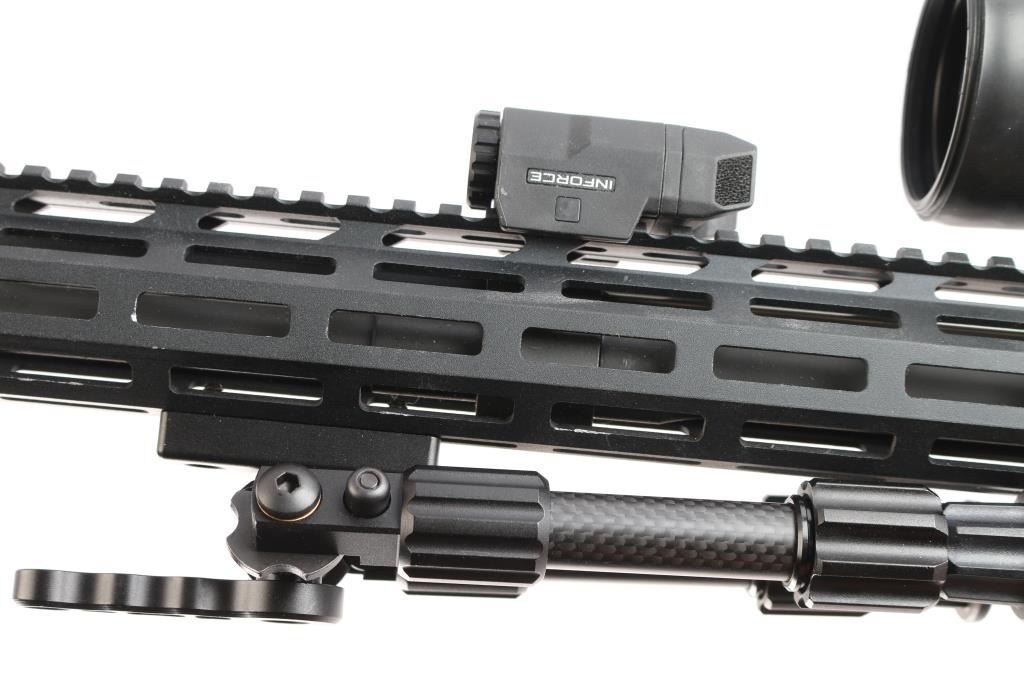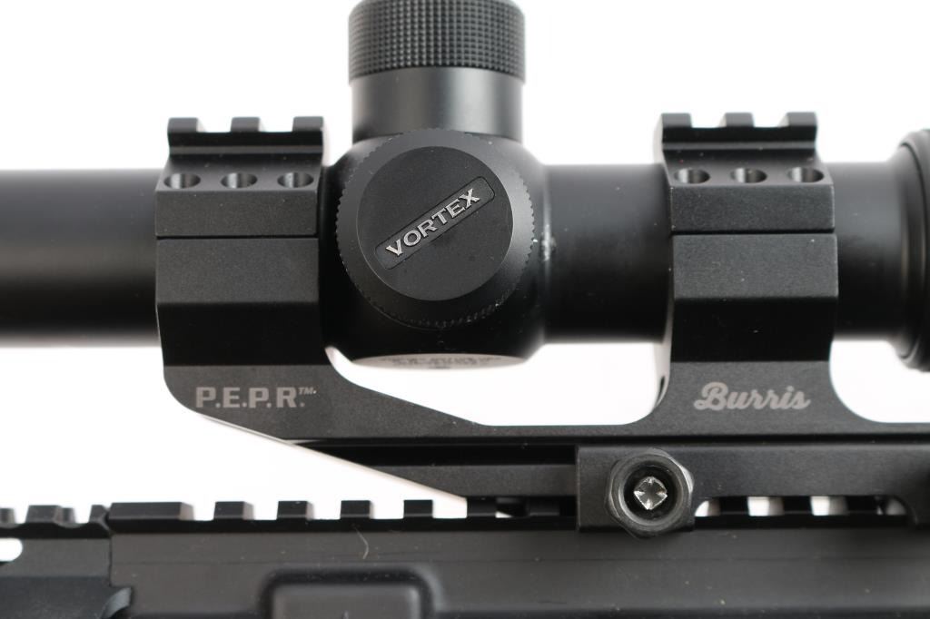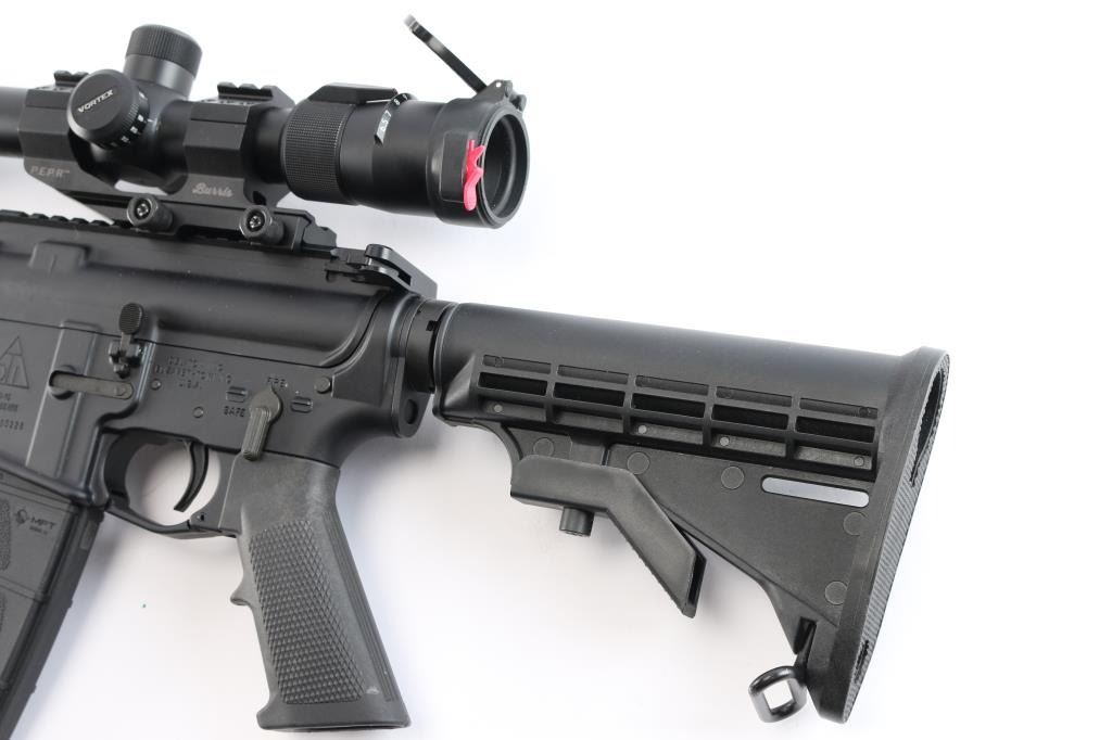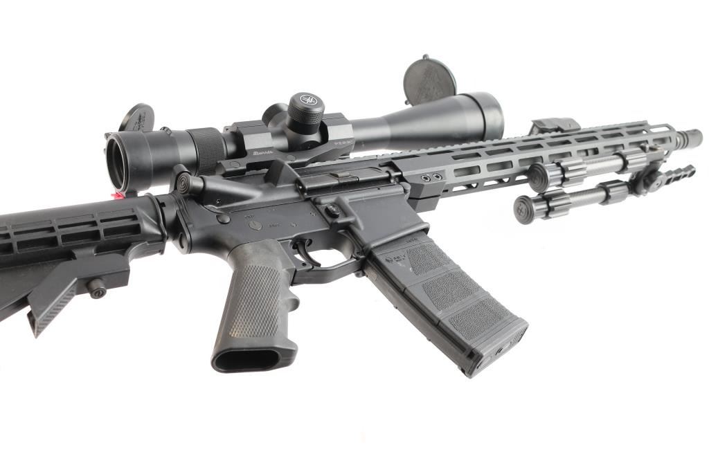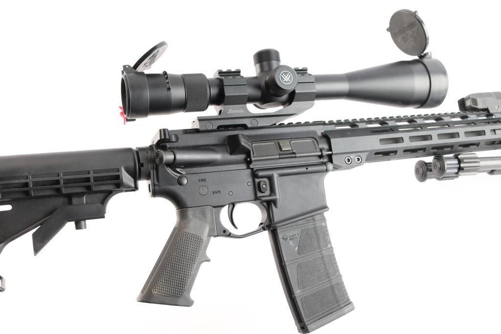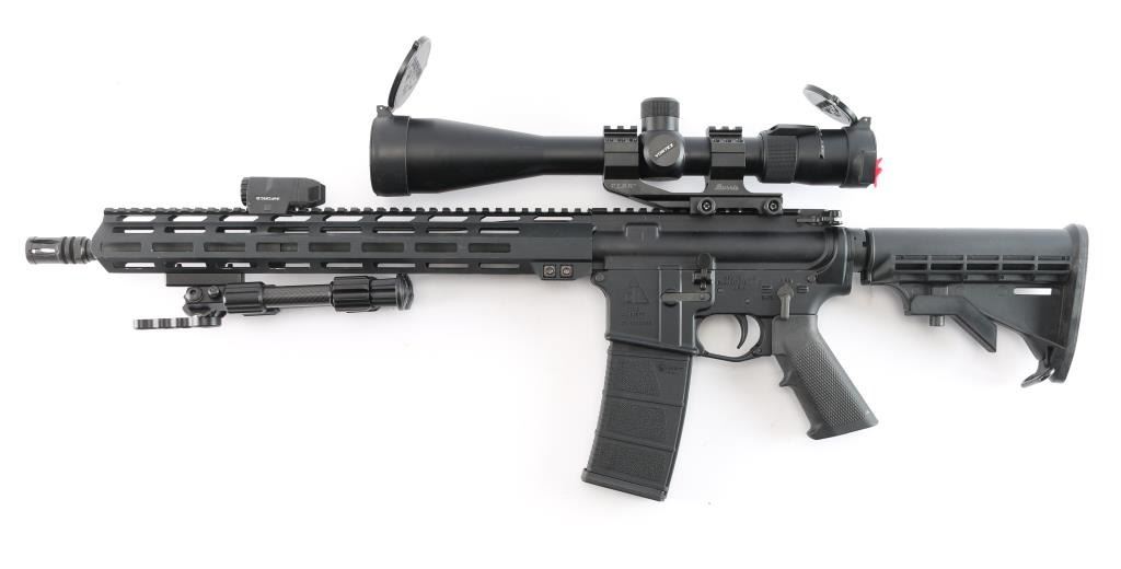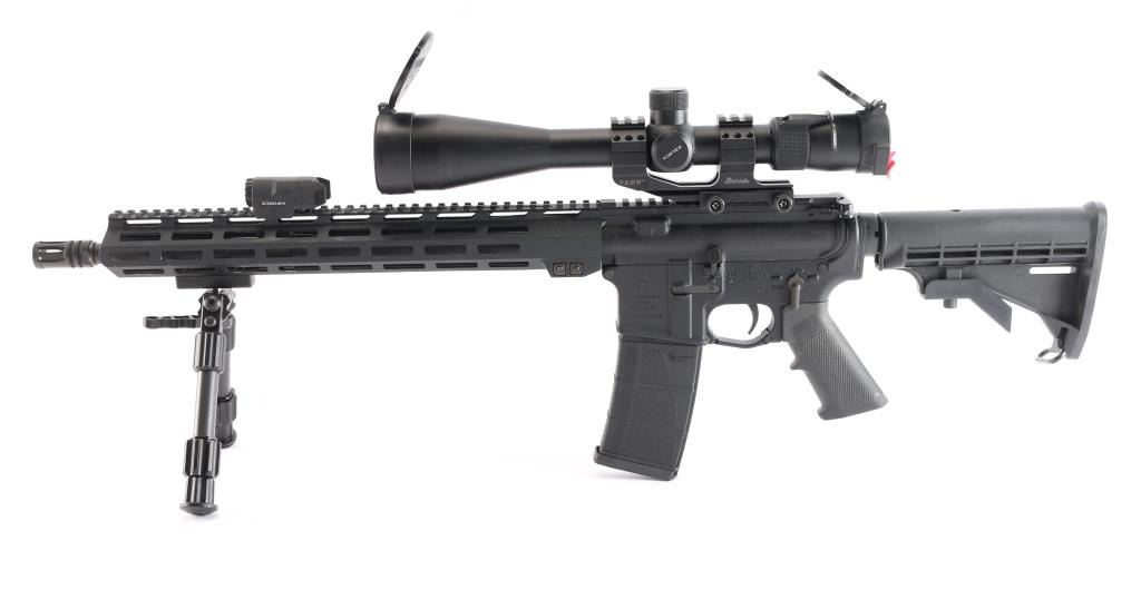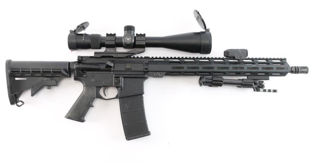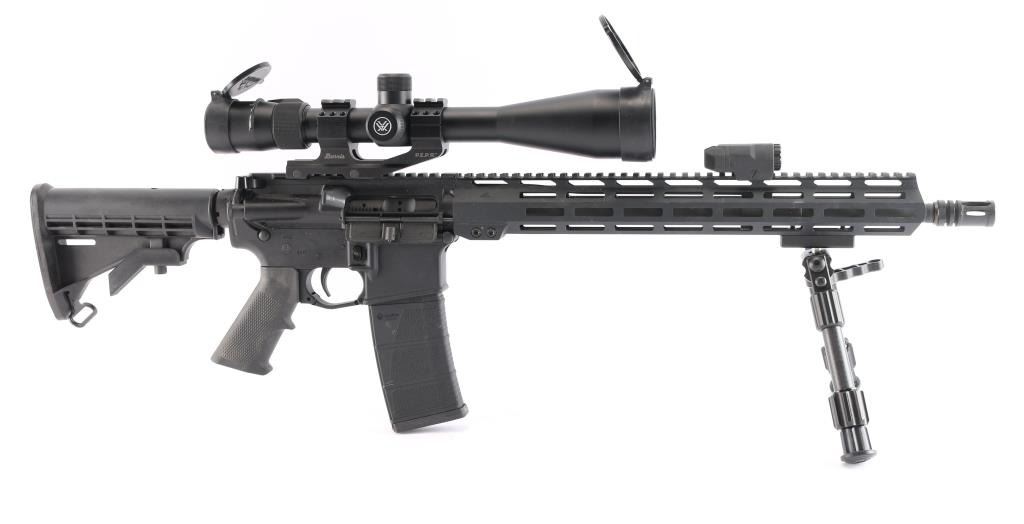 Direct-impingement operated semi-automatic rifle built on the AR15 design. Features matte black finish, 16" slim profile barrel with 1:9 twist, A2 bird cage flash hider, Aim Sports MTMC01 AR Handguard M-LOK AR-15 Black Hardcoat Anodized 14 1/2" Picatinny rail, M4 stock with sling swivel, rotating safety, A2 grip, flattop upper. forward assist, shell deflector. Extras include a Caldwell adjustable bipod, Inforce tactical flashlight installed on the upper handguard, needs battery. Mounted with a Vortex Viper 6.6-20x50 scope with Mil-Dot reticle, one piece Burris P.E.P.R. base, excellent condition. Bore is excellent. Retains 99% finish with few minor handling marks. comes with three (3) MFT Model 11 30-rd magazines and manual.