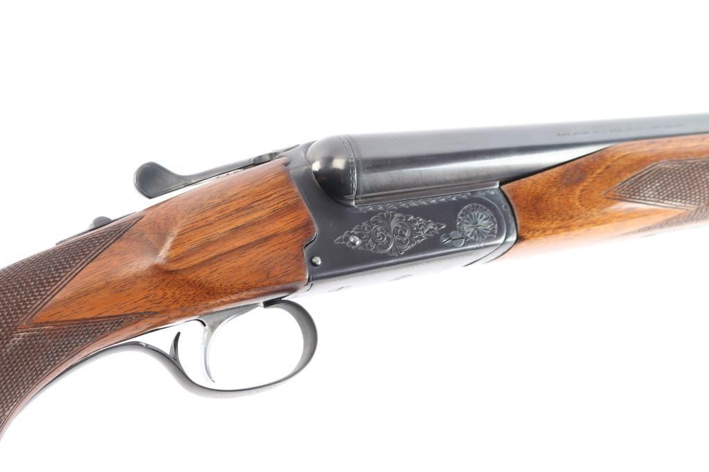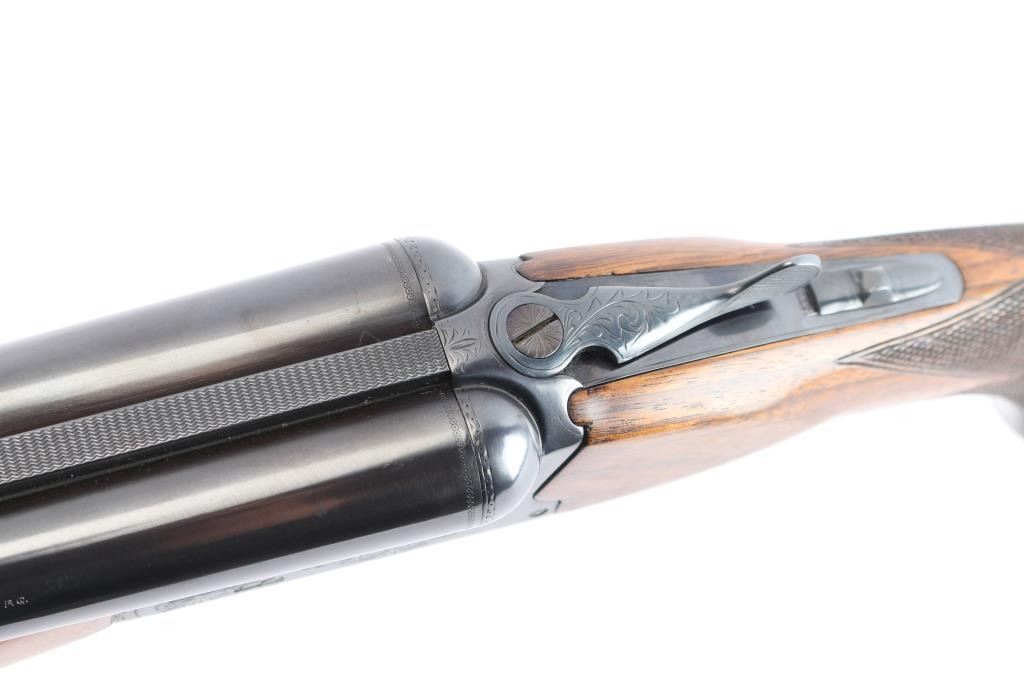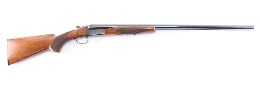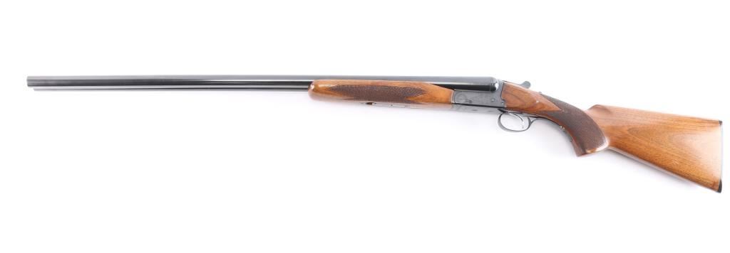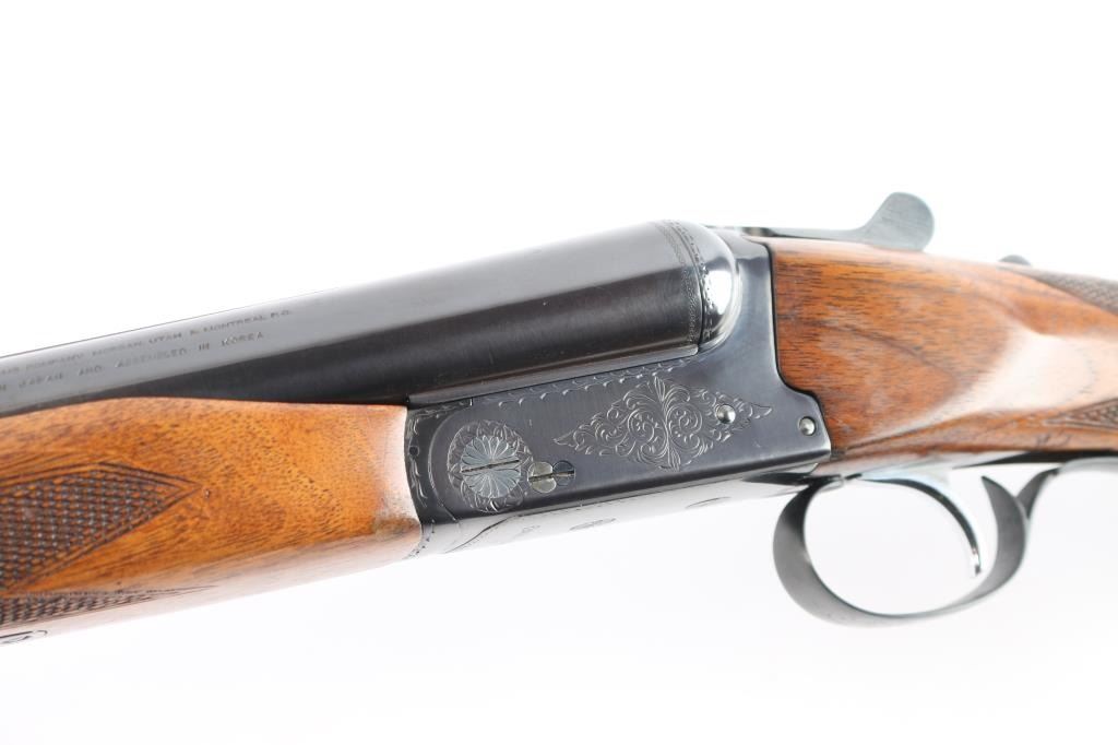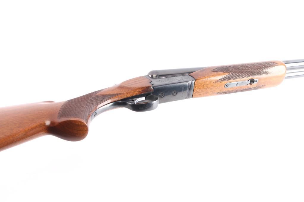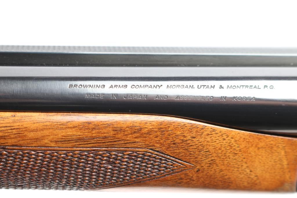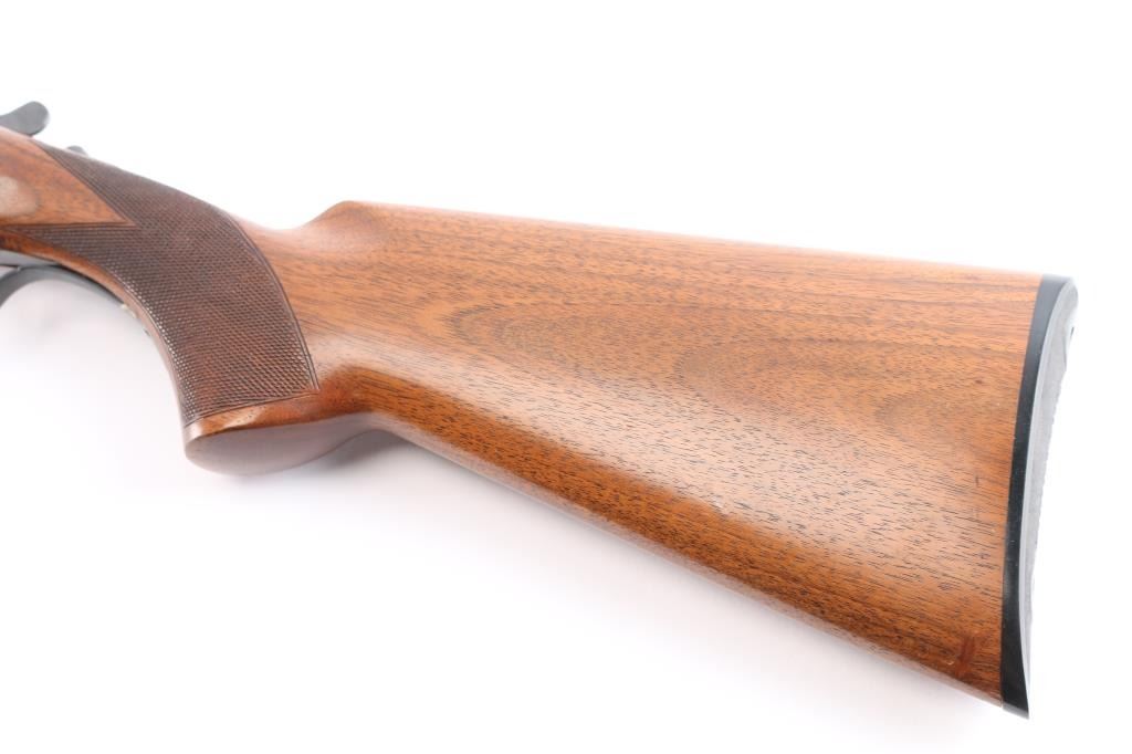 Double barrel box-lock side-by-side shotgun chambered for 3" 12 gauge shells, assembled in Korea with Japanese parts circa 1974. Imported by Browning Arms Co, Morgan UT. It features a blued finish, 30" barrels, 'F' left bore and 'IC' right bore (measured with drop-in gauge), single silver colored smooth curved trigger, serrated sliding tang safety, ejectors, and steel bead front sight. The receiver, barrel, trigger guard, barrel, and top lever display a limited coverage of scroll and floral engravings with edge patterns. The walnut furniture consists of a semi-pistol grip shoulder stock with checkering at the wrist, checkered beavertail forend, deeley forend latch, a finely textured Browning plastic buttplate. The stock dimensions are approximately 1 5/8" drop at comb, 2 1/2" drop at heel, and a 14 3/8" length-of-pull. Bores are bright and shiny, and the action is tight on face with the top lever resting slightly right of center. The original blued finish retained is approximately 96% with a few small scattered scratches and some very light rust/pitting on the ribs/barrels. Furniture wood is Very Good with mostly minor blemishes, some dents to the left side of the trigger guard, and a spot of finish loss at the rear of the forend.