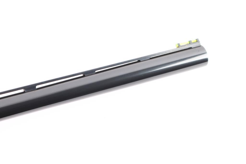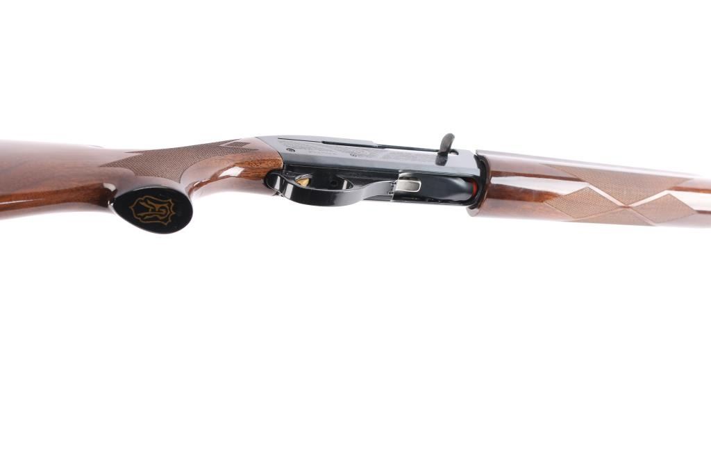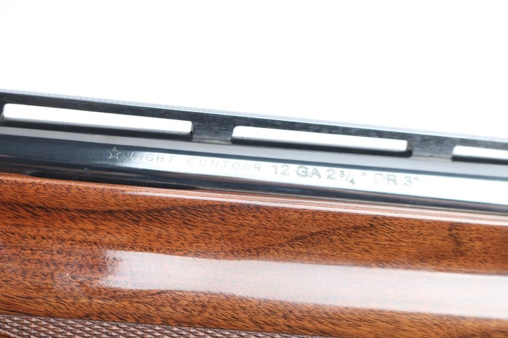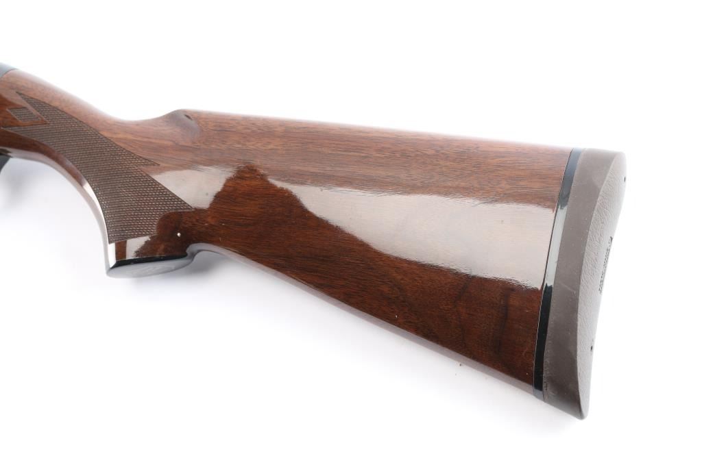 American made gas operated semi-automatic shotgun chambered for 2 3/4" or 3" 20 gauge shells. The model 11-87 was introduced in 1987 and was based off the Model 1100 but with a self-compensating gas system. Features a blued finish, "Light Contour" 28" vent rib barrel with factory "FULL" screw-in choke tube, green fiber-optic front sight, silver bead mid-sight, half-length tube magazine, smooth gold trigger with beveled edges, alloy triggerguard, serrated charging handle, push button safety with key lock feature, floral engraved steel receiver, checkered walnut forend with satin finish, and straight grip shoulder stock with factory recoil pad. Shotgun exhibits approximately 99%+ of its original high polish blue finish showing little to no visible wear. Action is smooth, the bore is excellent, and the wood stocks are fine. LOP-13 3/4".