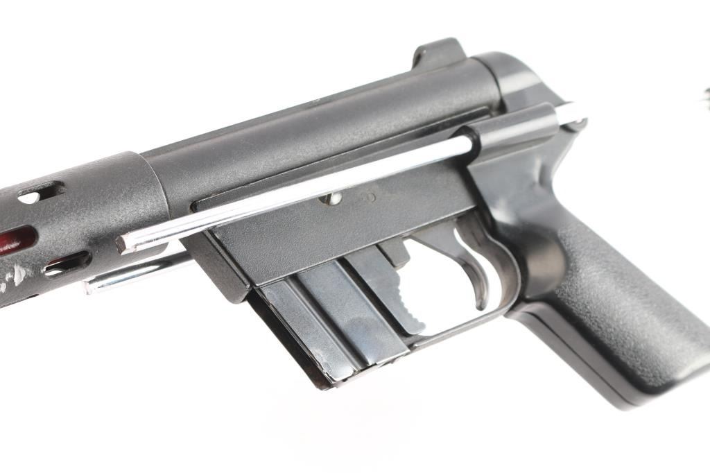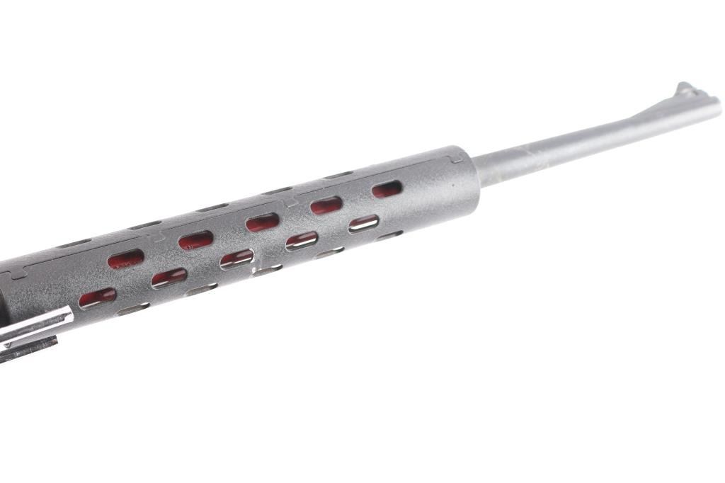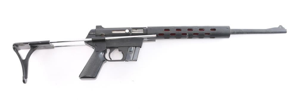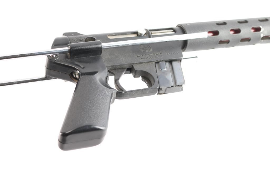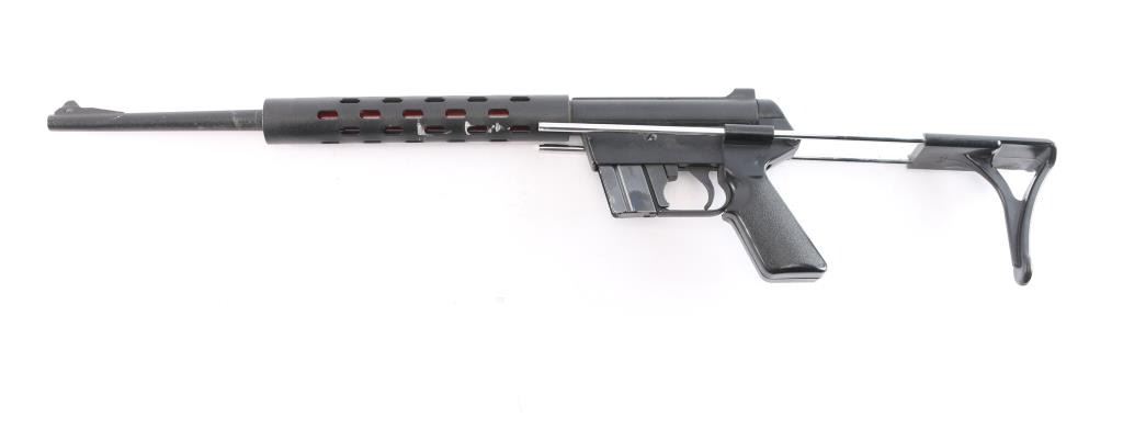 Survival Arms AR7 Explorer .22 long rifle with a 16" removable barrel with a aluminum ported barrel shroud, blade front, rear peep sights. Back finished receiver with pull out charging handle, serrated magazine release, and trigger. Push to fire safety selector. textured polymer pistol grip and wire stock with polymer butt plate. Include one 10-rd magazine. Light scratches, dings, and general wear from handling and operation. Bore is very good/bright. Manufactured 1959-73.