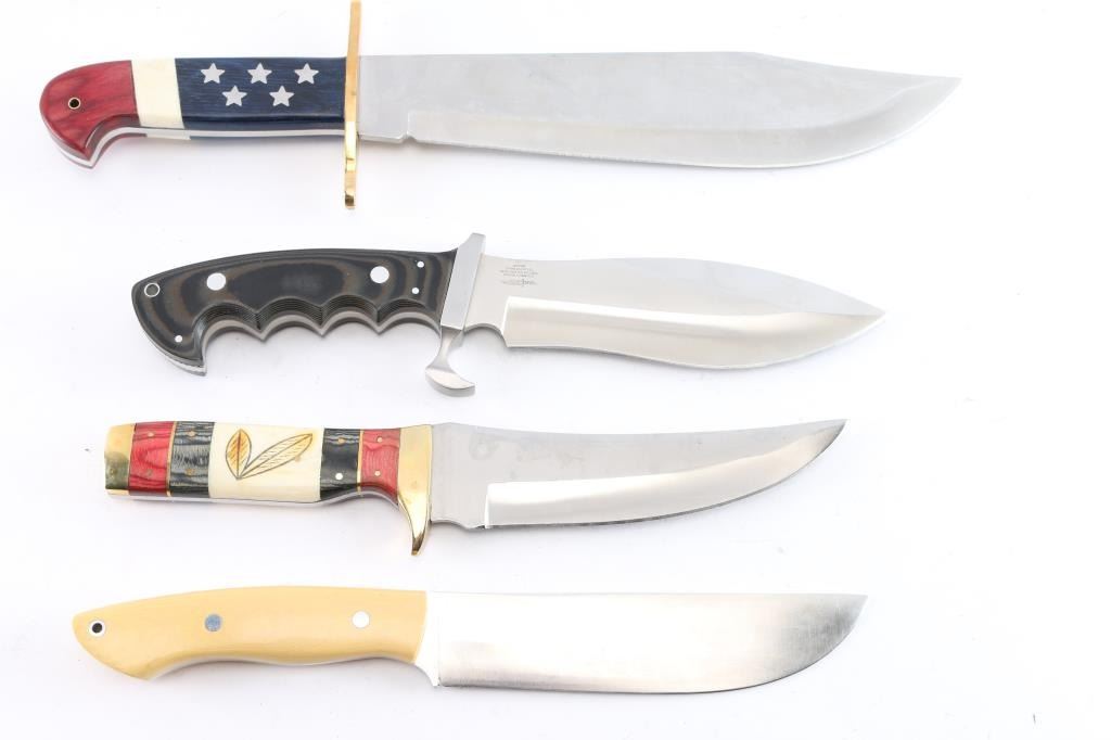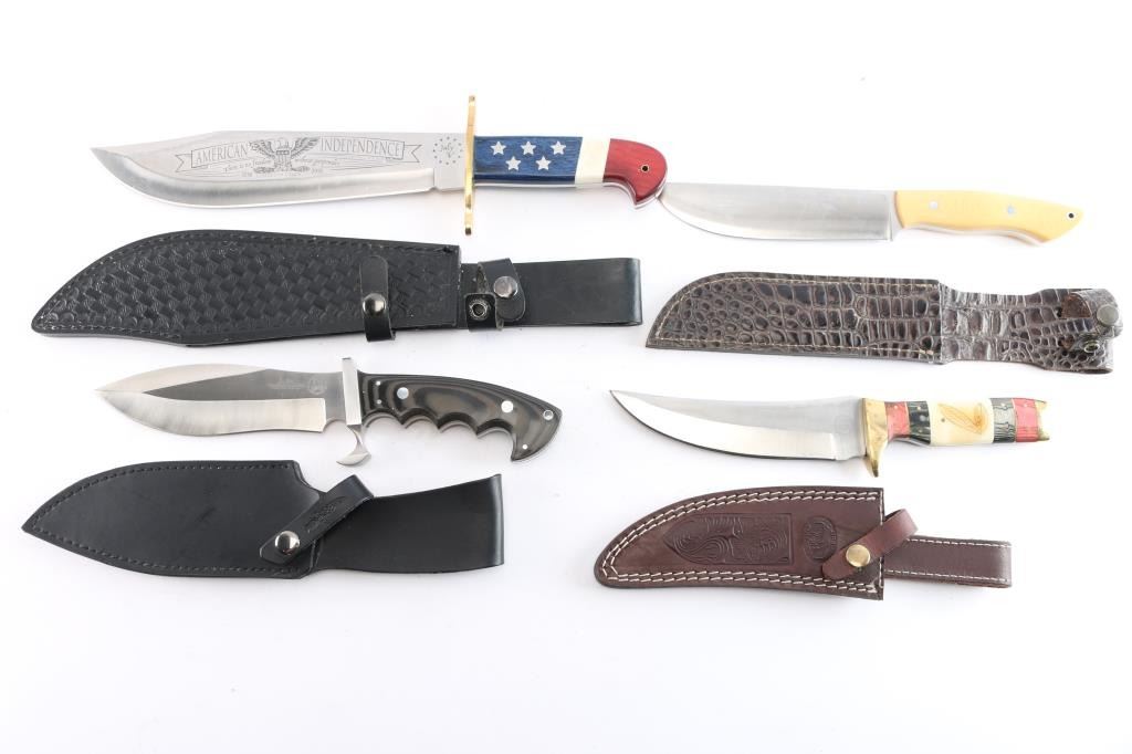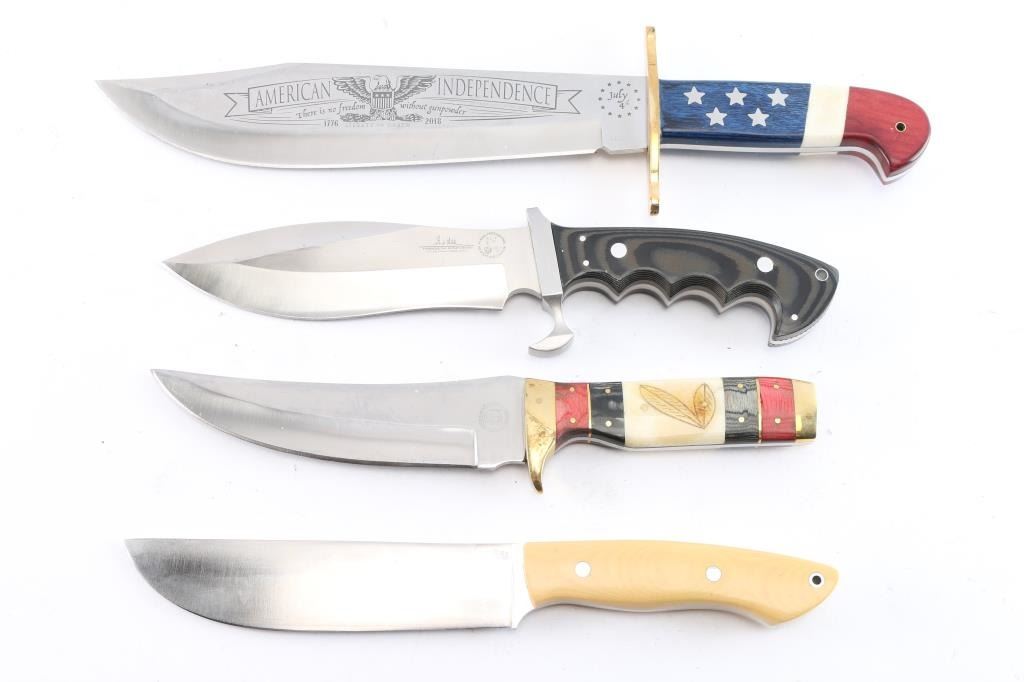 D. Limited edition "Billy Jack" style Bowie with American Independence Liberty or Death, 1776-2018, along with other patriotic motifs. #4442. 10 1/2" blade with red, white and blue grip with stars. Basket weave scabbard and near fine condition.