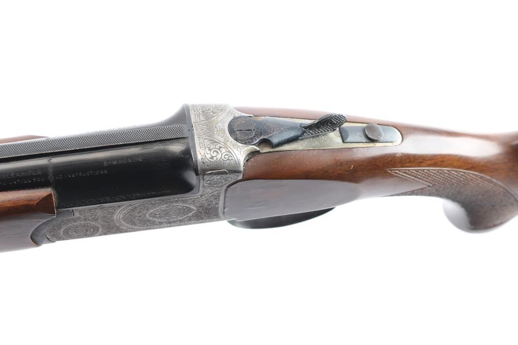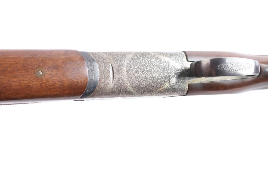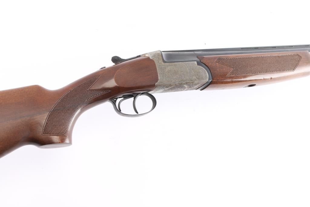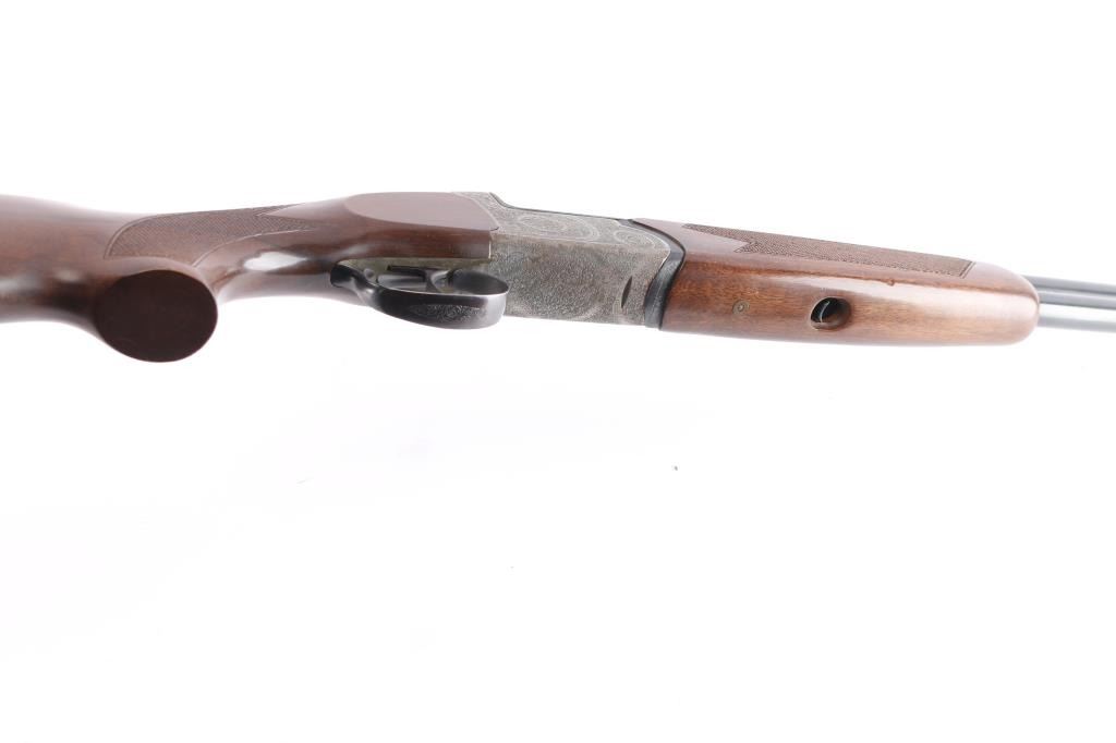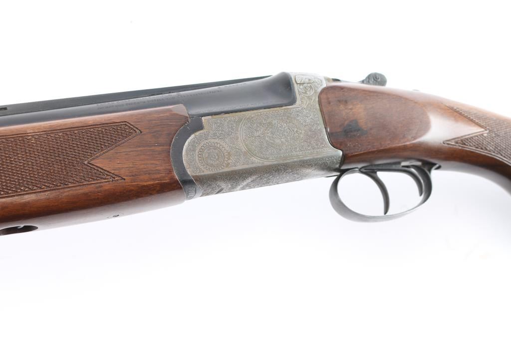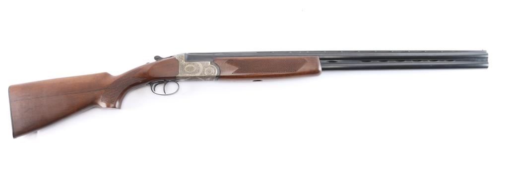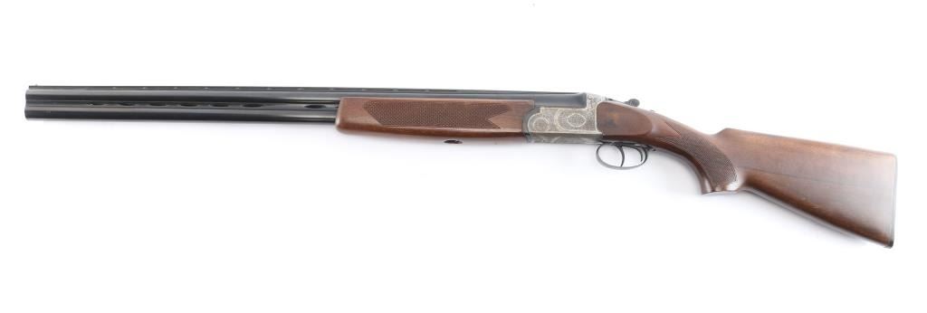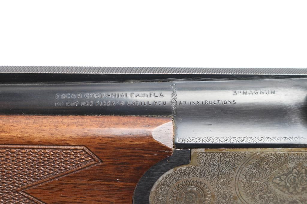 Over/Under Shotgun manufactured by Fabbrica Armi Fausti in Italy and imported, distributed by Excam in the US, barrel marked "Fabbrica Armi Fausti Stefano, Marcheno V.T. BS". 28" vent rib barrels, 3" Magnum chambers, double triggers, sliding tang safety, blued barrels, engraved coin receiver. Choked Cly over Full, LOP is 14 1/2" to front trigger. Bores are very good/bright, chambers need cleaning, barrels lock up tight, blue barrels are about 97% with minor edge/handling wear, coin receiver shows some handling wear turning a brown patina in places from handling wood is very good/sound with minor scratches/dings. Date code puts it at 1985.