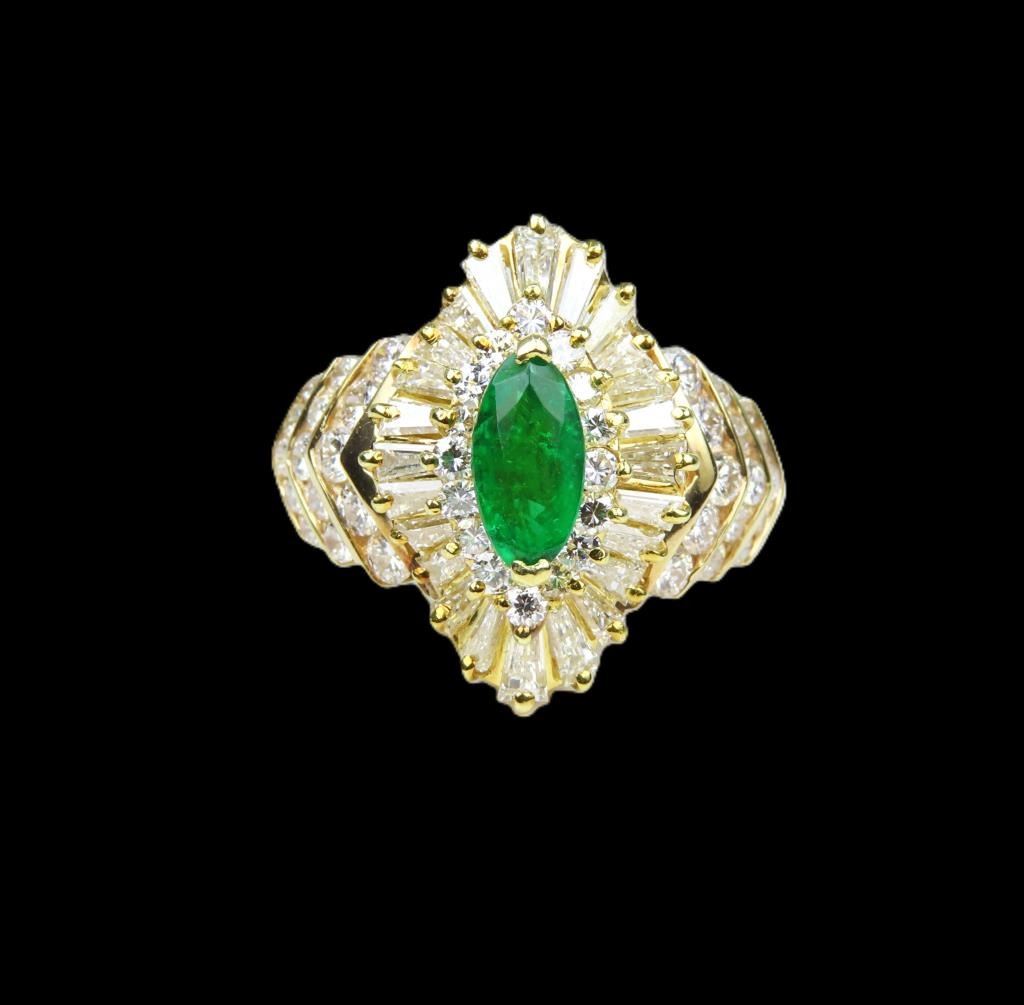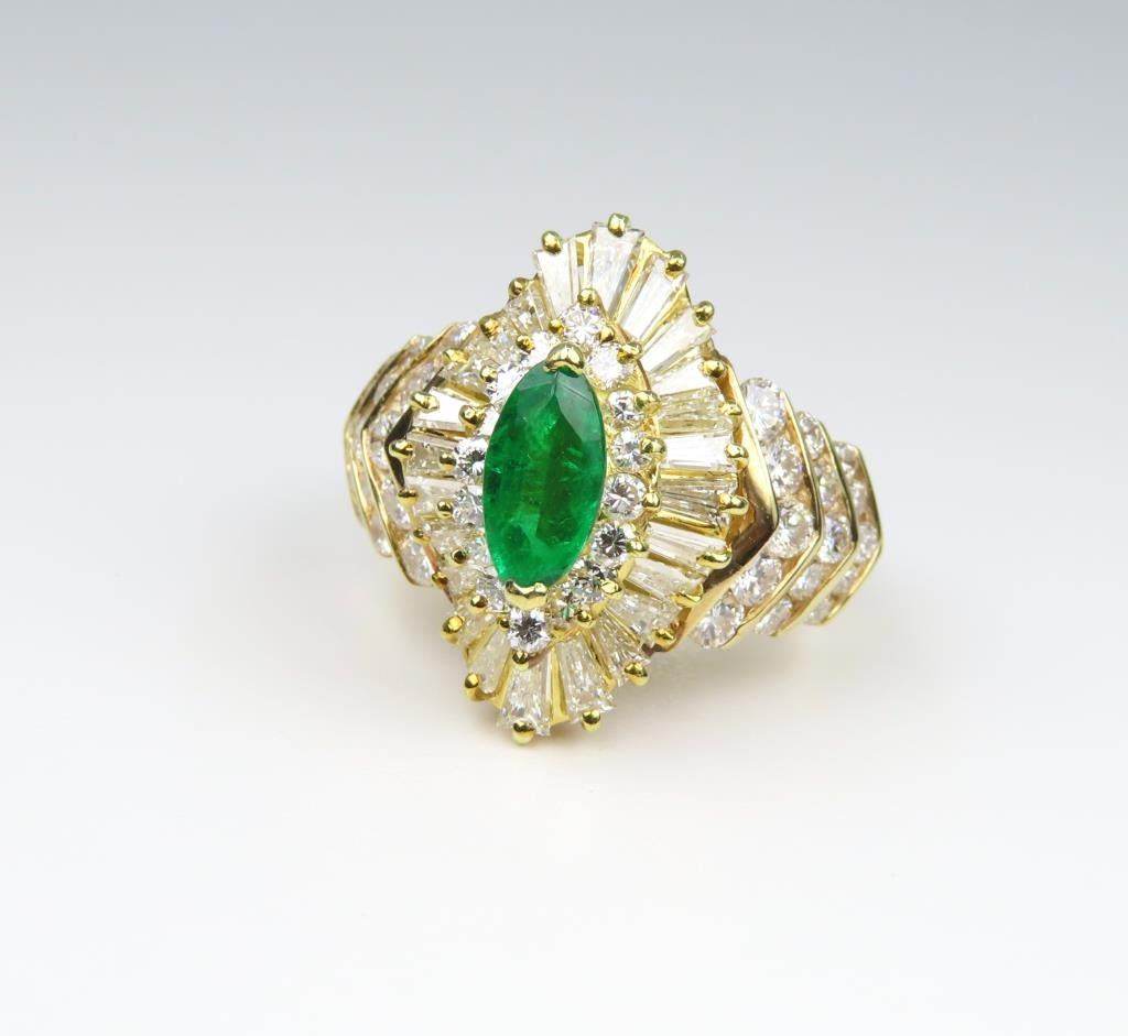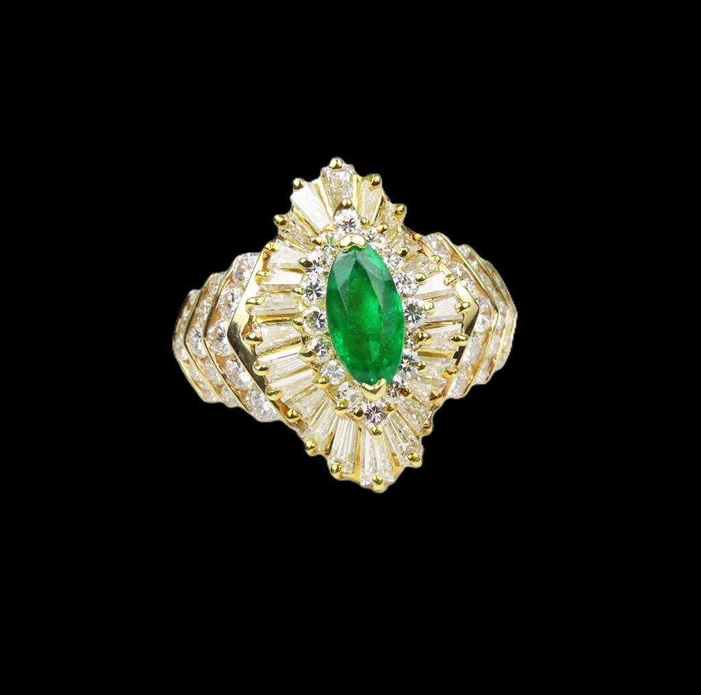 Featuring a vivid Green marquise cut Emerald weighing approx. 0.50 carats surrounded by 72 ‘IDEAL’ cut round and baguette cut Diamonds weighing approx. 2.00 carats with F-G colors and VVS/VS clarity set in a 14 karat yellow gold custom made designer setting, ring size 5 1/4. Full Retail Appraised Value - $11,000.00.