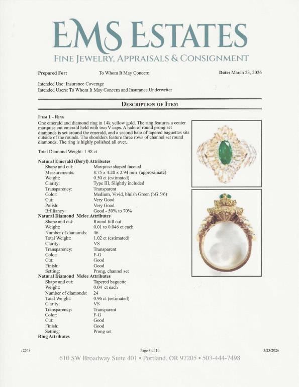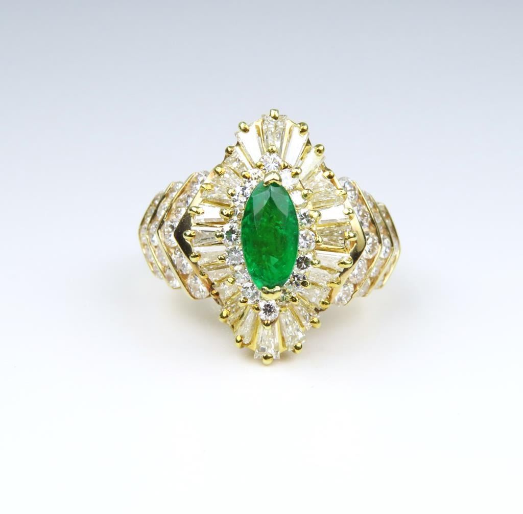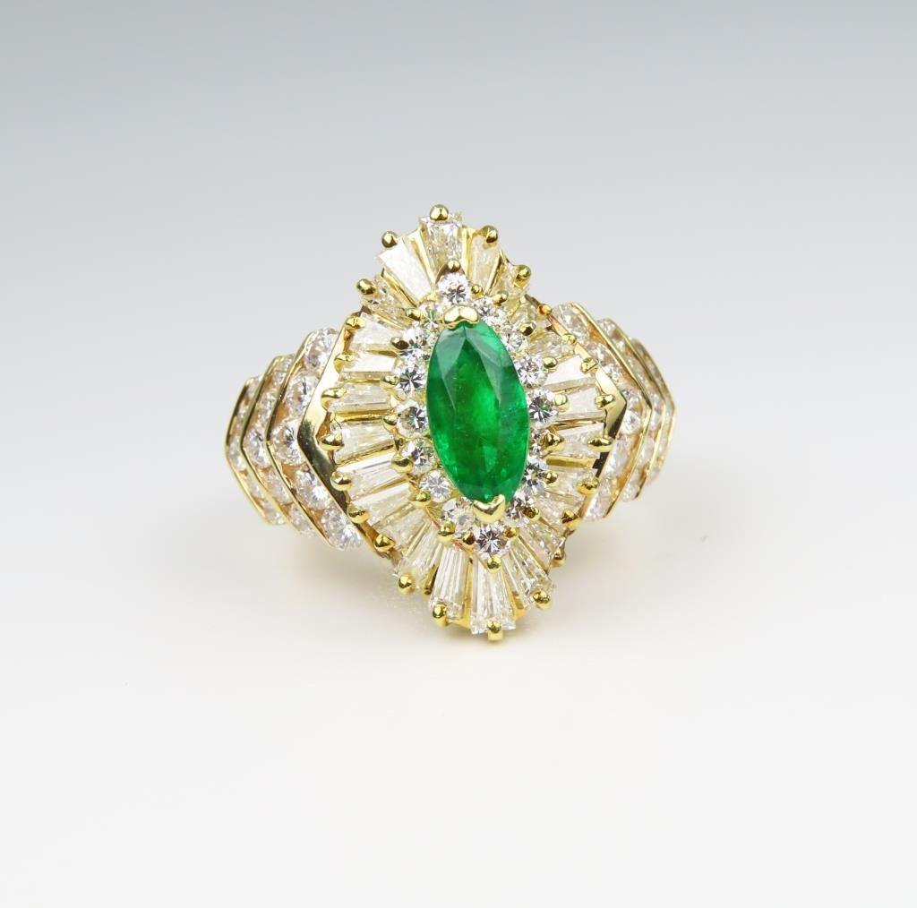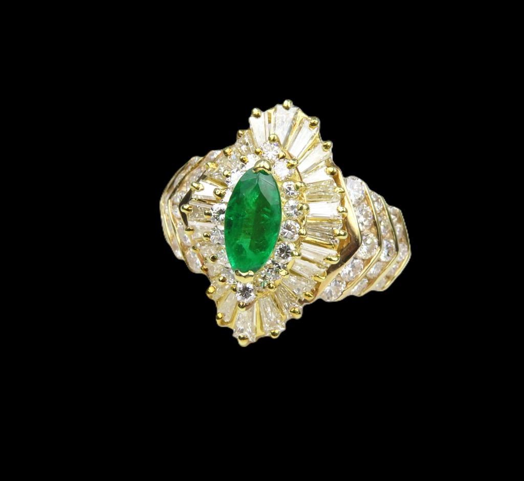 Featuring a vivid Green marquise cut Emerald weighing approx. 0.50 carats surrounded by 72 ‘IDEAL’ cut round and baguette cut Diamonds weighing approx. 2.00 carats with F-G colors and VVS/VS clarity set in a 14 karat yellow gold custom made designer setting, ring size 5 1/4. Full Retail Appraised Value - $11,000.00.