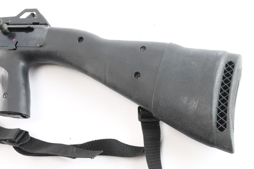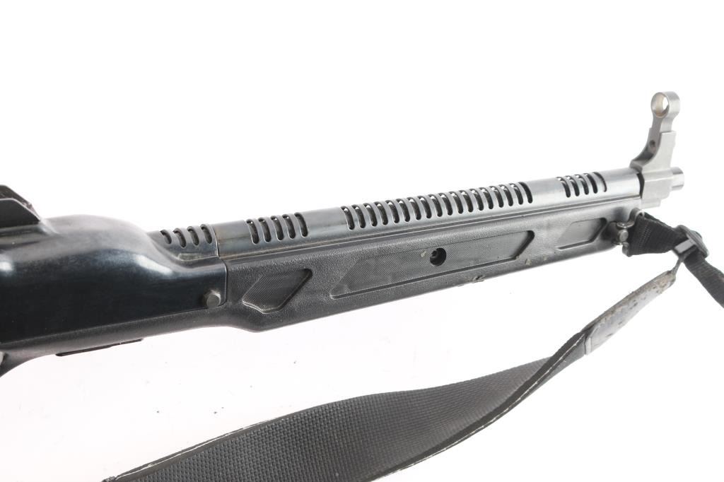 Economical magazine fed semi-automatic carbine rated for 9x19mm ammunition, manufactured in Mansfield, OH by Beemiller Inc. 16.5" barrel, protected post front, adjustable, protected peep sights, left side charging handle, smooth polymer trigger, thumb manual safety on the left side of the receiver, push button magazine release, black synthetic pistol grip shoulder stock, vented barrel shroud. Action and bore are excellent and the synthetic stock is fine. Includes (1) 10 round magazine. Black nylon sling and slip-on rubber recoil pad attached. Comes with extra black nylon sling and srope rail with screws.