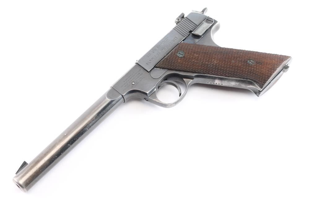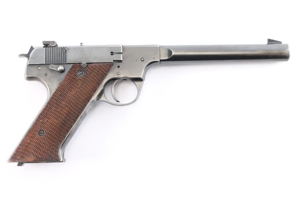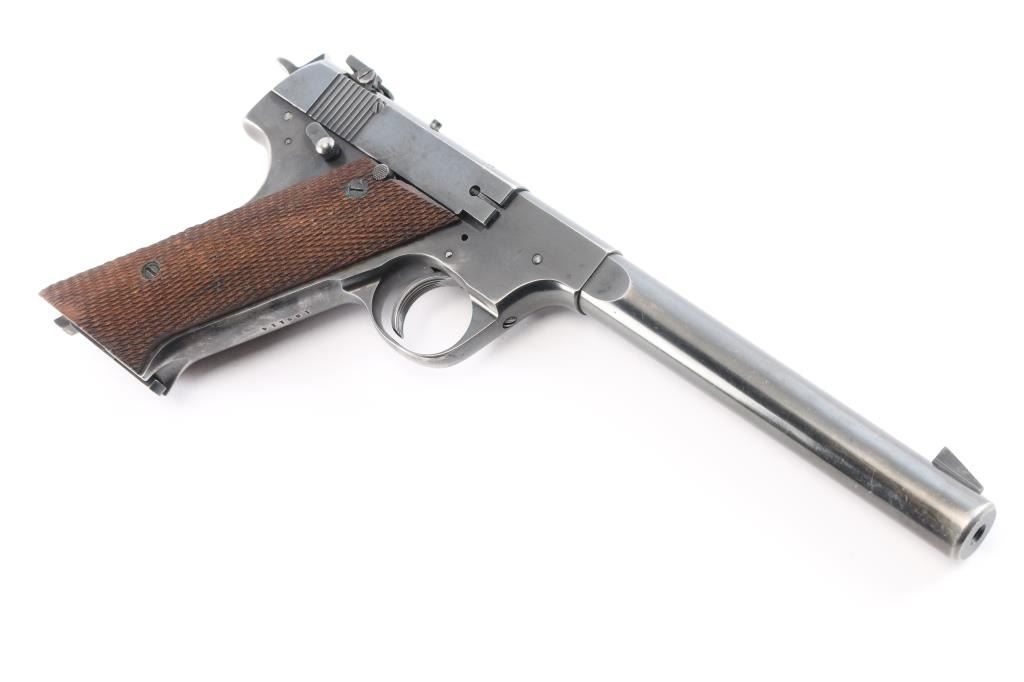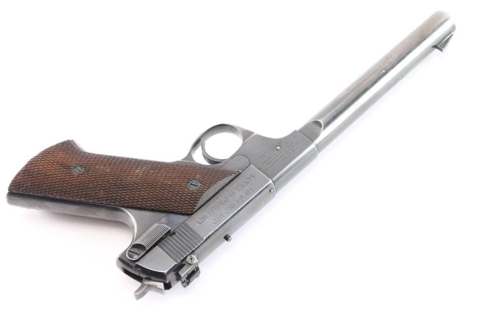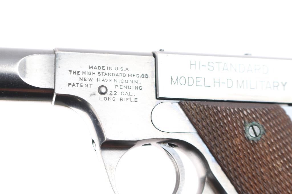 'Model H-D Military' an American made semi-automatic single-action rimfire pistol chambered in .22 Long Rifle, manufactured circa 1947 in New Haven, CT. Even though this pistol is dubbed 'Military,' it was not manufactured for the military. This is pretty much a copy of the 'Model H-D' with an external safety. Manufactured from 1945-1950, there were approximately 143,000 produced. Pistol features a gloss blued finish, 6.75" heavy round barrel, serrated fixed blade front sight, dovetailed micrometer adjustable notched rear sight (fully adjustable with elevation screw), serrated external manual safety, checkered slide stop lever mounted on the right side of the frame, 'type-II' takedown with a right-side frame mounted lever that has a knurled round pick-up, serrated heel magazine release, external hammer with checkered spur, and two-piece checkered walnut grips. The original blued finish retained is approximately 80% with thinning on the grip straps and barrel, scattered edge wear, and light scattered scratches. Metal displays some small spots of scattered rust, and some small nicks on the bottom of the barrel. Bore is bright with strong rifling and the action is smooth and crisp. Grips are very good condition with some minor wear, and a low spot on the checkering on the bottom of the right grip panel. The rear sight can be moved side-to-side by hand.