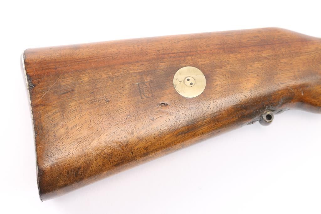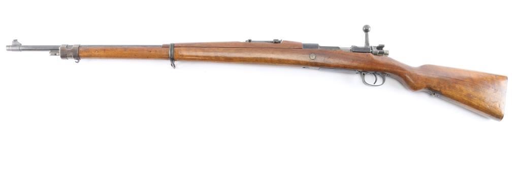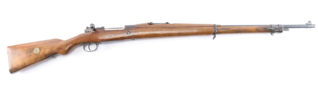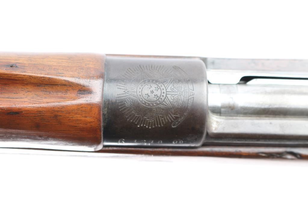 Brazilian Military contract bolt action rifle chambered in 7x57mm Mauser manufactured in Germany, and imported by Inter-American Import Company from Sacramento, CA. It features a blued finish, an approximately 29" barrel, raised dovetailed inverted 'V' front sight, tangent rear sight graduated to 2,000 meters, bayonet lug, in-the-white bolt with straight handle, three-position 'flag' type safety, smooth curved trigger, internal 5 round box magazine, two barrel bands with a 'H' style front, sling swivel on rear barrel band, and stripper clip guides cut into the receiver. Some markings include the Brazilian crest on receiver ring along with "Mod.1908" on the right side, and "DEUTSCHE WAFFEN-UND MUNITIONSFABRIKEN OBERNDORFa.N." on the receiver rail. The wood furniture consists of a smooth handguard, smooth metal buttplate, and a near full-length semi-pistol grip shoulder stock with a smooth forend. The inlayed brass disc has a number three on it. All observed serial numbers match. Rifle retains approximately 88% of it's original blued finish showing scattered edge wear, scratches, barrel bands turning brown, and thinning around the receiver. Action is smooth and crisp. The bore is dark and frosty with strong rifling. The crest is sharp, and the wood is very good with scattered minor scratches and dings.