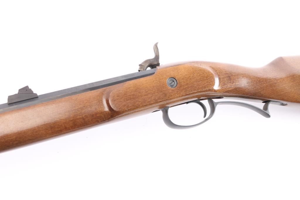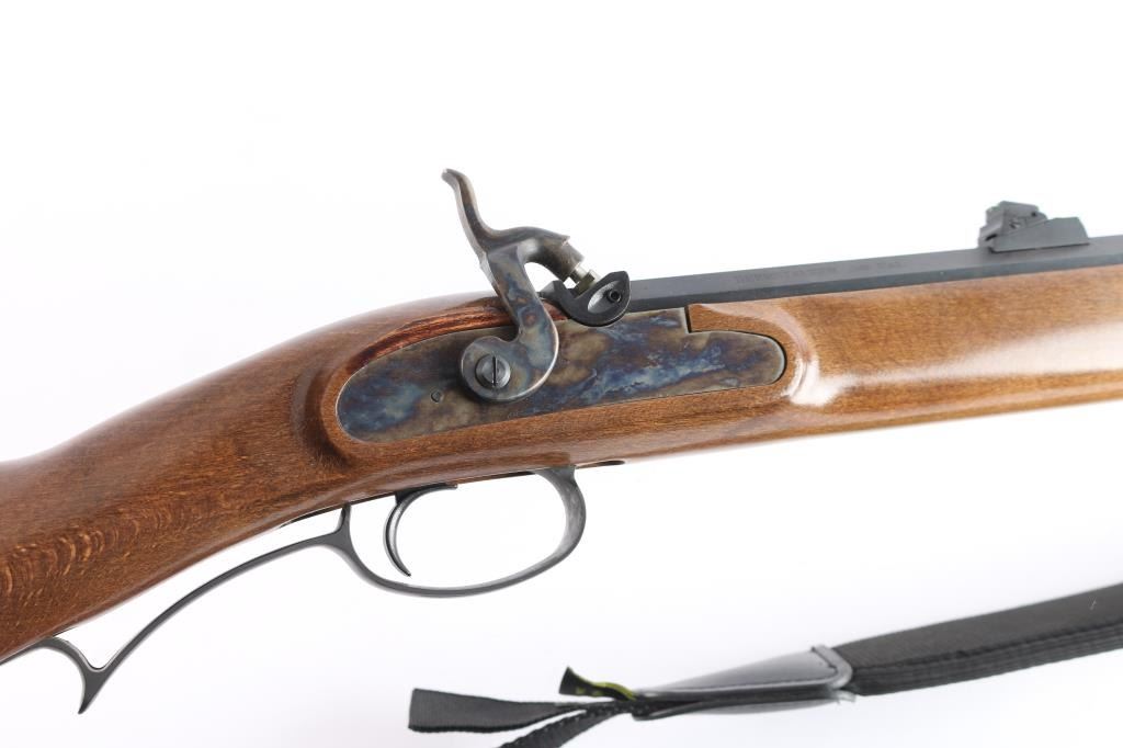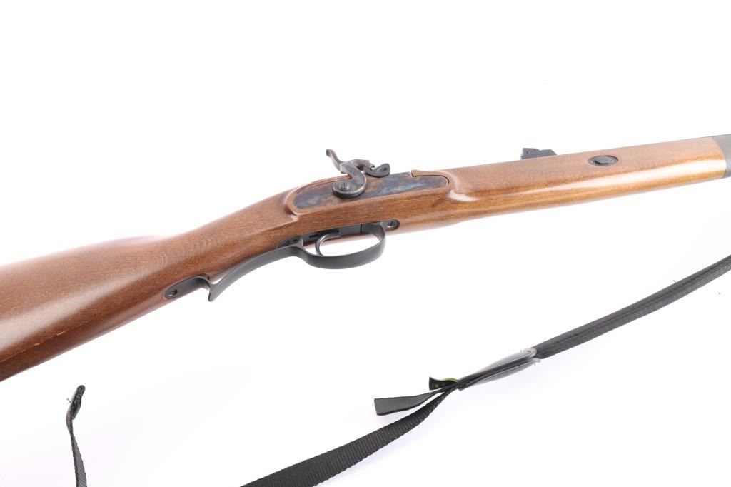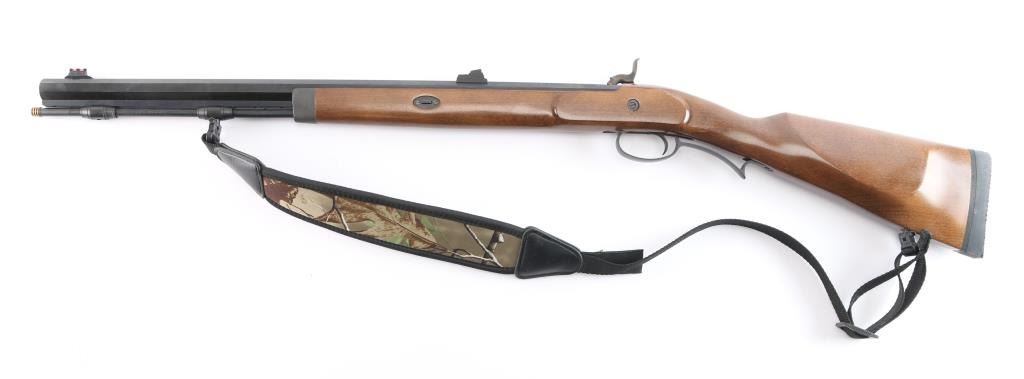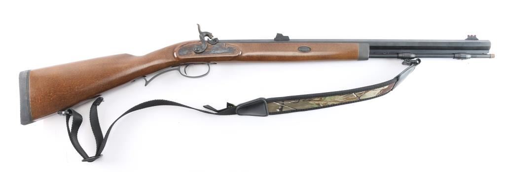 Manufactured in Italy by Investarm, imported by Lyman, Middletown, CT. .50 Cal. percussion rifle, 24 1/2" octagonal barrel. red fiber optic front sight, green fiber optic adjustable rear sight, blued barrel, case colored hammer and side plate, matte gray triggerguard & forearm cap, metal brass tipped ramrod Smooth walnut straight grip stock with right handed cheek rest, solid rubber recoil pad. Black nylon sling with camo pad attached. Two-cock hammer action is excellent, wood and finishes are excellent and the bore is excellent. Rifle is in like new condition. Comes with manual & documents.