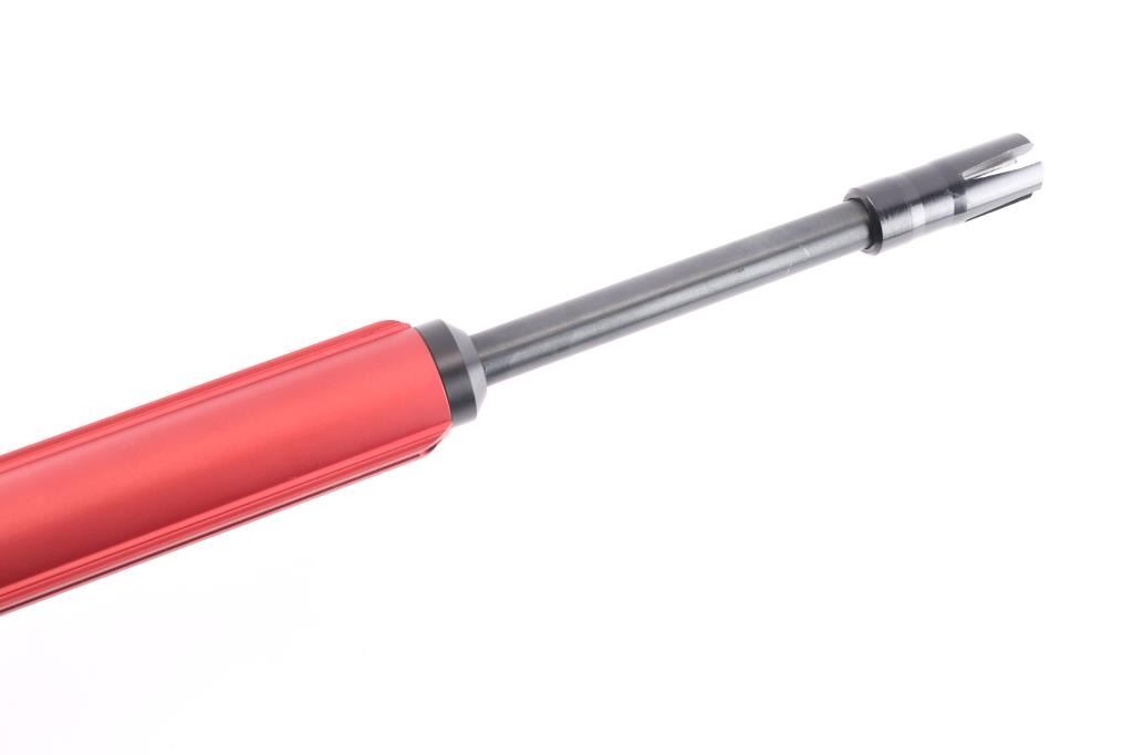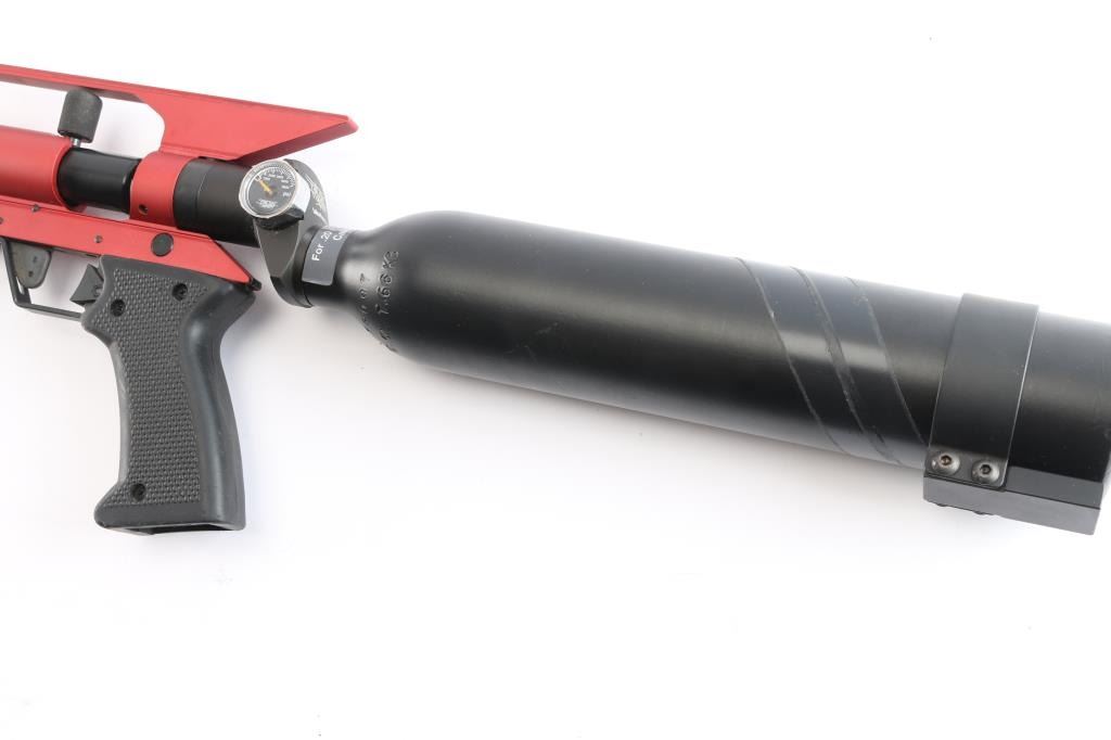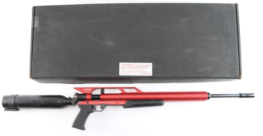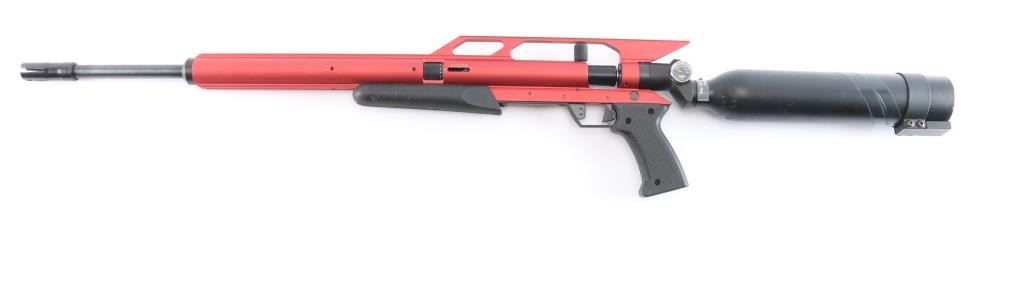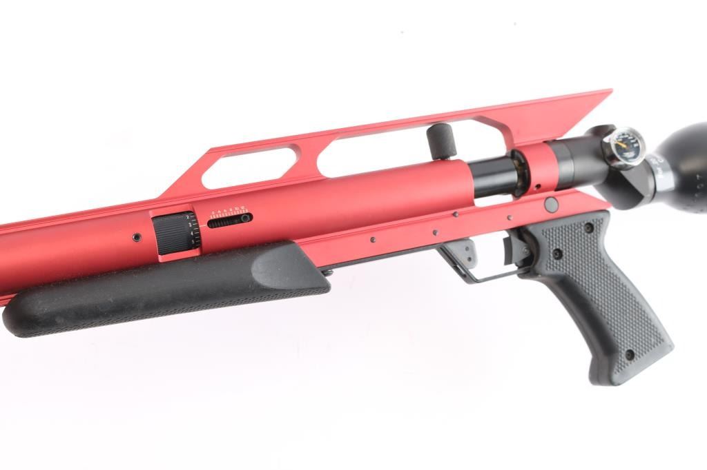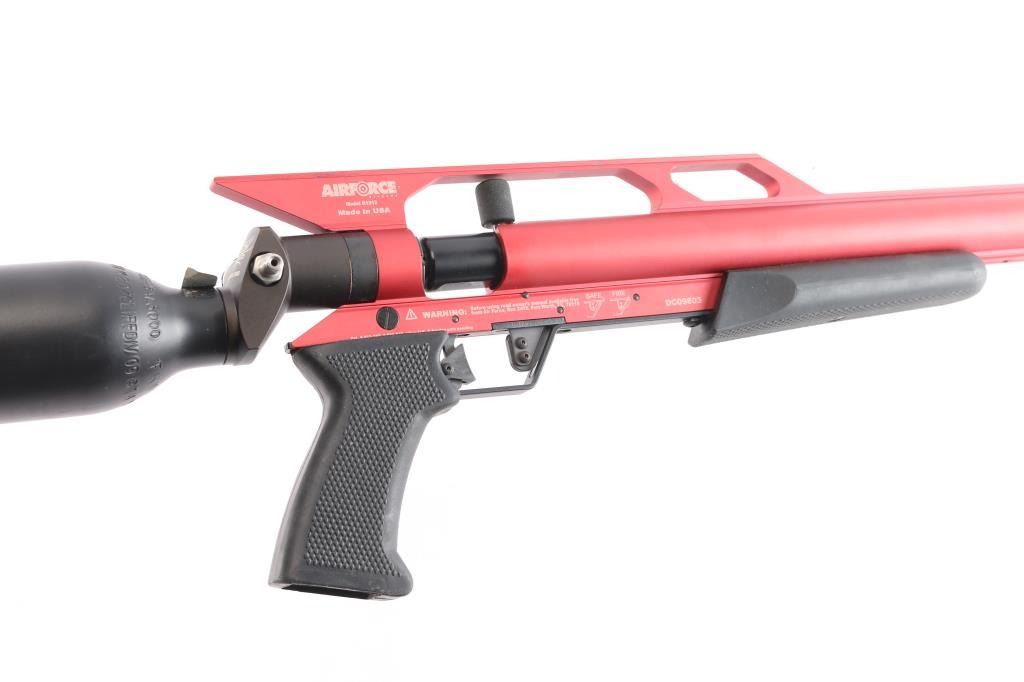 Model 1212. AirForce Condor SS PCP Air Rifle, Spin-Loc,, red finish, 22" threaded barrel with 4 prong muzzle break installed,105ft. lbs. of energy in .25 caliber, high velocity pneumatic system is recoilless, match grade precision barrel, light weight (6.5 lbs) .Comes with a Spin-Loc tank system featuring the Ring-Loc Valve system, and an integral extended scope rail. Tank system features a pressure gauge and refill nipple, manual safety in triggerguard, 2 stage adjustable trigger, checkered black rubber grip & forearm. Excellent, like new condition. Comes in factory box with matching label with manual, CD, buttplate and scope rings.
