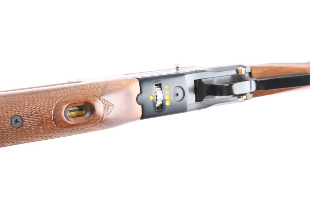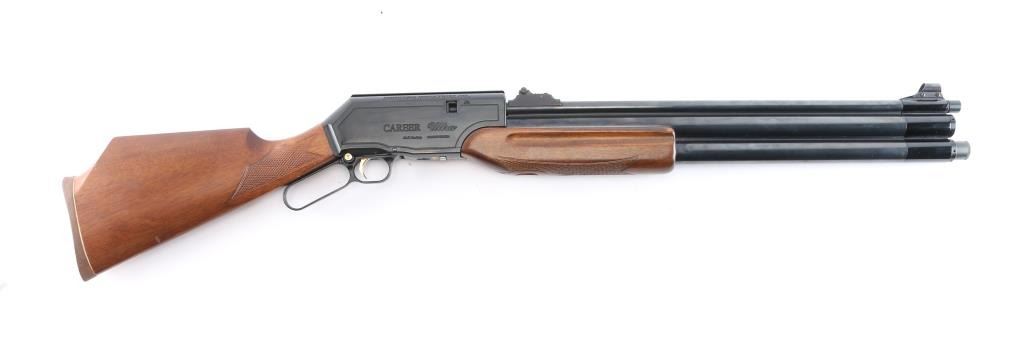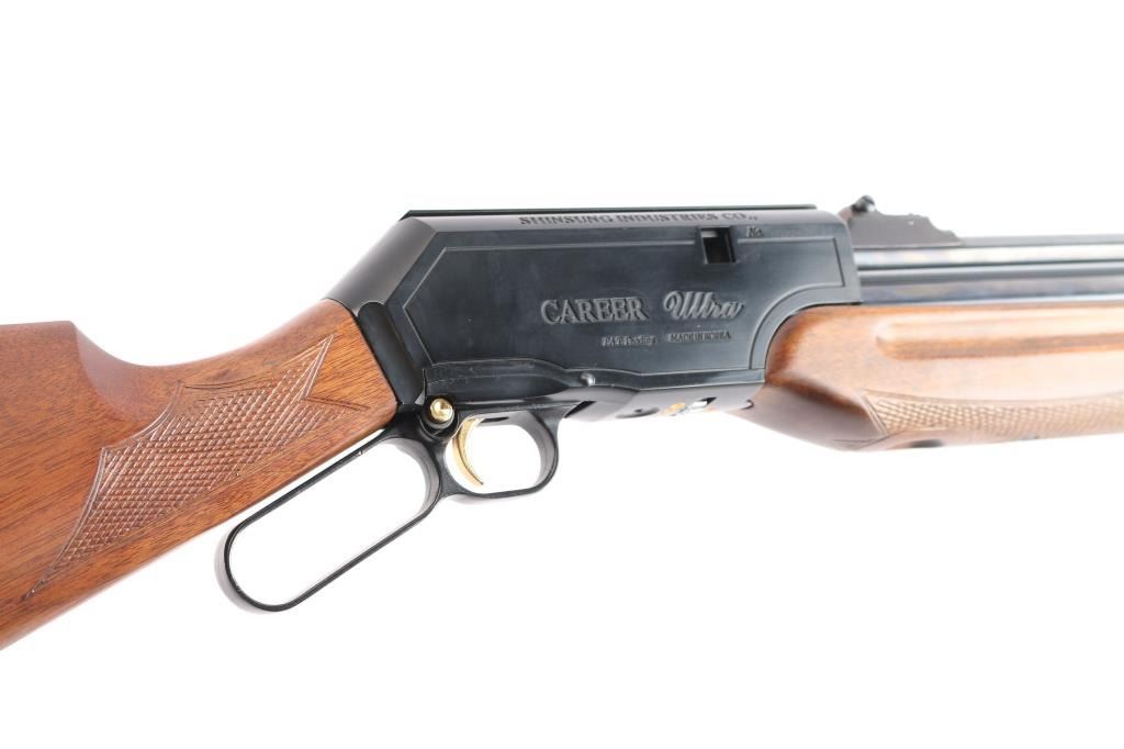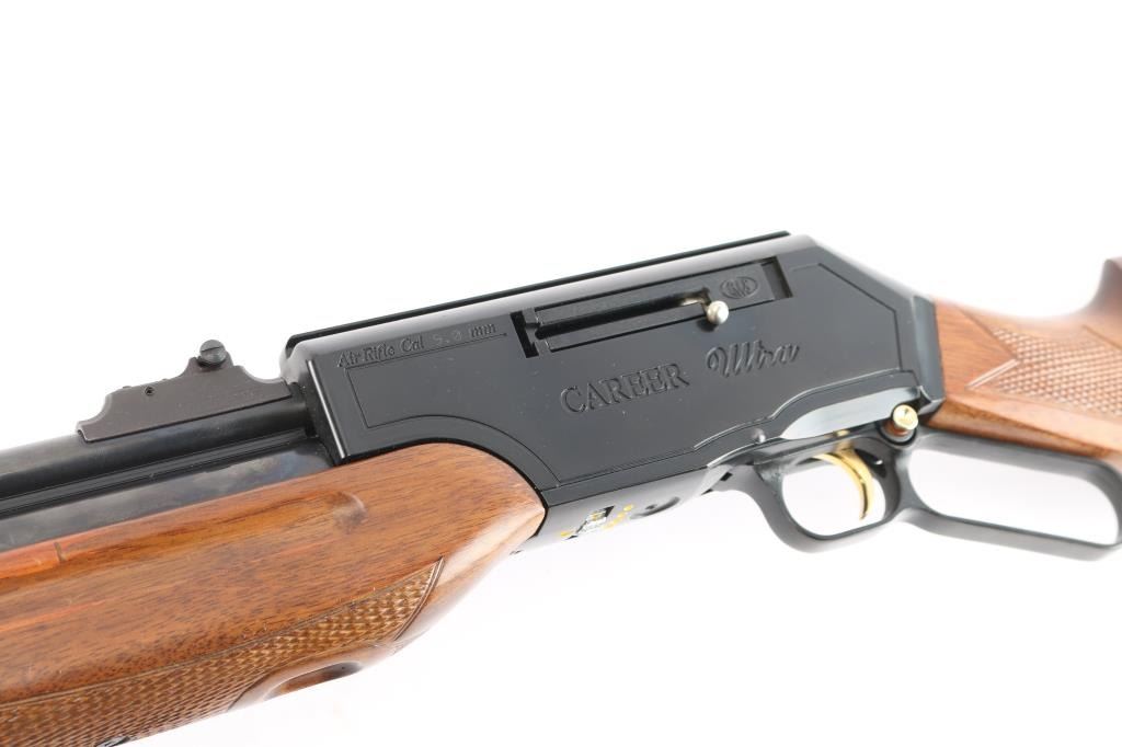 Career 707 9mm Ultra. Powerful, Korean-made PCP air rifle, underlever cocking mechanism, Designed for small game hunting and plinking, 9mm (.35 cal) accurate shots up to 50 yards. Pre-charged Pneumatic (PCP), capable of firing ~70-grain round balls, with effective range for hunting around 50 yards. Features an adjustable power wheel to tune velocity on underside of receiver. checkered hardwood stock, factory rubber recoil pad, cheek piece, hooded blade front sight, fully adjustable rear square notch sight, gold toned trigger and safety button. underlever that feeds from a tubular magazine or manual feed. Excellent Condition.