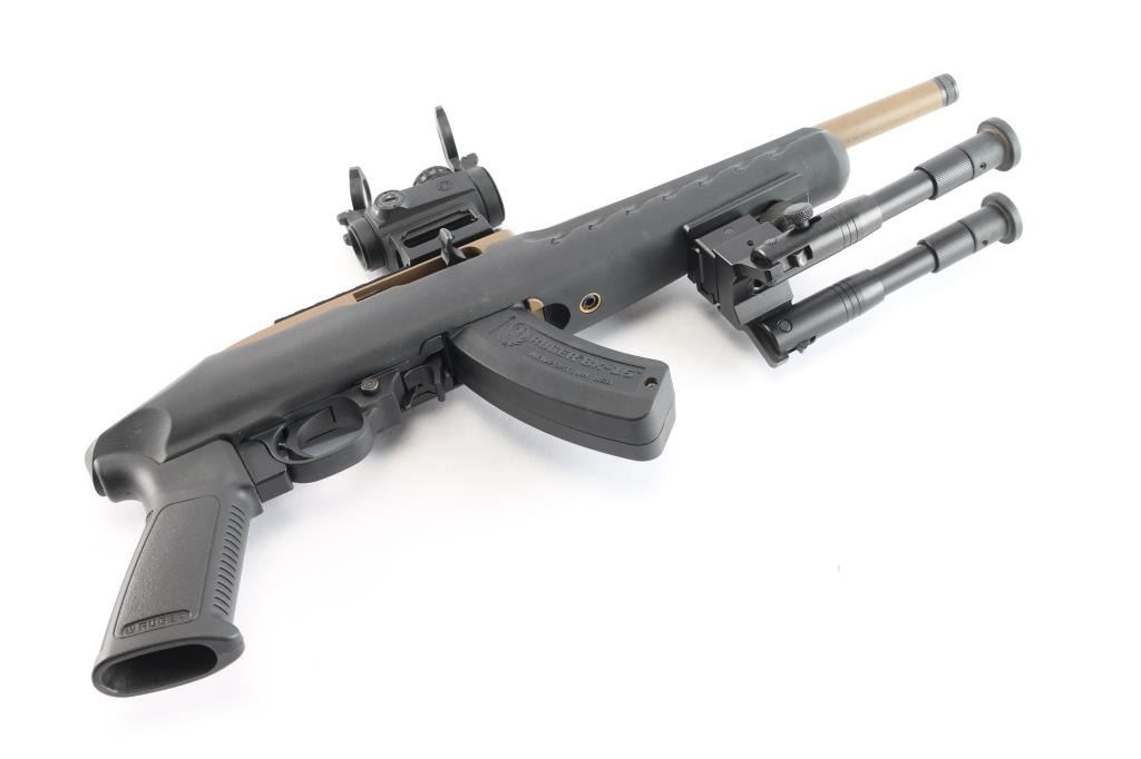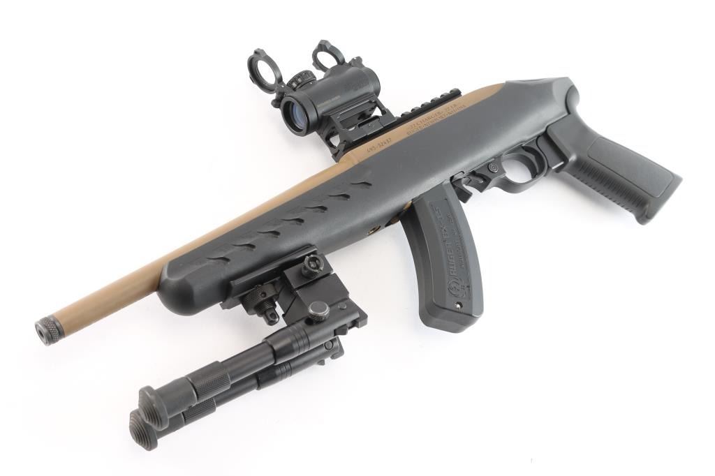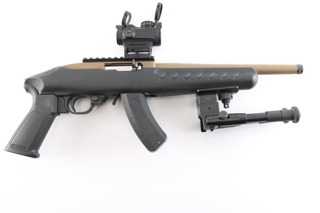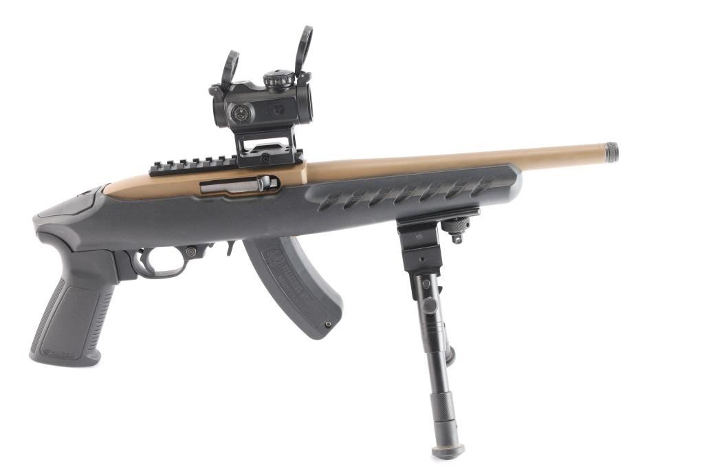 Semiautomatic pistol features a burnt bronze cerakote finish, 10" barrel with threaded muzzle & thread protector, scope rail on receiver top, accepts detachable magazines, manual safety, black polymer stock with pistol grip, sling stud and factory adjustable bipod installed under forearm. Mounted with a nice Sig Sauer Romeo-MSR green dot sight, good working order. Overall condition is like new with few signs of handling, bore is pristine. Includes (1) factory 15 rd magazine.