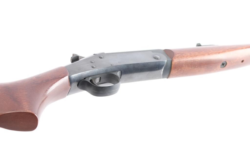 SN: NN290181. "H&R 1871 Handi-Rifle" refers to the modern line of single-shot rifles produced by New England Firearms after the original H&R went out of business. Modular break-open single-shot rifle with a .45-70 chambered barrel. Features a blued receiver, matte barrel, 22" medium-contour barrel with recessed crown with ramped blade front and micro adjustable square notch rear sights, barrel drilled/tapped for optics, smooth trigger, schnabel wood forend and semi-pistol grip shoulder stock with factory vented recoil pad, right side of stock has inletted brass disk reading "H&R 1871 Limited Edition". Rifle retains approximately 95% of its finish showing scattered handling marks/scratches. Barrel locks-up tight, the bore is excellent/bright, wood stocks are very good/sound with some handling loss to the finish. Comes with factory box with matching label, manual. Box has some water staining.