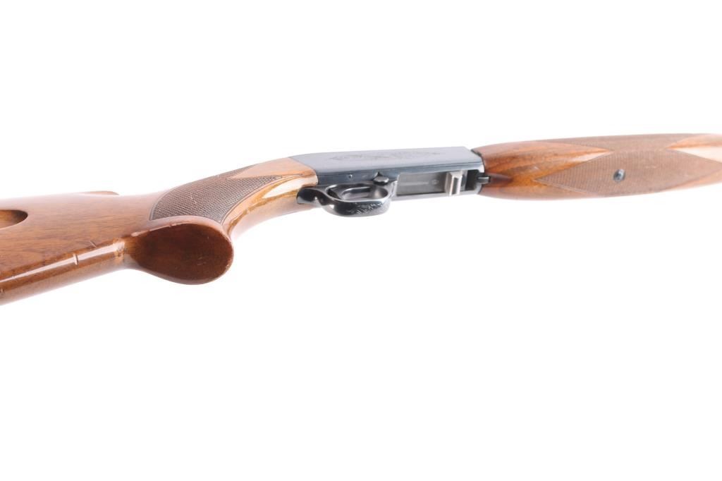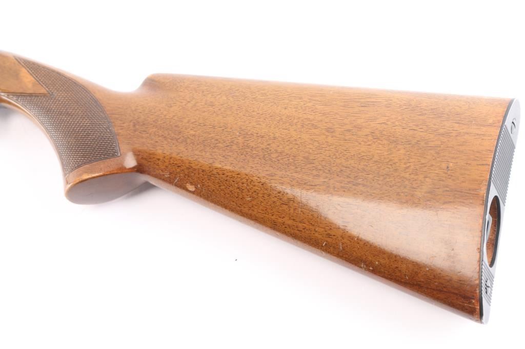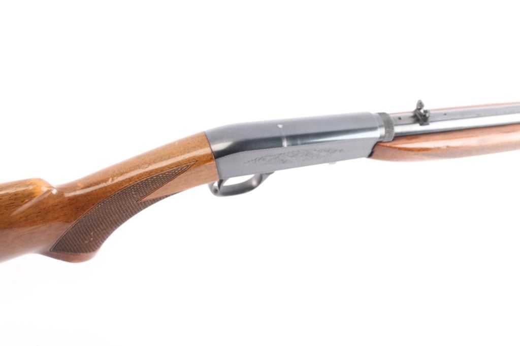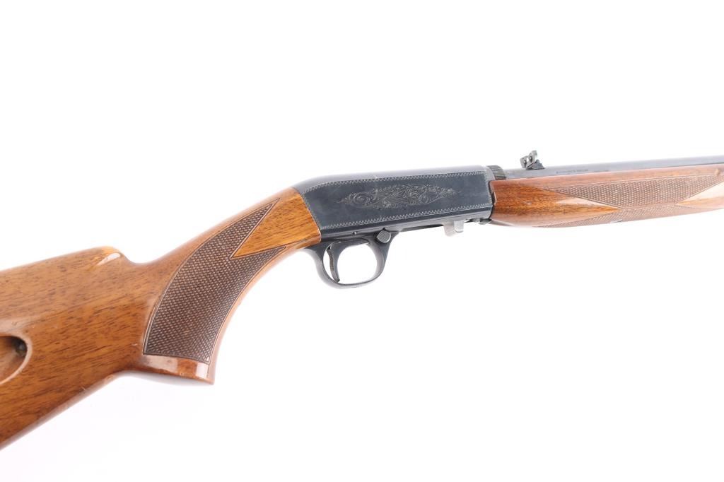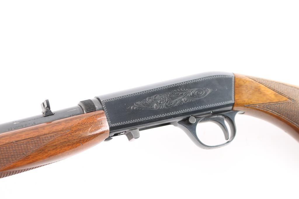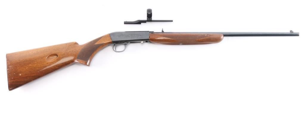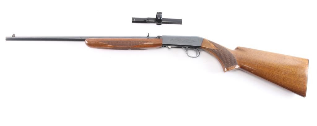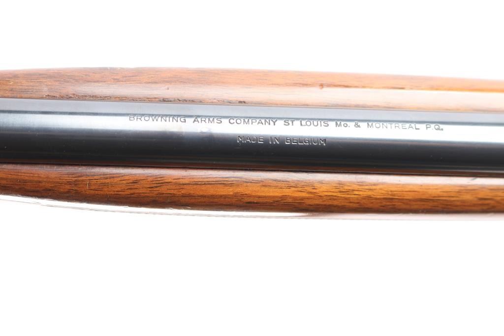 "Grade I" Semiautomatic rifle made by FN Herstal, Belgium, and imported by Browning Arms Co, St. Louis, MO., & Montreal P.Q. circa 1968. It features a take-down barrel, blued finish, 19" barrel, blade front sight with brass bead, adjustable sporting flip-up rear sight, magazine tube in butt, serrated steel buttplate, and push button safety. The funiture consists of a checkered walnut butt with checkering around the wrist, and checkered forend. The barrel is drilled and tapped for optics mounting. Receiver is engraved with limited coverage of floral scrolls, and edge patterns. The rifle retains approximately 92% of its blued finish with edge wear at the muzzle, losses on top of the receiver and barrel from optics mounting, and thinning and scratches along the top of the barrel. The high-gloss wood furniture is good with several minor scratches and dings. The bore is bright with strong rifling. This rifle includes a scope mount with one ring and parts.