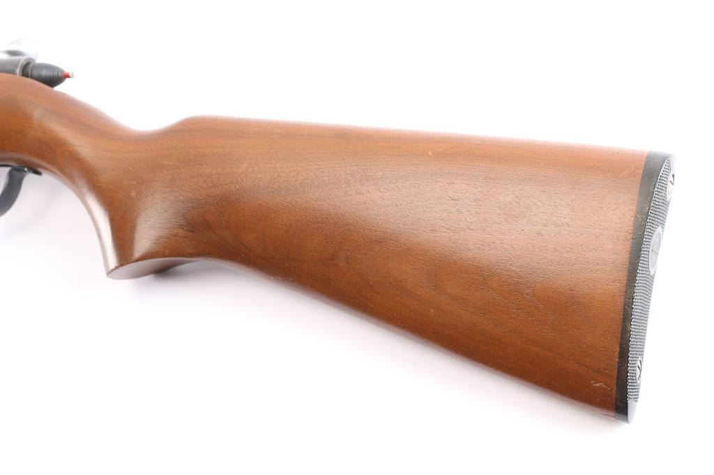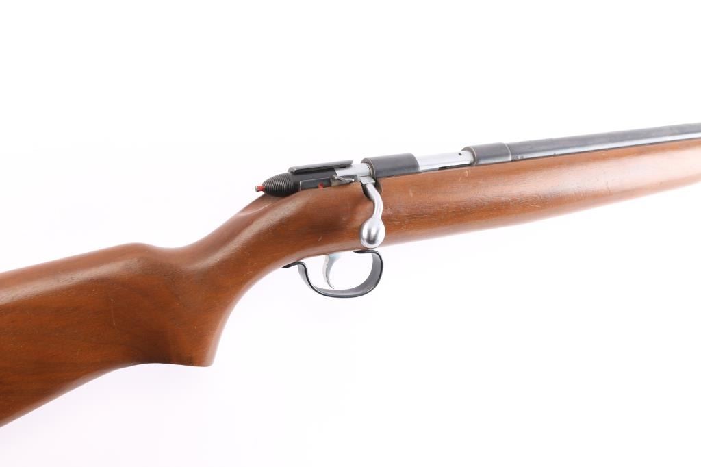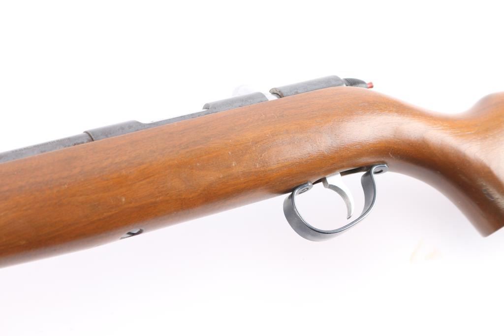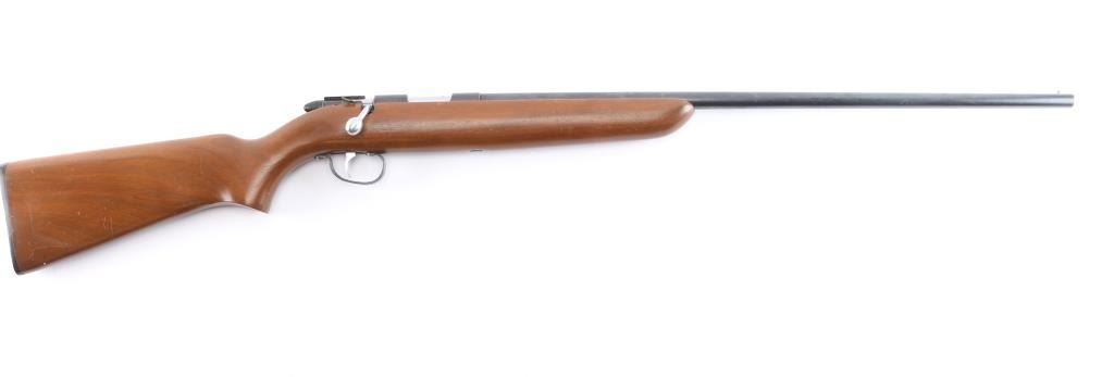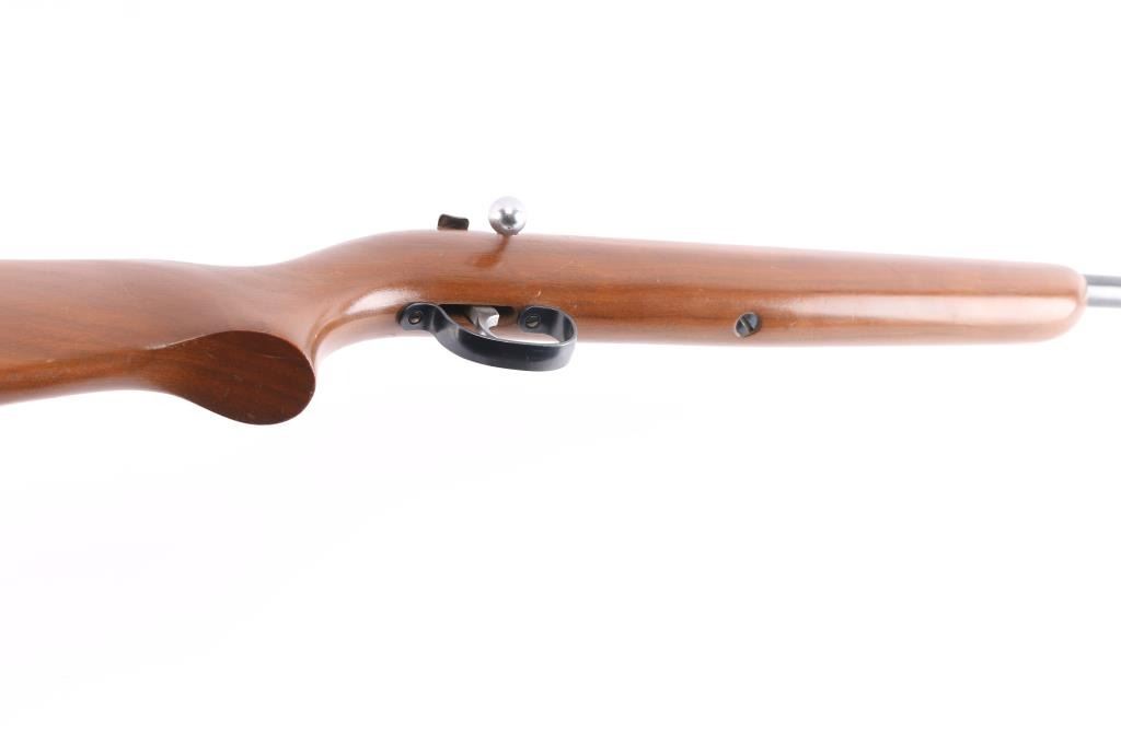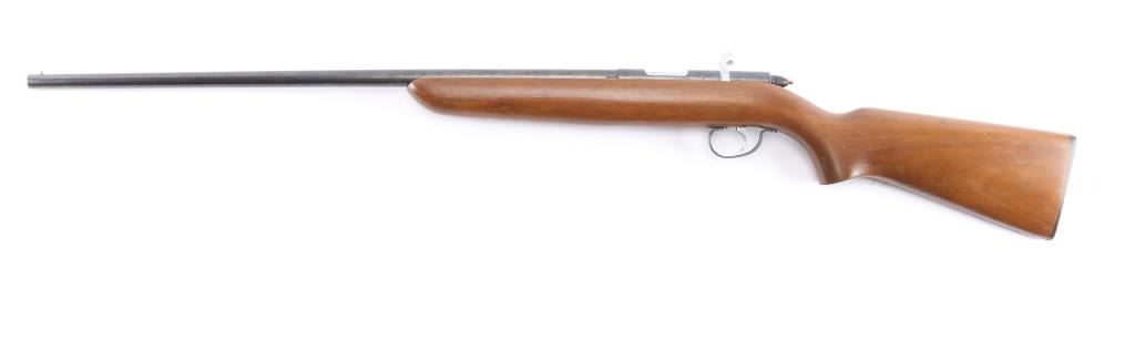 Vintage 'Target Master' Bolt action single shot rimfire rifle. Smoothbore to optimize performance with .22 caliber rimfire shotshells. These smoothbore barrels were designed for short-range pest control (vermin), wing shooting, and "Mo-Skeet-O" clay target shooting, features blued finish, 25" smoothbore barrel, wood semi-pistol grip stock, factory composite buttplate, bead front sight, no rear sight, cocking indicator, manual safety. Manufactured 1951. Bore is excellent/bright. Blued finish is about 98%. Wood is near excellent with some very minor scratches.