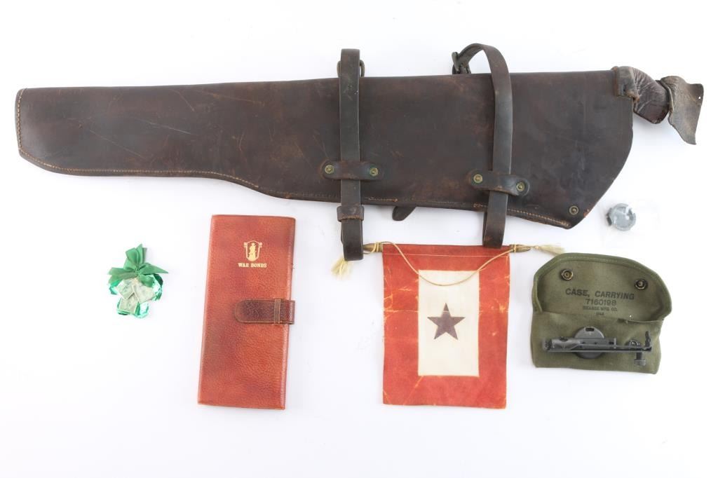 Marked: "U.S., Hotze 1942". Attached to horses, Jeeps, motorcycles, and other vehicles. The leather fastening straps are part of the rigging for the McClellan Saddle. Very good used condition. The stitching is intact, all rivets are present, and the original galvanized finish on the cocking lever guard is very good. 3) Original Gold Star flag for the families of those killed in action, complete. 4) WW2 era red leather War Bonds holder, complete.