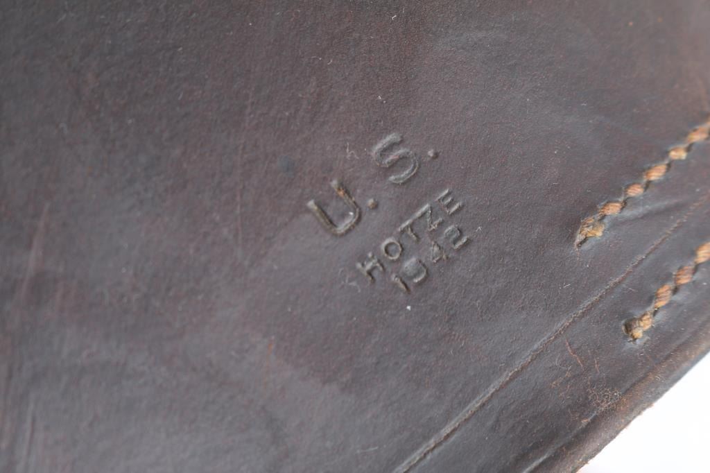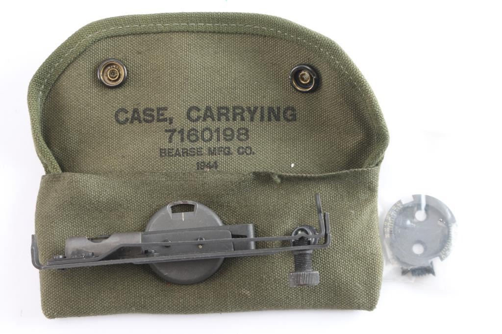 Includes: 1)WWII Grenade Launcher Sight M15 for M1903 Carbine M1 Garand. Complete, with mount, prism intact, includes original instructions. In 1944 Bearse OD canvass carrying case. 2) WW2, 1942 Dated M1 Garand Rifle Leather Scabbard by Hotze with Leather Rigging for the McClellan Saddle, 35" tall.