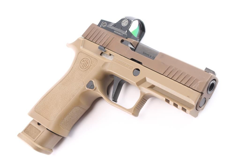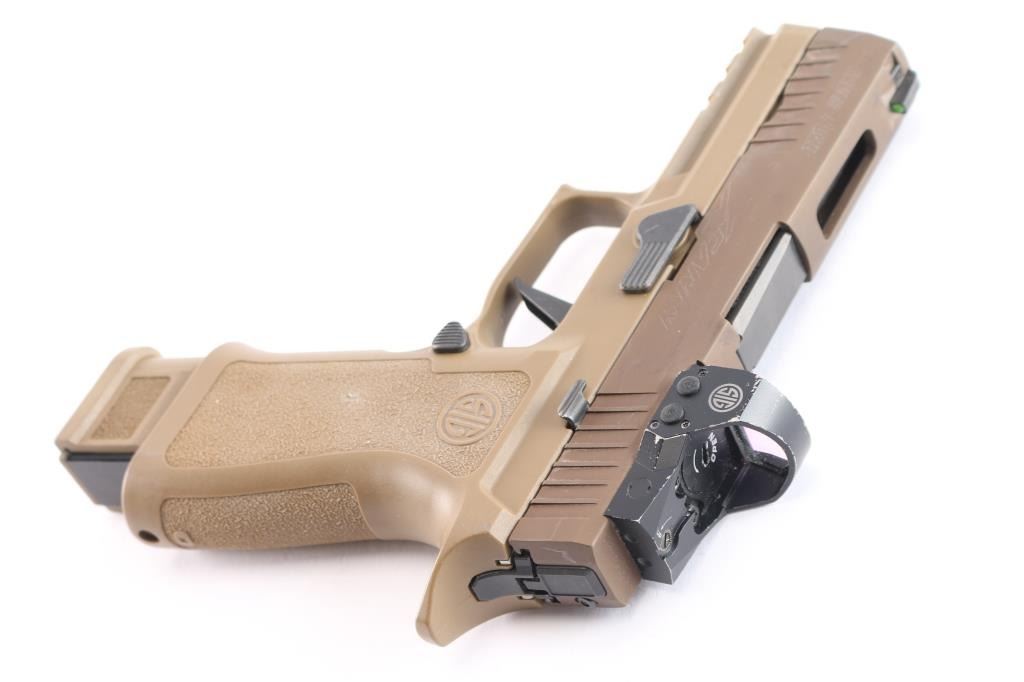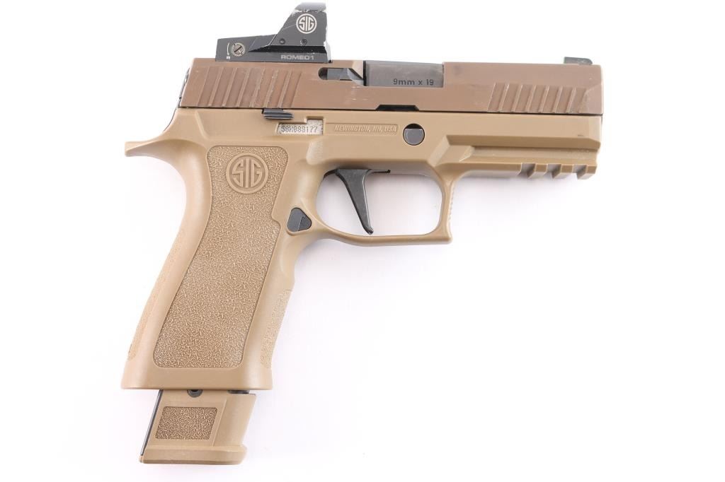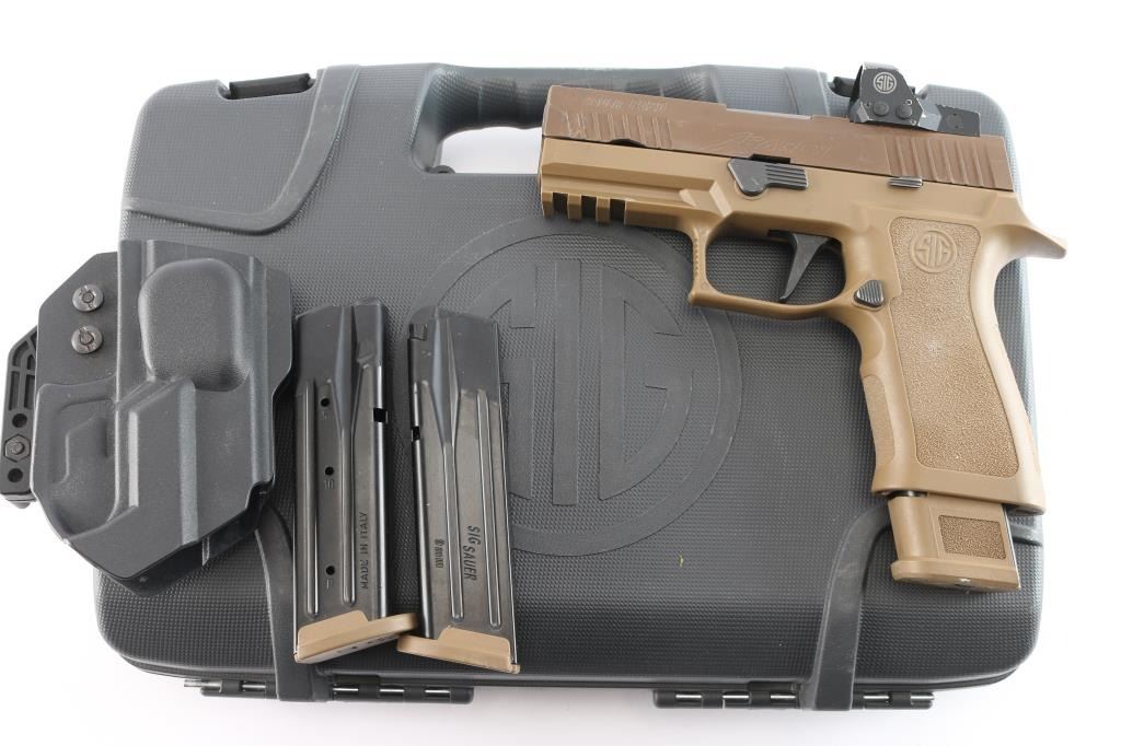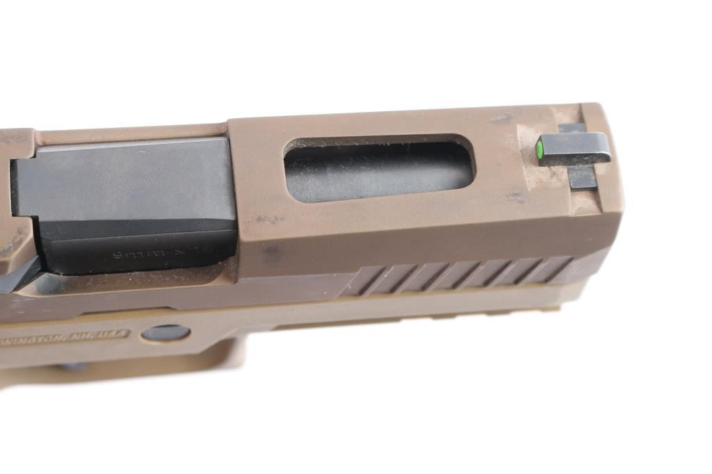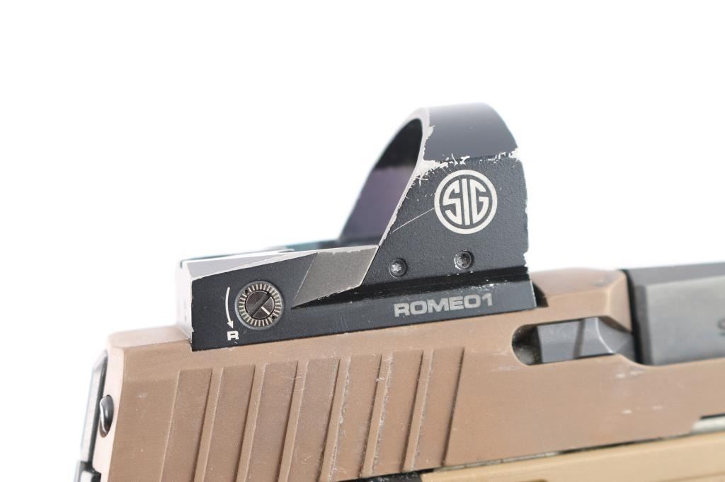 American made semi-automatic striker-fired pistol chambered for 9x19mm, manufactured circa 2019 in Newington, NH. Pistol features a Flat Dark Earth (FDE) finish, an approximately 3.9" barrel, dovetailed tritium front sight (glowing), installed Sig Sauer Romeo 1 red dot optic (operational), optics cut slide (rear sight is part of the missing original flush cover plate), slide ported on the top, matte black controls, smooth matte black flat-faced trigger, accessory rail on dust cover, serrated push-button magazine release, factory seventeen and twenty-one round magazines, ambidextrous serrated slide stop, undercut trigger guard, flared magazine well, extended beavertail, and stippled FDE polymer grip module with Sig logos. Pistol retains approximately 94% of its original FDE finish with scattered light scratches, material transfers, and edge wear. Metal displays no rust or deformation. The action is smooth and crisp. The bore is bright with strong rifling, but needs to be cleaned. The polymer grip module is also excellent with a white residue in spots. The Romeo 1 optic works well, but is very scratched with edge wear. Pistol includes the original factory foam lined hard case with matching end label, three OEM magazines total, and a black right-handed Kydex TXC holster.