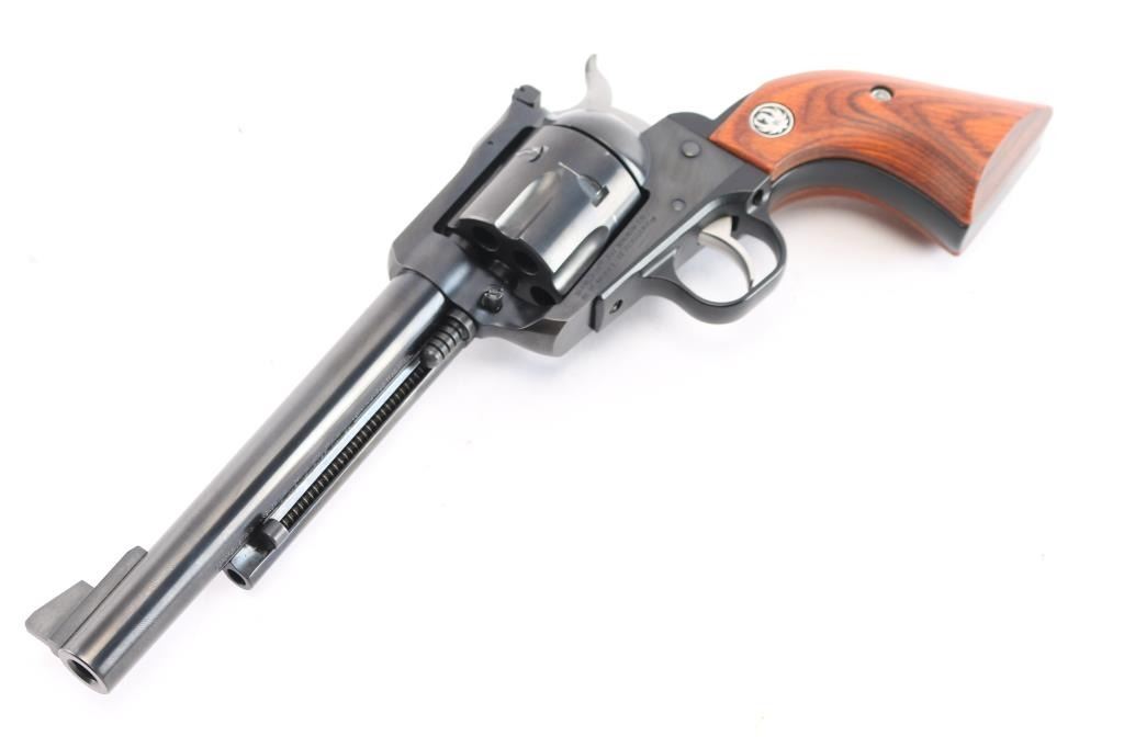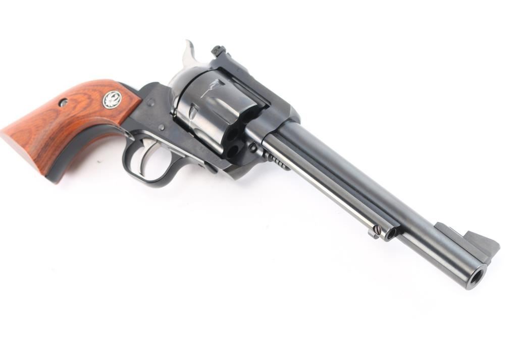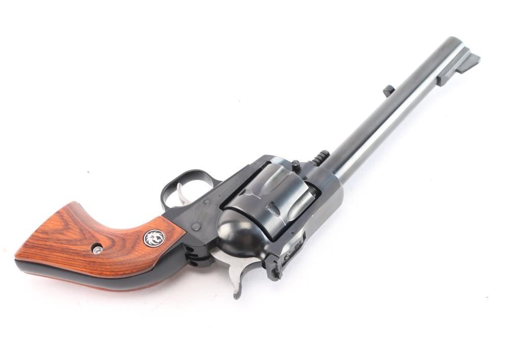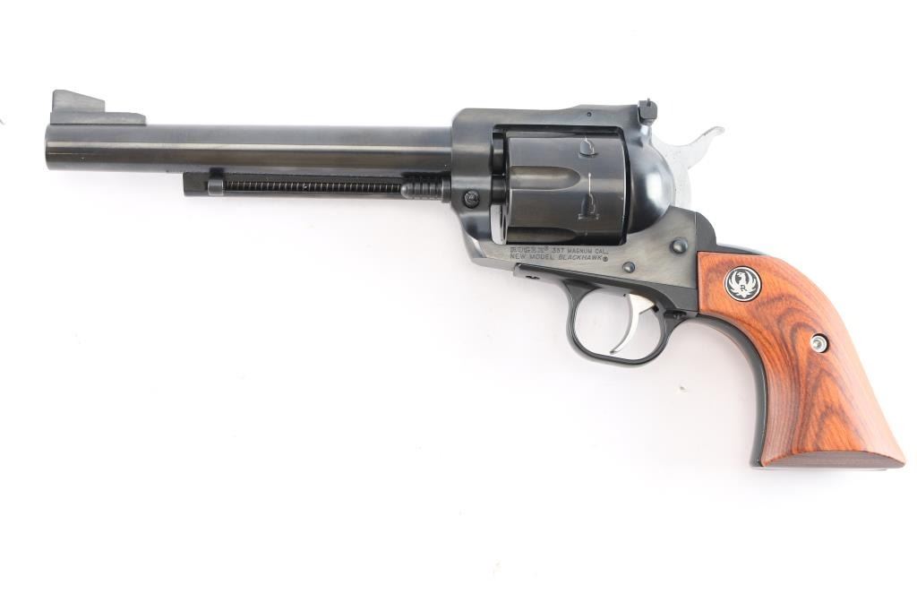 American made single-action centerfire revolver chambered for .357 Magnum, manufactured circa 2011 in Newport, NH. Revolver features a blued finish, a 6.5" round barrel, raised serrated fixed blade front sight, micrometer adjustable square notched rear sight, fluted six-round cylinder, collard cylinder pin head, round ejector rod button, two-toned hammer with serrated spur, smooth curved in-the-white trigger, smooth grip straps, transfer bar safety, aluminum trigger guard and grip straps, and two-piece smooth walnut grips with silver Ruger medallions. The original blued finish retained is approximately 98% with minimal edge wear, superficial scratches, and a drag line on the cylinder. Metal displays no rust or deformation. Bore is bright with strong rifling, and the cylinder chambers are also excellent. The action is smooth and crisp with a tight lock-up. The hardwood grips are also excellent.