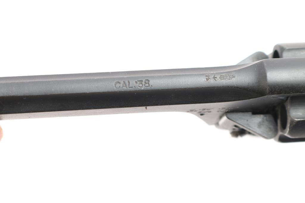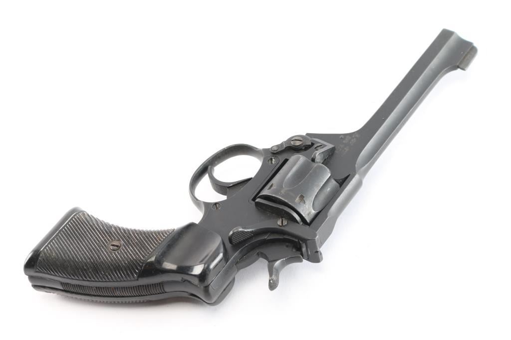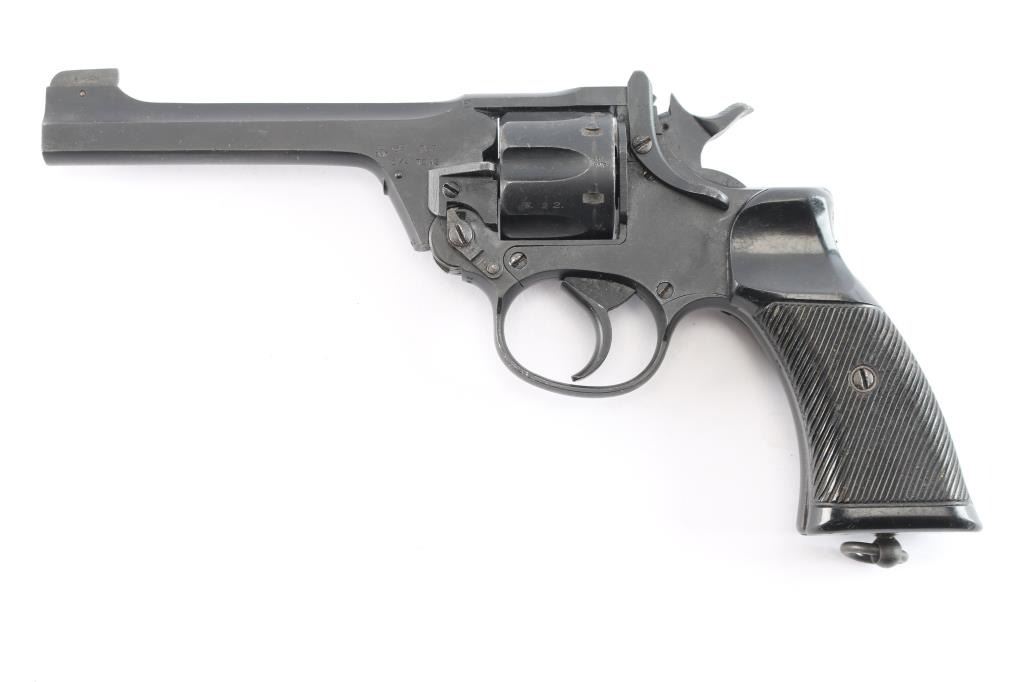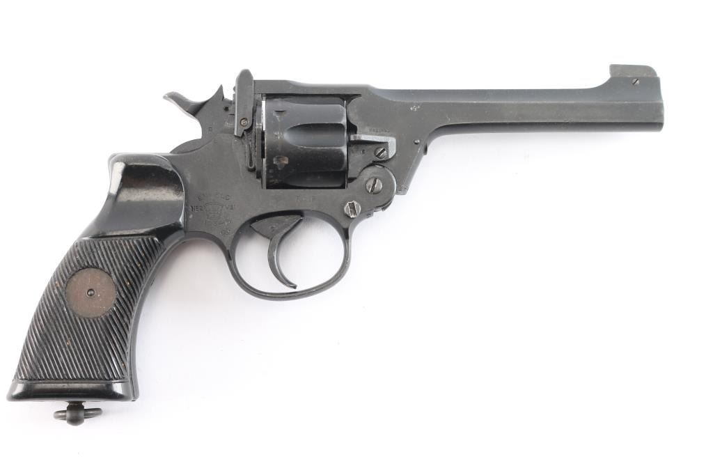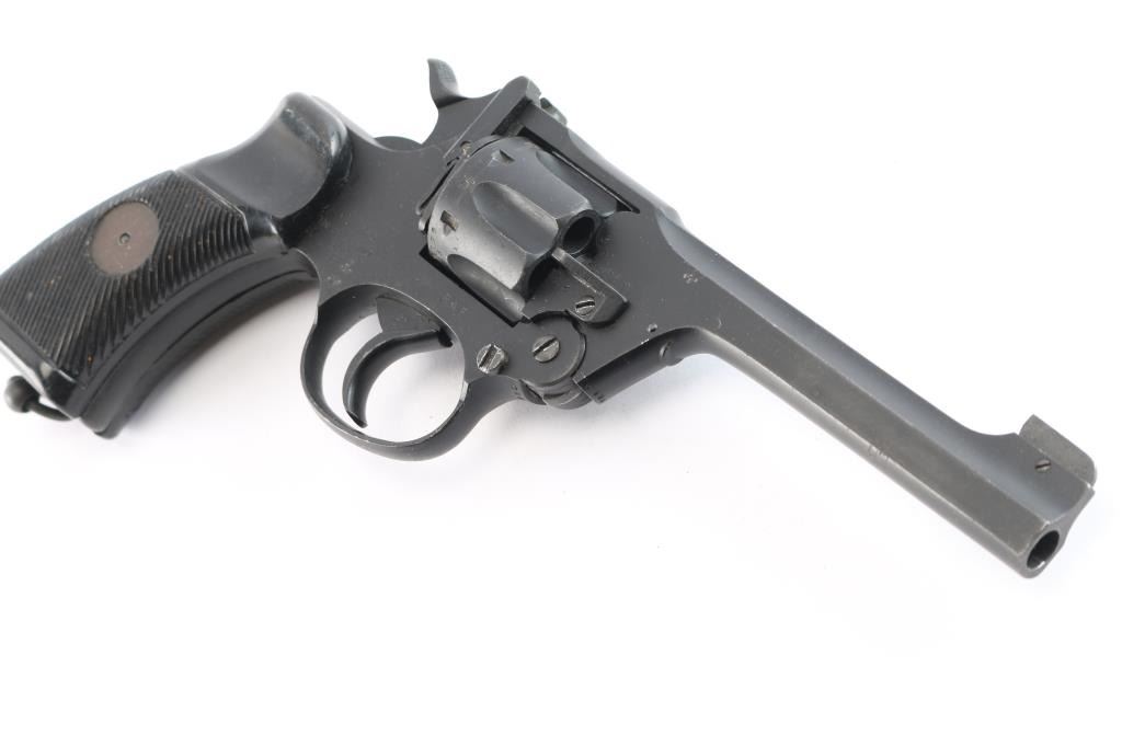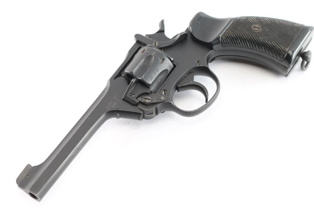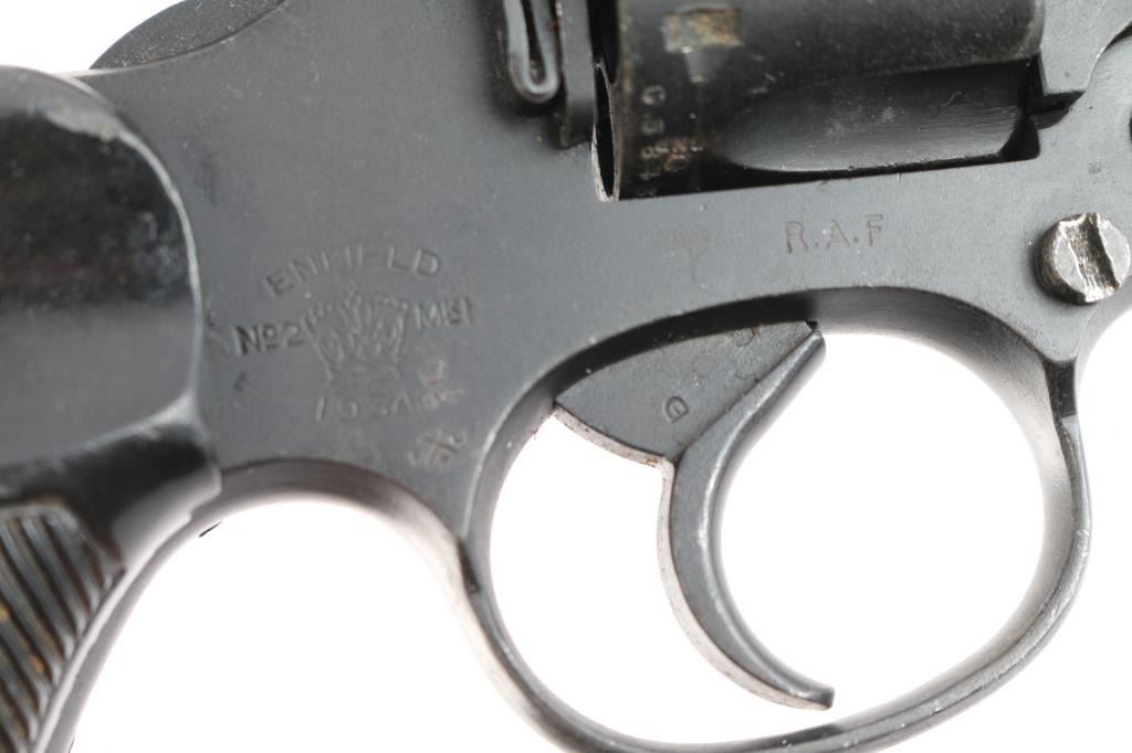WWII production British military DA/SA break barrel revolver chambered for .38 Smith & Wesson, manufactured circa 1943 in Enfield, England. Pistol features a matte blued finish, 5” slab sided barrel, raised screwed in partridge front sight, notched rear sight on the barrel latch, smooth curved trigger, automatic ejection, external hammer with checkered spur, firing pin on hammer nose, six-round fluted cylinder, smooth front strap, serrated backstrap, lanyard ring at butt, and two-piece serrated black plastic grips. Barrel, cylinder, and frame have matching serial numbers 'C5843.' The right side of the frame is marked with 'Enfield 1934,' 'No.2 MK1,' the crown, and 'R.A.F.' (the Royal Air Force). The original blued finish retained is approximately 90% with edge wear, and light scattered scratches. Metal displays no rust, but there is deformation in some of the screw slots, some heavier nicks, and the edge of the muzzle shows some deformation on the right side. Bore good showing some frosting with strong rifling, and the cylinder chambers are very good, but need to be cleaned. Plastic grips are very good condition with light scattered scratches, and small nicks on the serrations. Action is smooth and crisp with a tight lock-up.