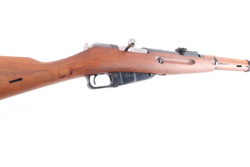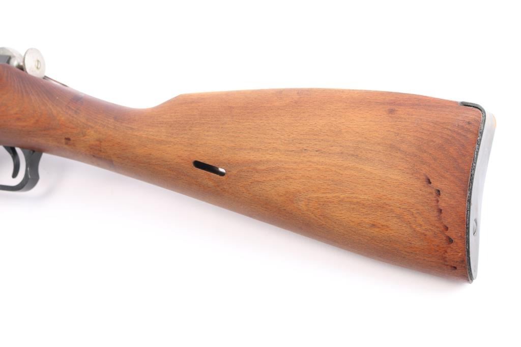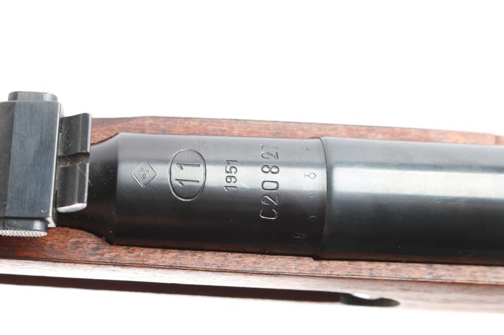 Unissued Polish KbK WZ44 Military carbine, considered the finest of all M44 carbines produced. Chambered in 7.62x54R, and imported by Intrac from Knoxville, TN. Manufactured from 1950-1955 with a total of 343,000 produced. They follow the same pattern as the Russian M44 models, with minor differences. Quality made rifle by FB Radom as represented by the circled "11" marked on receiver ring. The receiver ring also notes the manufacture date of 1951. It features a blued metal finish, an approximately 20 1/2" barrel, hooded elevation adjustable front sight, adjustable tangent rear sight graduated to 1000 meters, 5 round fixed magazine, hinged floorplate, smooth straight wood buttstock, smooth handguard, smooth metal buttplate, in-the-white bolt, provisions for side folding bayonet, smooth curved trigger, two barrel bands, sling slots in forend and buttstock. Serial numbers match on receiver ring, bolt, magazine floorplate, and buttplate. Blued metal finish remaining is approximately 97% with scratches on the left side of the magazine, and a small amount of edge wear around the trigger guard. The metal condition is generally excellent, but the buttplate and cocking piece show some rust. It appears that there is some water damage to this rifle. Wood looks very good and is unmarked from handling. The chrome lined bore is bright with strong rifling, and the action is smooth and crisp. Cleaning rod and spike bayonet removed.