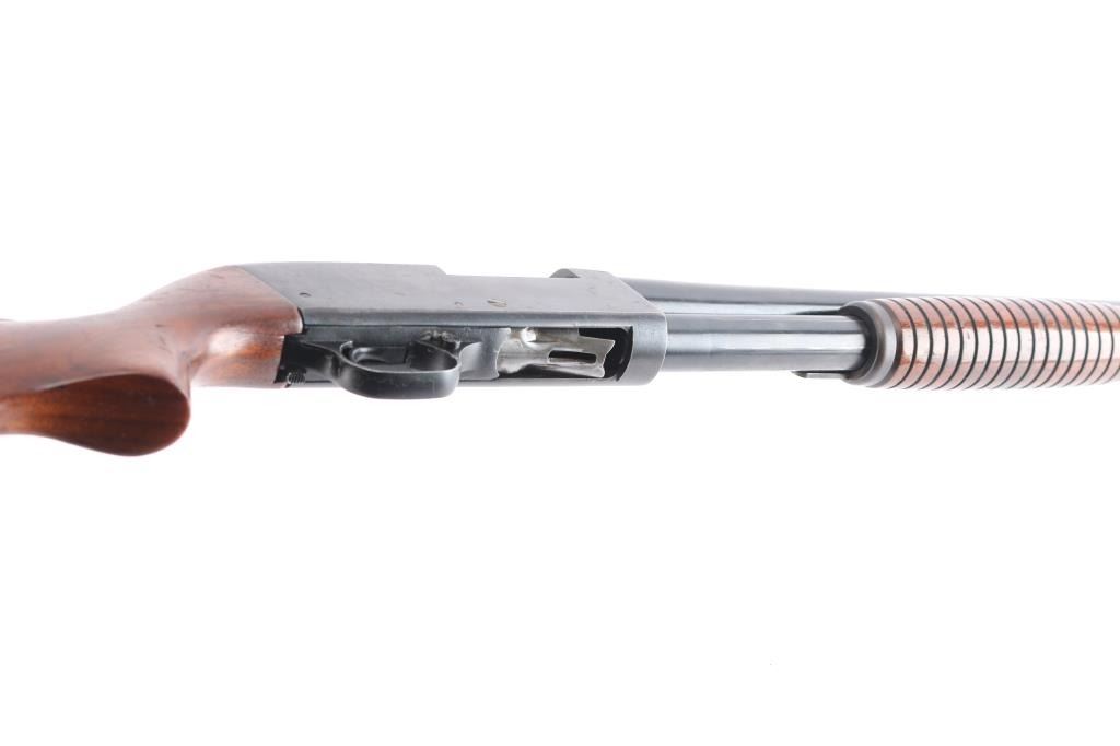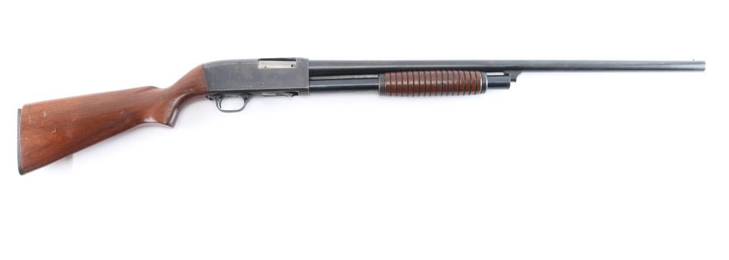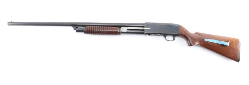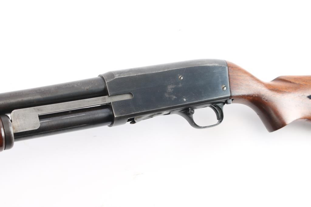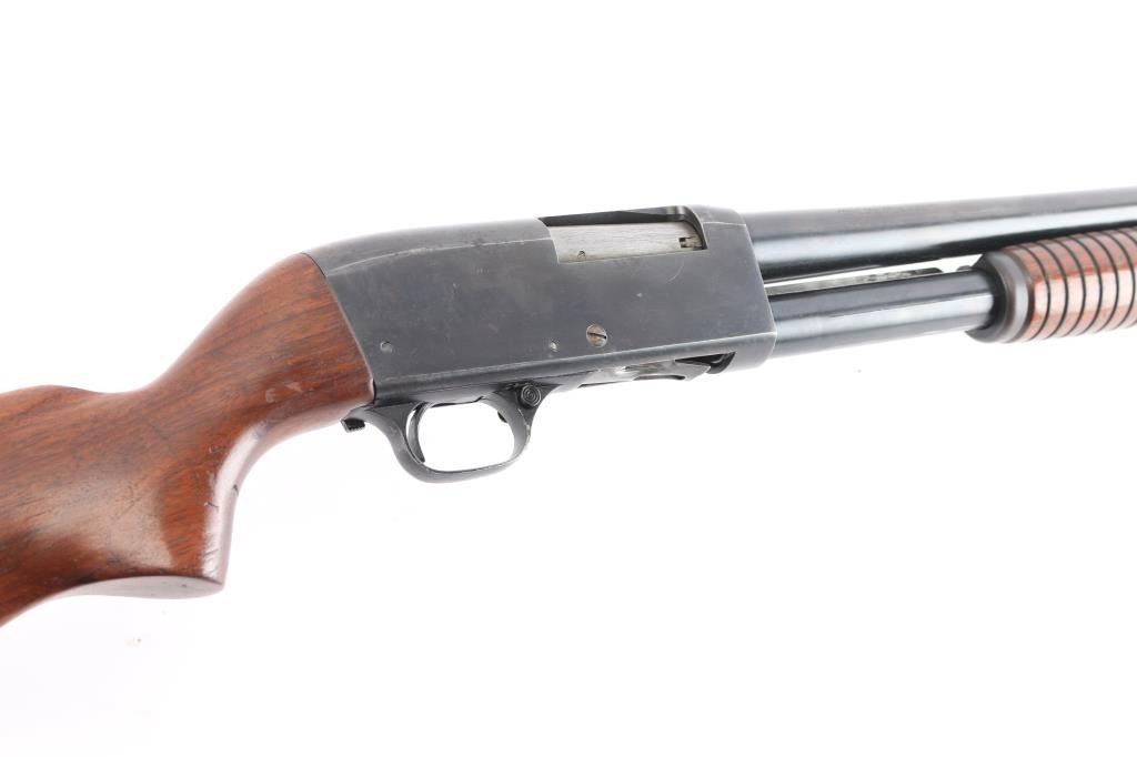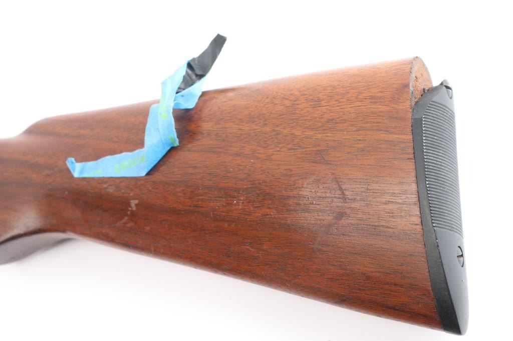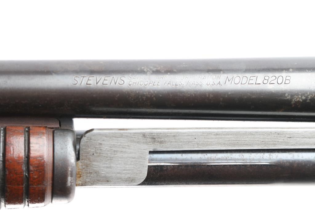 American made pump-action shotgun chambered for 2-3/4" 12 Gauge shells, and manufactured in Chicopee Falls, MA. The Stevens Model 820 was produced between 1949 and 1954. There is a circled '30B' on the chamber area of the receiver's right side suggesting that this shotgun was made in 1950. Shotgun features a blued finish, a 28" round barrel, bore measures 'Full' with a drop-in gauge, brass bead front sight, smooth curved trigger, annular cut cross-bolt manual safety at the front of the trigger guard, half length magazine tube, and serrated slide release. The refinished hardwood furniture consists of a smooth semi-pistol gripped shoulder stock, grooved corn-cob style slide handle, 14" length-of-pull, and black serrated hard rubber butt plate. The original blued finish retained is approximately 88% with light scattered scratches, edge wear, losses on top of the barrel, and wear from the slide handle. Metal displays light rust throughout, and there is a little deformation found in a screw slot. The refinished hardwood furniture is in good condition with scattered scratches and dings, general finish losses, and the butt plate is broken. The action is smooth and crisp, and the bore is bright and shiny. Shotgun includes the broken piece of butt plate.