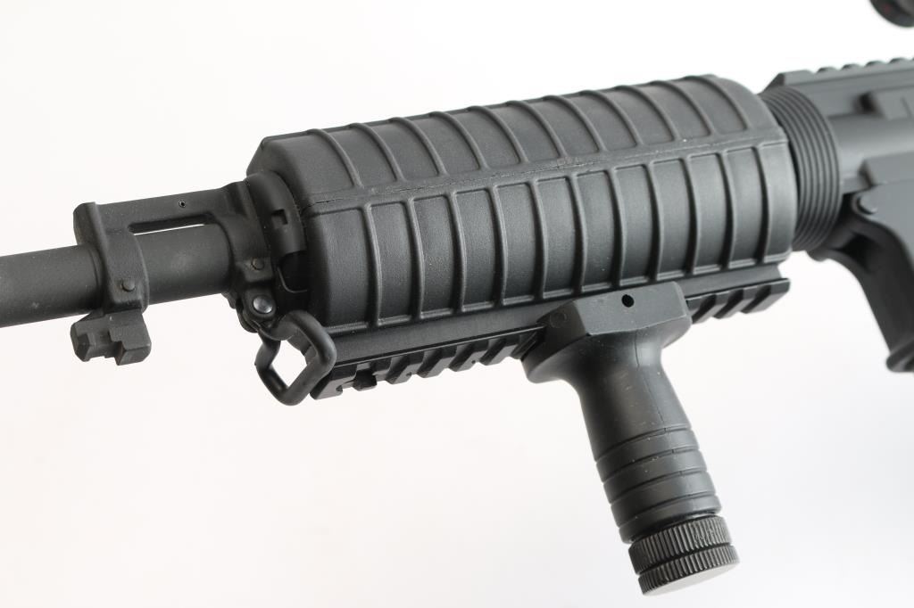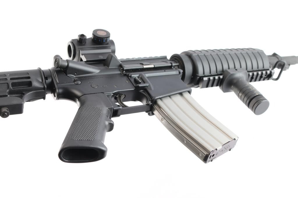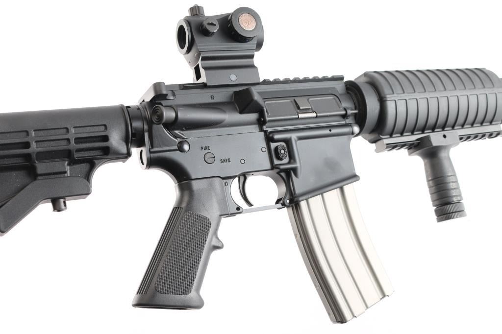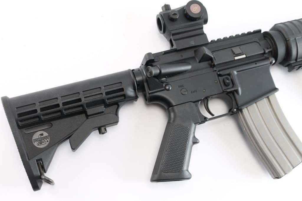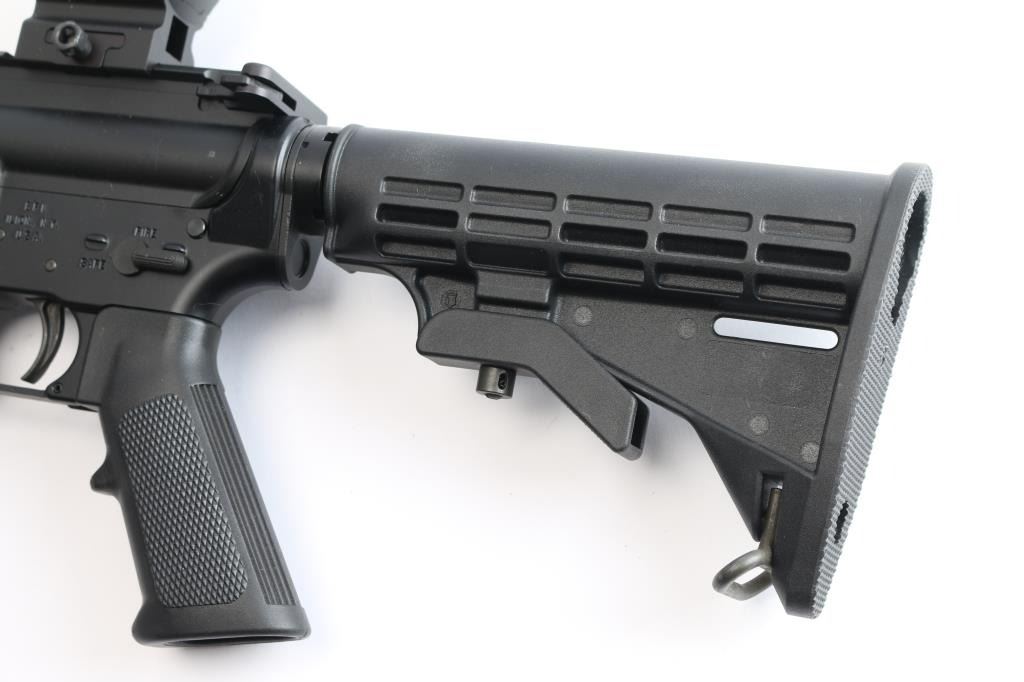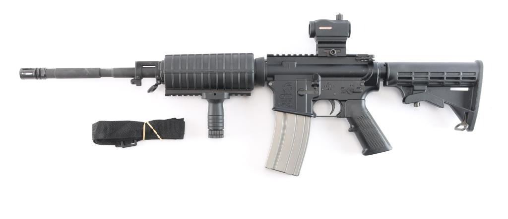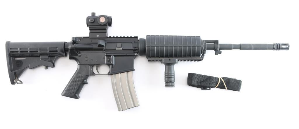 Gas operated semi-automatic AR platform modern sporting rifle chambered in 5.56x45mm NATO. Features a matte black finish, factory 16" chrome lined 1/9 twist M4 profile barrel, 18" with A2 style flash hider, carbine length gas system, A2 front sight/gas block with bayonet lug, forged flat-top upper receiver with forward assist, shell defector & dust cover, push button magazine release, manual safety, A2 style pistol grip, collapsible shoulder stock, round carbine hand guards, sling swivels. Mounted with a Truglo red-dot sight in good working order. vertical fore grip installed, comes with black nylon sling. Rifle exhibits approximately 98% of it's original finish showing a couple of minor rubs. Action is smooth, the bore is excellent, and the synthetic stocks are fine. B.F.I. 30-rd steel magazine included.