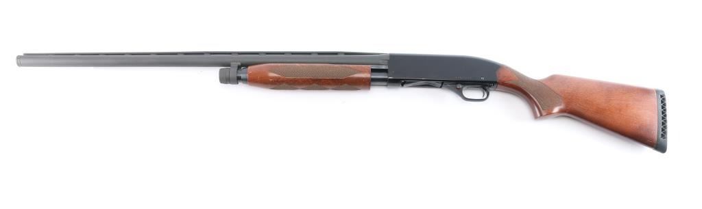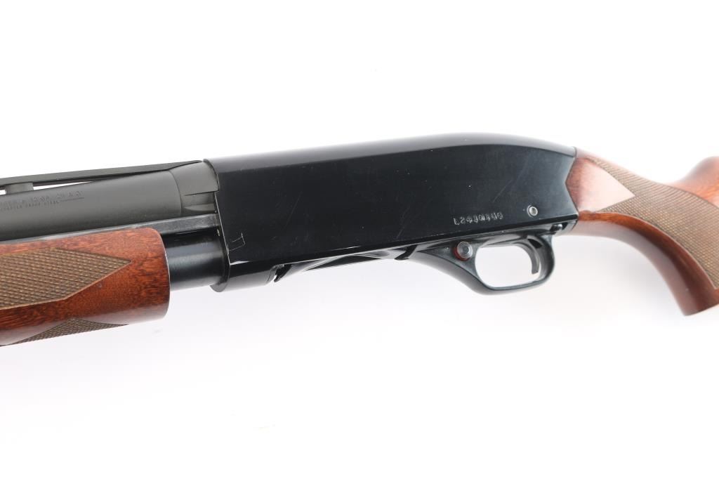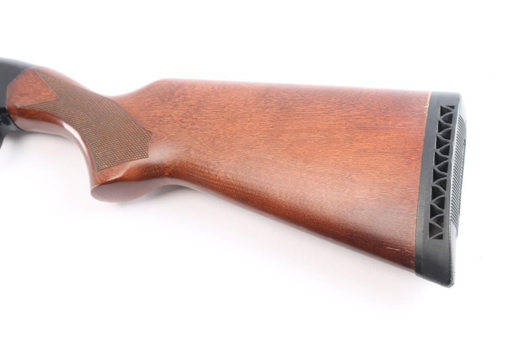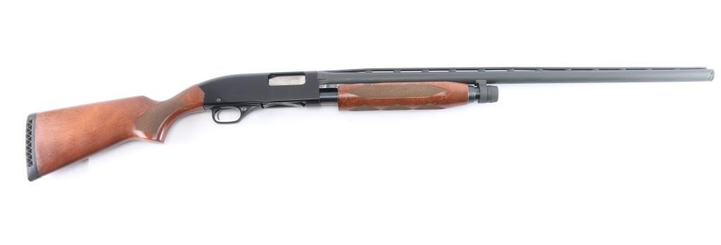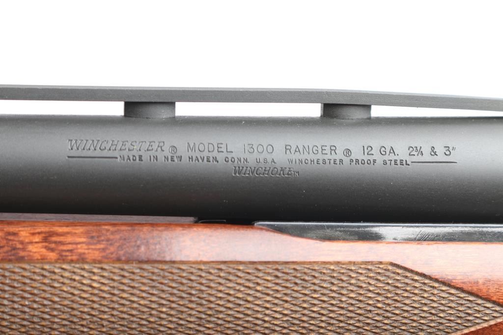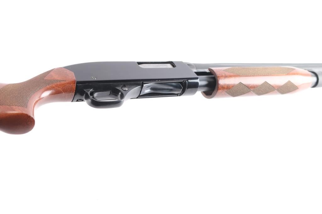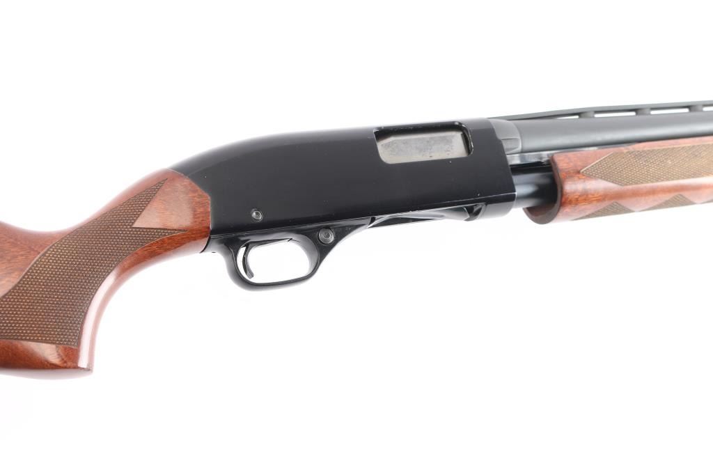 'Ranger,' an American made slide-action shotgun chambered for 3" 12 Gauge shells, and manufactured in New Haven, CT. First introduced in 1978, this shotgun features a blued finish, a 28" ventilation ribbed barrel, removable modified choke installed (bore measures 'M' with a drop-in gauge), brass bead front sight, four-round half-length tubular magazine under barrel, smooth curved trigger, aluminum trigger guard with annular cut cross-bolt safety, gloss black aluminum receiver with serrated top strap, and dual action bars. The hardwood furniture consists of a semi-pistol grip shoulder stock with checkering at the wrist, checkered slide handle, 14" length-of-pull, and black ventilated factory recoil pad with black spacer. The original black barrel finish retained is approximately 99% with superficial scratches and blemishes. The painted receiver finish is very good with edge wear, and light blemishes. Metal displays no rust, or deformation. The hardwood furniture is in excellent condition with very light scattered blemishes, and some losses at the edge of the shoulder stock and recoil pad. The action is smooth and crisp, and the bore is bright and needs to be cleaned. The barrel and magazine cap do not appear to be original parts, and the shotgun cannot be rated better than good.