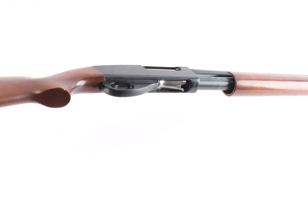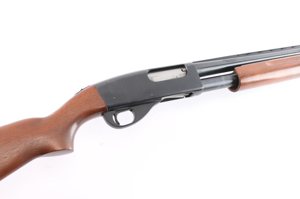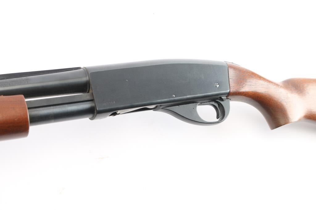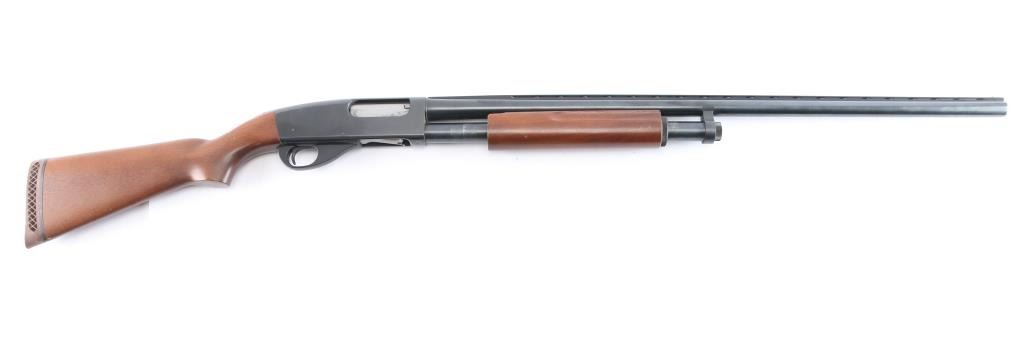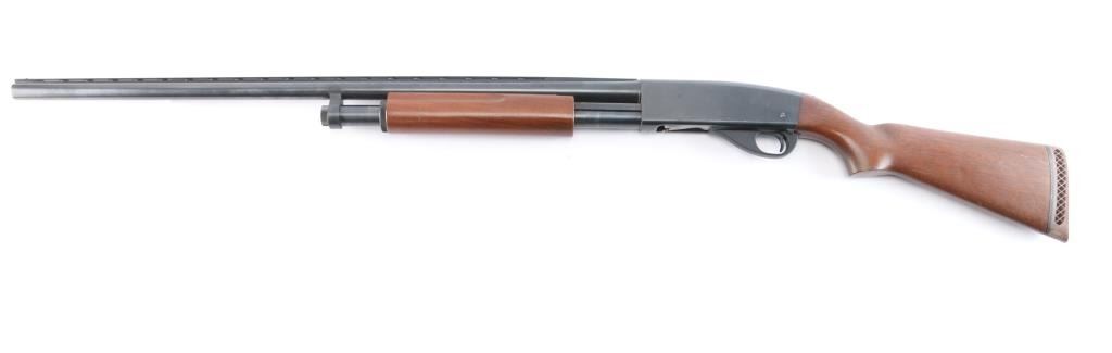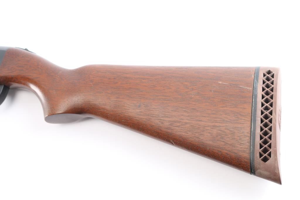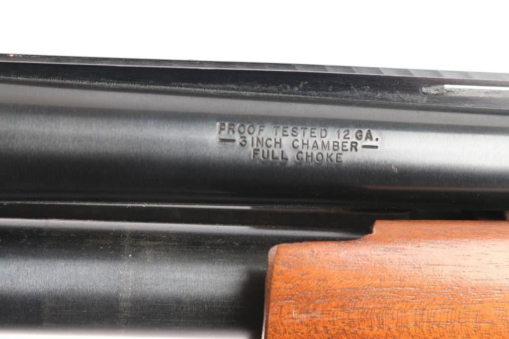 American made pump-action shotgun chambered for 3" 12 Gauge shells, and manufactured in Springfield, MA. These shotguns were produced from 1973 until 1980. Shotgun features a blued finish, a 30" ventilated ribbed barrel, bore measures 'Full' with a drop-in gauge, brass bead front sight, smooth curved trigger, serrated sliding tang safety, and serrated slide release. The hardwood furniture consists of a smooth semi-pistol gripped shoulder stock, smooth finger grooved slide handle, and a brown ventilated rubber recoil pad with a black spacer. The original blued finish retained is approximately 95% with light scattered scratches, very light edge wear, and wear from the slide handle. Metal displays no rust, but there are some light dings on the ventilation rib. The hardwood furniture is in very good condition with light scratches, and scattered dings. The action is smooth and crisp, and the bore is bright and shiny.