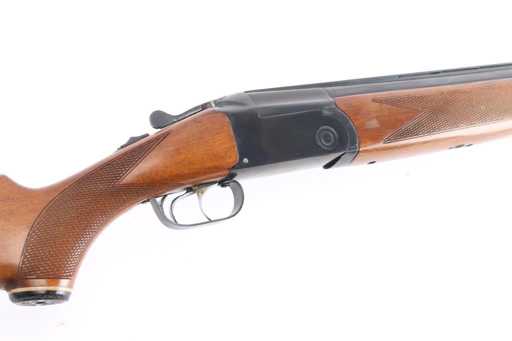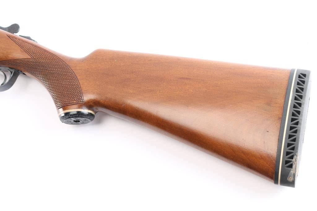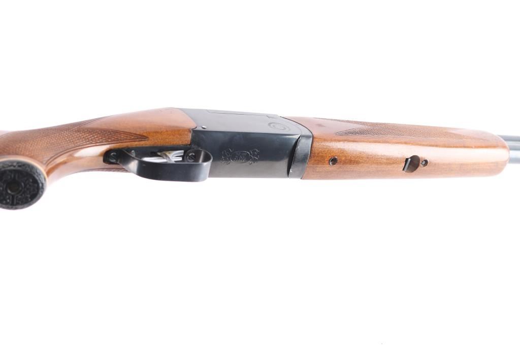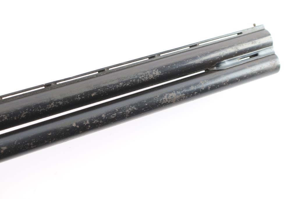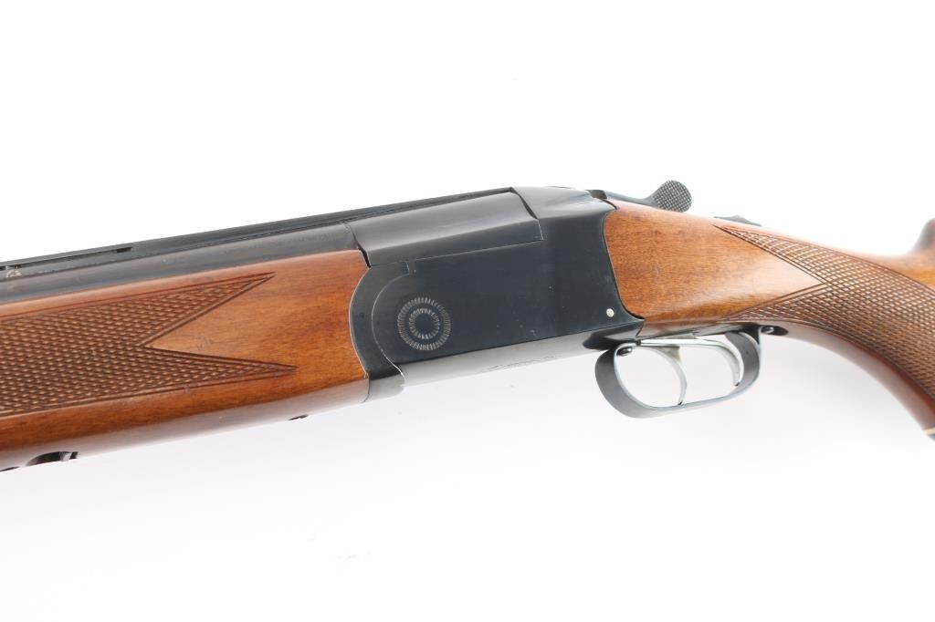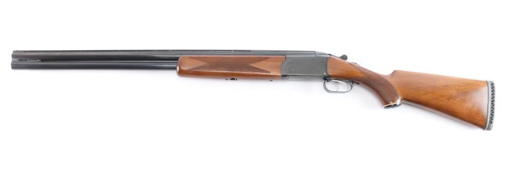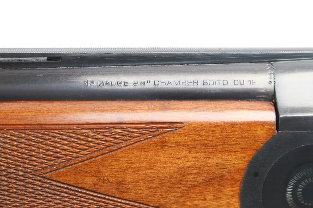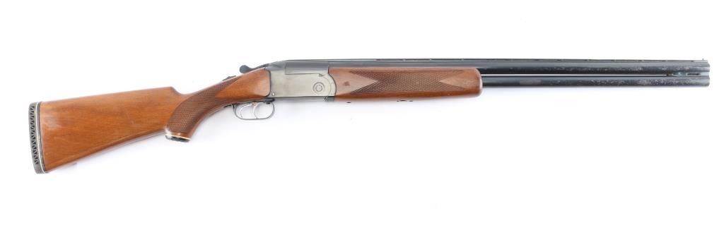 Brazilian made over and under box-lock shotgun chambered for 2-3/4" 12 gauge shells. Imported by K Mart Corp out of Troy, MI. Shotgun features a blued finish, 28" vent ribbed barrels, top bore measures 'M' and the bottom measures 'IC' with a drop-in gauge, brass bead front sight, extractor, smooth curved double triggers, checkered action lever, steel triggerguard and action lever, and serrated sliding tang safety. The hardwood furniture consists of a semi-pistol grip shoulder stock with checkering at the wrist, checkered forend with a lever release, floral embossed black grip cap with white spacer, 15-1/4" length-of-pull to the front trigger, and Pachmayr black ventilated rubber recoil pad with white and black spacers. Receiver is engraved with double circles on both sides, and "BOITC MADE IN BRAZIL" in floral scrolls on the bottom. The original blued finish retained is approximately 95% with light scattered scratches, and handling blemishes. Metal displays scattered rust along the barrel, but no observed deformation. The hardwood furniture is in good condition with scattered light blemishes, and a hairline crack on the right side of the shoulder stock by the action lever. The action is smooth and crisp, and the bores are in very good condition but are dirty.