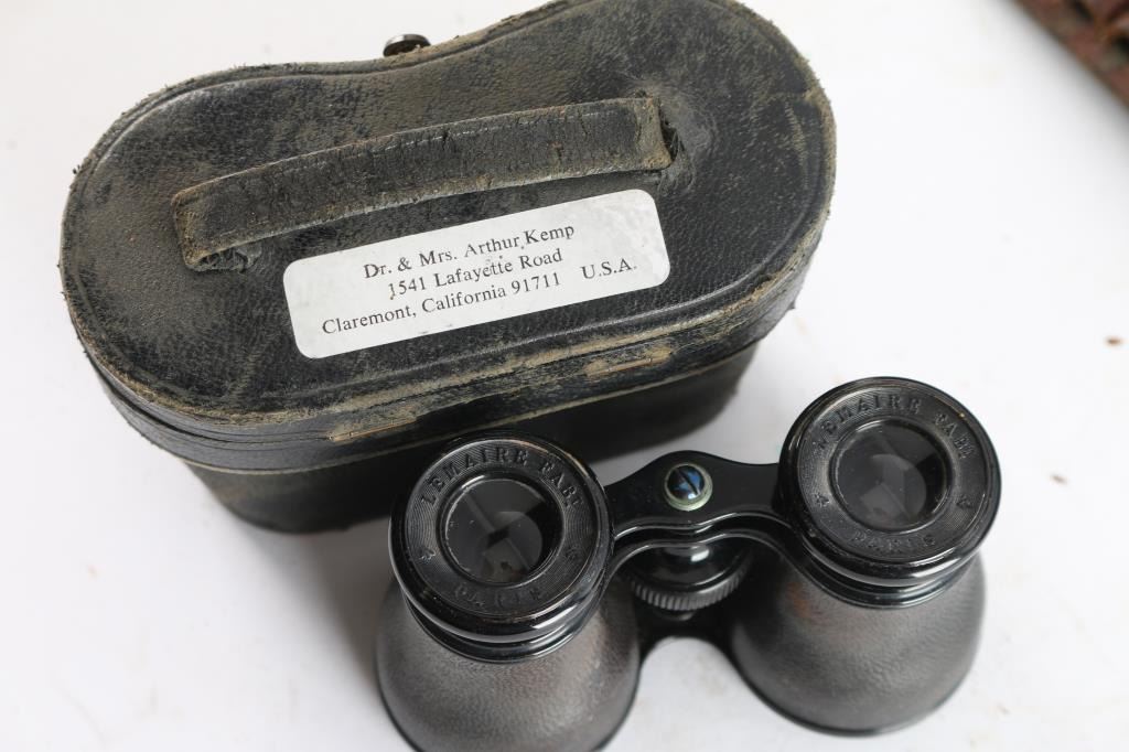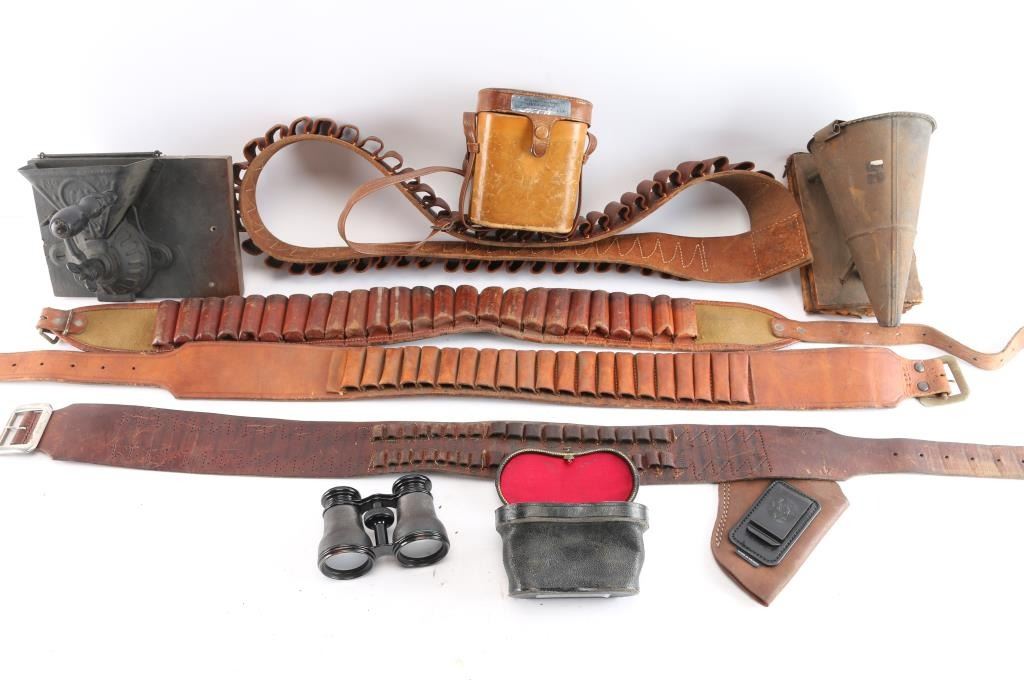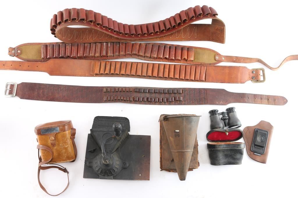 Includes: 4 - leather bandoleers for Shotgun and rifle caliber rounds; 2 - binocular leather cases, one w/ a pair of Lemaire Fabt binoculars. Has a clear lens and in good condition; 1 - beekeeping smoker w/damaged diaphragm and 1 - Parker laundry tool/press.