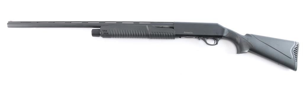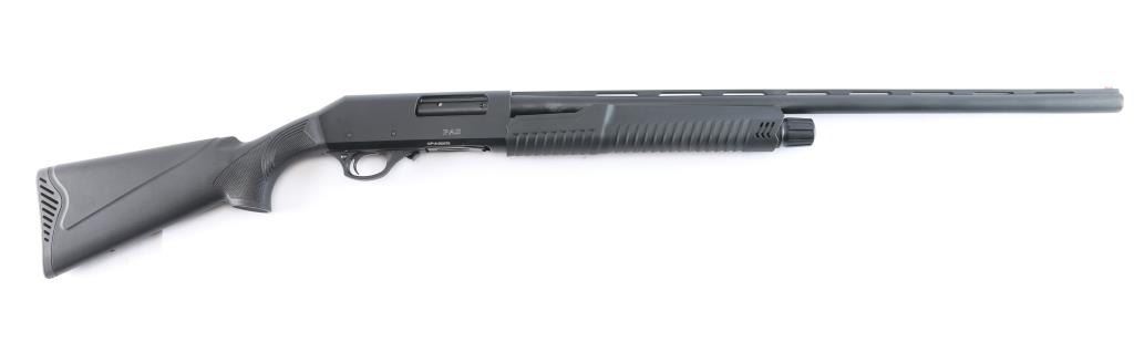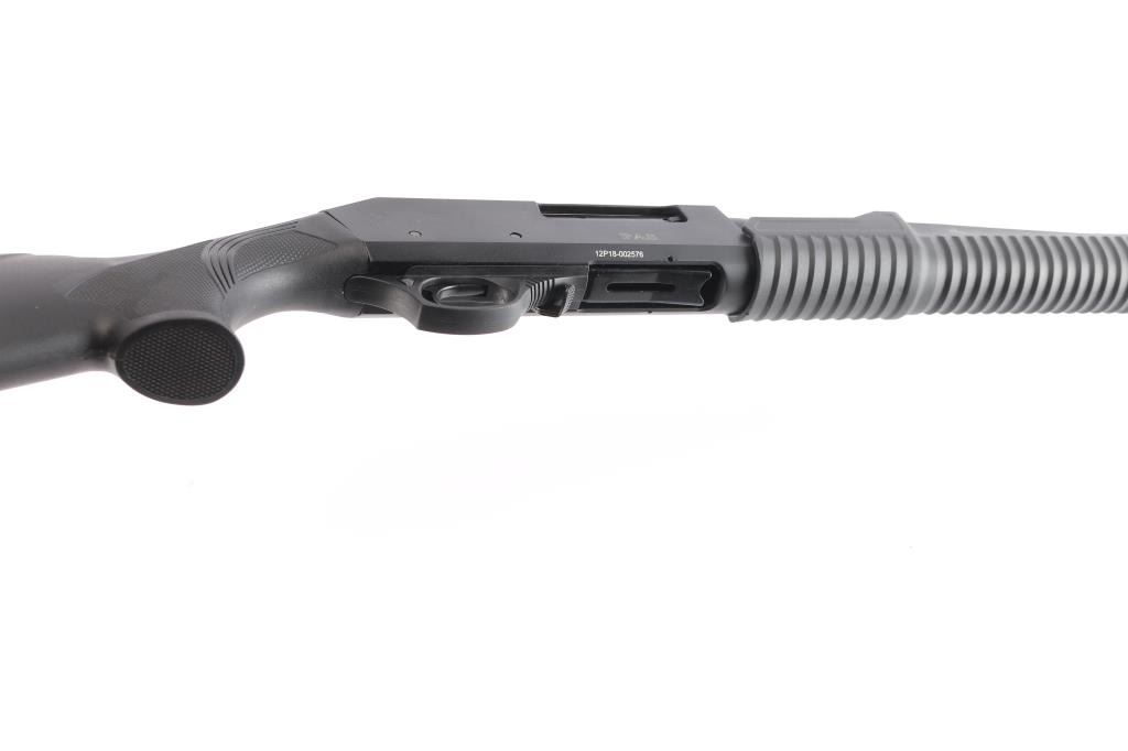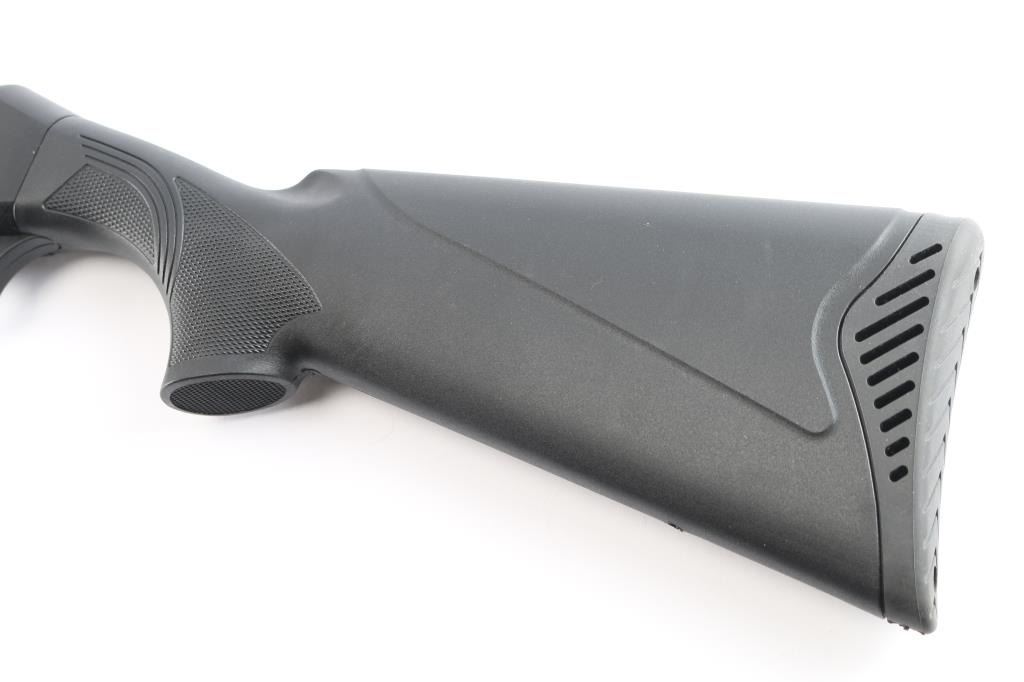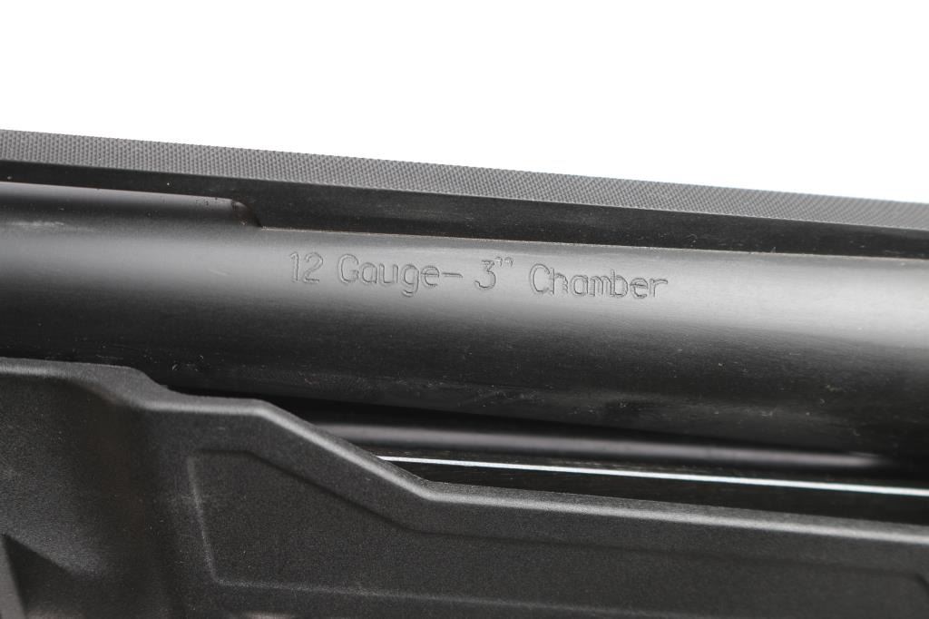 Turkish made pump-action shotgun chambered for 3" 12 Gauge shells, and imported by UTAS-USA out of Des Plaines, IL. Shotgun features a matte black finish, a 28" ventilated ribbed barrel, accepts choke tubes, bore measures 'Full' with choke tube installed (using a drop-in gauge), red fiber optic front sight, smooth curved trigger, triangular shaped cross-bolt manual safety mounted at the rear of the trigger guard, checkered slide release in front of the trigger guard, fluted magazine cap, and four-round half length magazine tube. The black synthetic furniture consists of a semi-pistol gripped shoulder stock with checkering at the wrist, checkering on the bottom of the grip, 14-1/4" length-of-pull, serrated slide handle, and black ventilated rubber recoil pad. The original matte black finish retained is approximately 99% with a light scratch on the top of the receiver. Metal displays no rust, or deformation. The synthetic furniture is in excellent condition with nothing remarkable. The action is smooth and crisp, and the bore is bright and shiny.
