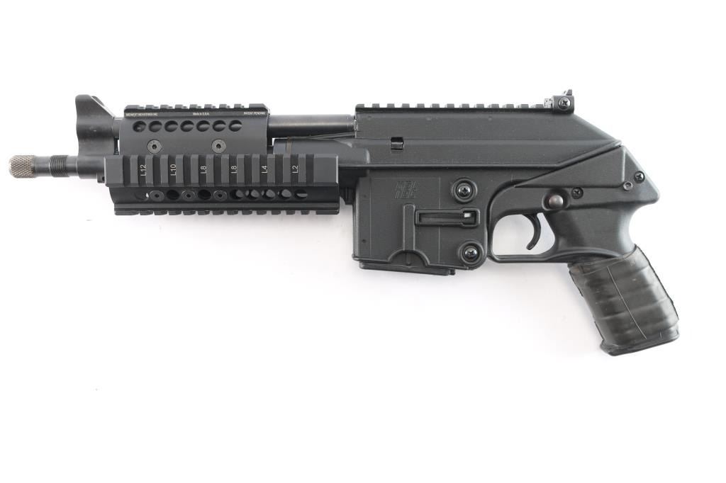 Semi automatic gas operated pistol chambered in 5.56mm. Features a 9.2" threaded barrel, high-impact, light weight Zytel polymer frame with full length rail, matte black finish, A2 type adjustable front sight, square notch rear. Midwest 4 quad rail handguard, 6061 hardcoat anodized aluminum, mil-spec 1913 rails with T-marks, push button safety, one factory 10-rd magazine. The bore is excellent/bright, action is smooth and the finish is overall excellent.