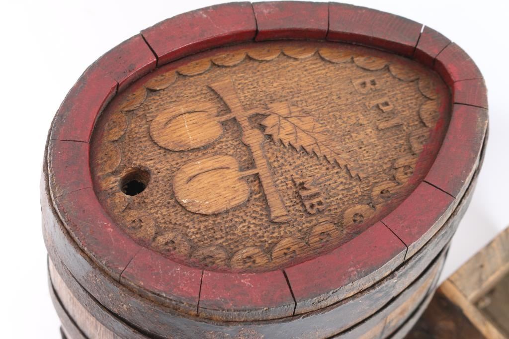 Vintage hand carved wooden wine keg, made of oak or hardwood staves, held together by iron or metal hoop straps. Has "BPI, MB and grapes on a vine" on top w/ red colored rim to signify type of spirits or by certain commercial breweries for ID. Stands 12" tall and 9" at the longest diameter. Comes with letter. Also included is a wooden small arms ammunition crate from American Eagle. 15 1/2" X 6"W X 5 1/2" tall.