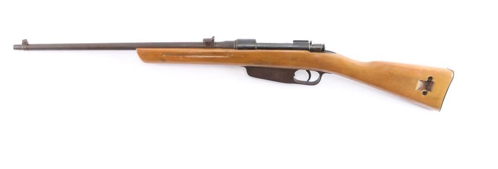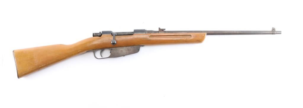 Stock has been sporterized. WW 2 Italian military carbine dated 1939. Features approx 21" barrel, no bayonet lug, fixed sights, side mounted sling swivels, butt trap, bent bolt handle, manual safety, Mannlicher type action uses en-bloc clips (clips not included). Stock's forearm has been shortened with front band/bayonet lug removed, stock has been refinished. Bore is dark/rough, rifling present. Most of the blue has turned a gray color with scattered light patina. rear sling swivel removed. Markings include "Terni", "(crown) RE", "1940 - XVII". No import marks observed.
