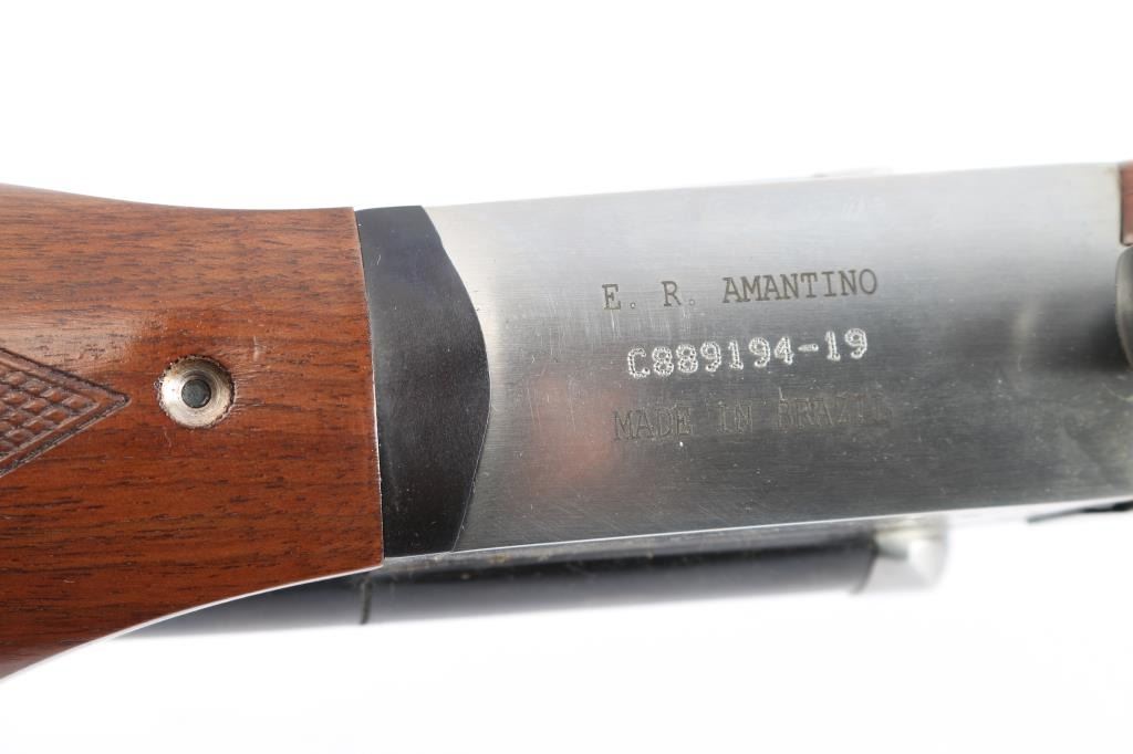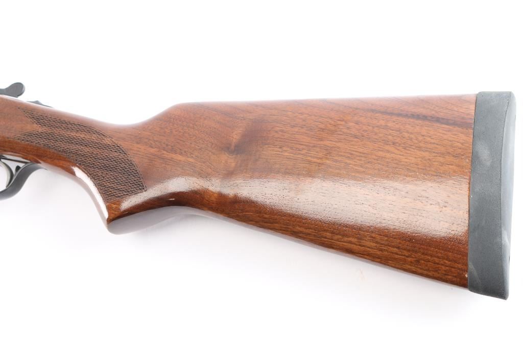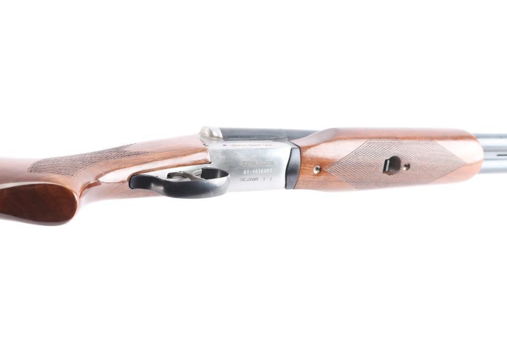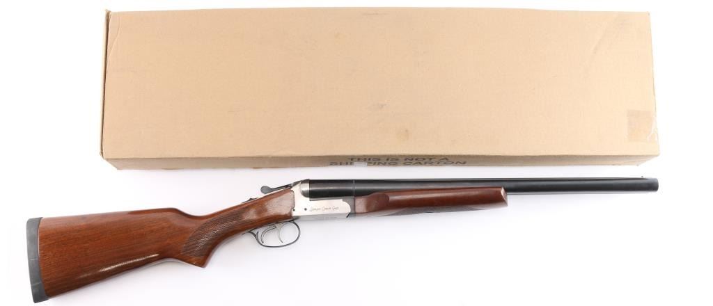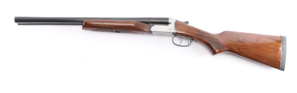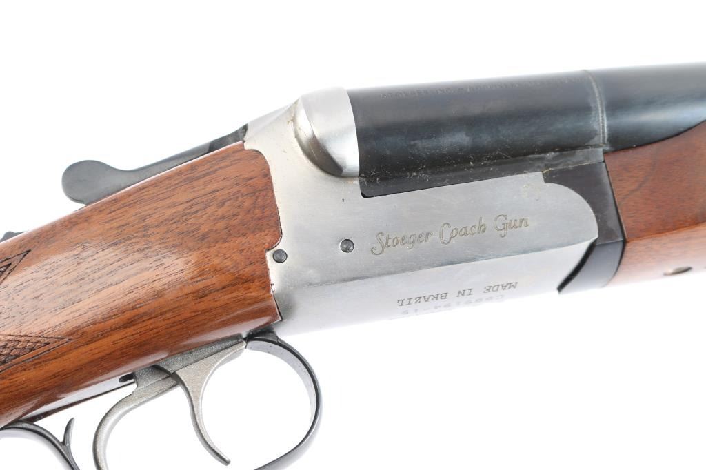 SN: C889194-19. "Uplander Coachgun" Double barreled side-by-side shotgun made in Brazil by E.R. Amantino (also known as Boito), imported by Stoeger. Features box lock, blued finish with stainless receiver, 20" barrels with screw in chokes, Mod-R.-r, IC-L installed. low serrated rib, brass bead front sight, double triggers, knurled top lever, sliding tang safety, single extractor, checkered walnut beavertail forend, checkered walnut semi-pistol grip shoulder stock, black solid rubber recoil pad. Accepts 3" shells. LOP is 14.1/2" to front trigger. Barrels numbered to receiver. Bores are excellent/bright. Retains 99% finish. Wood is excellent. Comes in original plastic factory box in cardboard sleeve with matching label, manual and choke wrench.