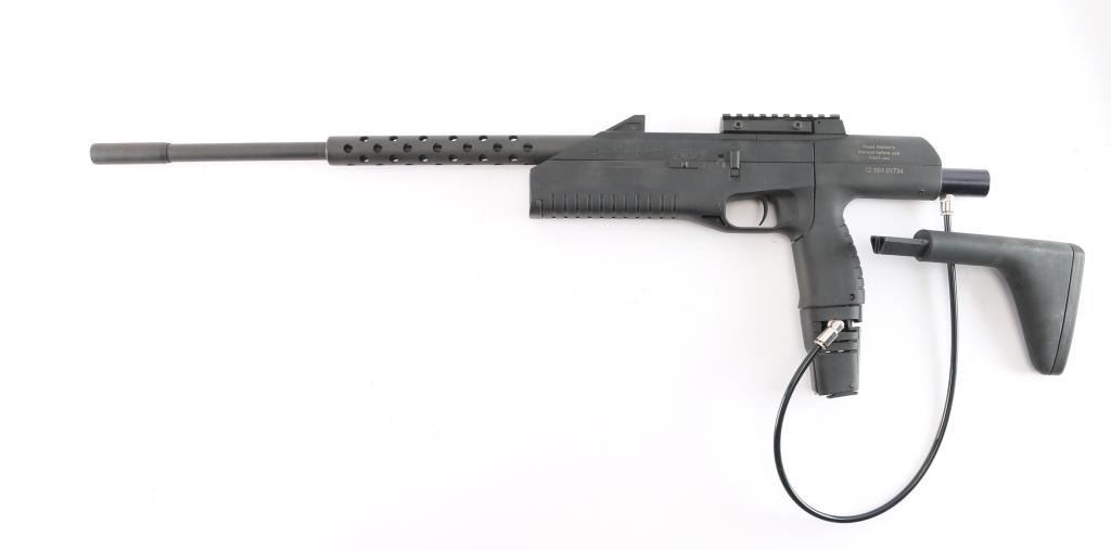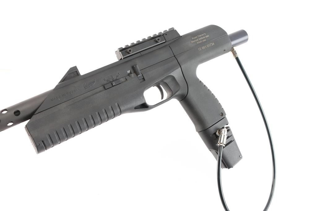 The Baikal MP-661K Drozd Blackbird is a unique, Russian-made CO2 air pistol and submachine gun known for its electronic trigger and select-fire capabilities. Discontinued & rare. It is widely regarded as one of the most powerful and fun BB guns due to its ability to fire in bursts of 1, 3, or 6 rounds at variable rates. Typically ranges from 330 to 500 feet per second (fps). Select-Fire Modes: Three firing modes: semi-auto, full auto 3-round burst, and 6-round burst. Adjustable cadence of 300, 450, or 600 rounds per minute. Features a rifled steel barrel and a durable weapons-grade polymer body, ambidextrous selector, ported barrel shroud, muzzle break. Excellent, like new condition. Comes in factory box with shorter 7 1/4" barrel, BB's and shoulder stock.