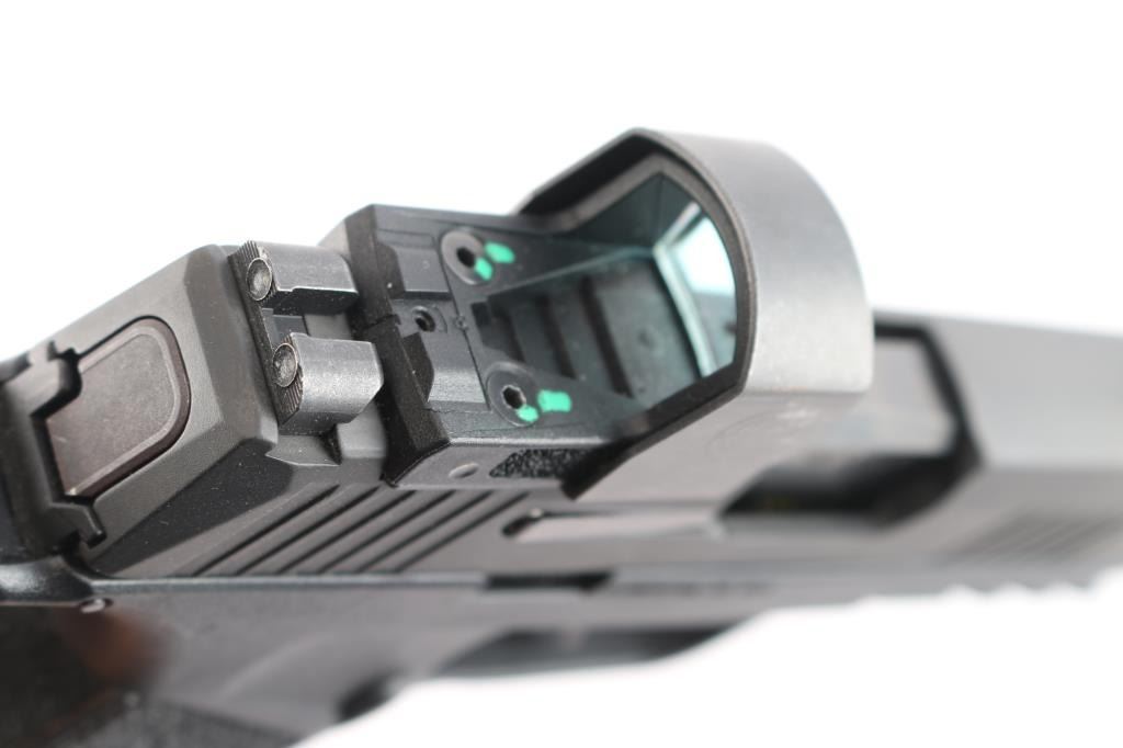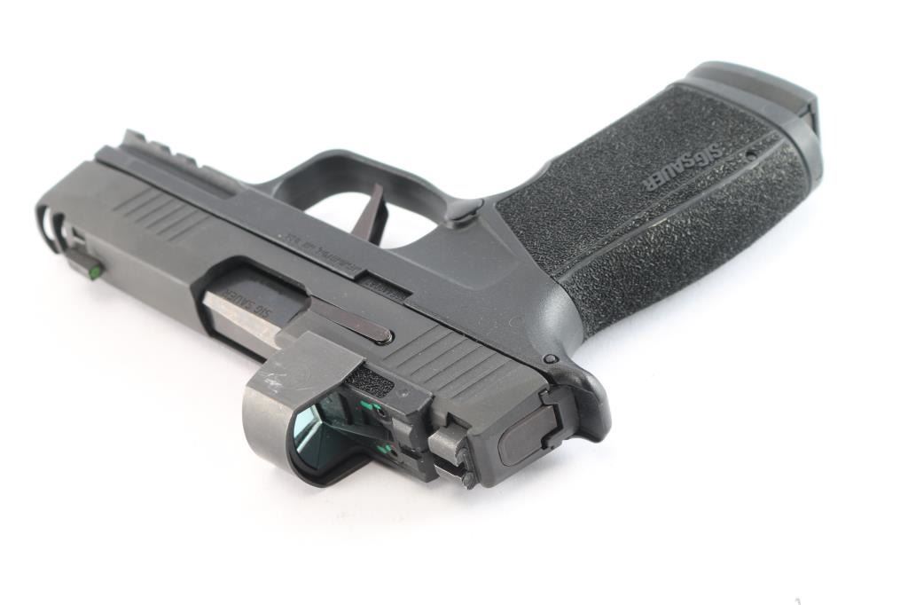 Modular American made striker-fired semi-automatic compact pistol chambered in 9x19mm, manufactured in Newington, NH. This is one of the newer offerings from Sig Sauer. Pistol features a black Nitron finished stainless steel ported slide, 3.7” carbon steel barrel, front and rear slide cocking serrations, optics cut slide with 'Romeo 0' red dot optic installed, tritium dovetailed Sig H3 AU sights (AKA X-RAY3 sights, glows brightly), 'X' flat-faced signature trigger, serrated push-button magazine release, full-length metal guide rod with flat recoil spring, seventeen-round magazines with orange high visibility followers, picatinny accessory rail on dust cover, undercut trigger guard, flared magazine well, interchangeable backstrap, and stippled black polymer XMacro grip module. Pistol retains approximately 99% of its original black Nitron finish showing little to no visible wear. Metal displays no rust, or deformation. The action is smooth and crisp, and the bore is bright with strong rifling. The polymer grip module is also excellent. The 'Romeo 0' optic works well, but shows light scattered scratches, and a blemish on the right side. Pistol includes the original factory hard case, and two factory seventeen-round magazines.